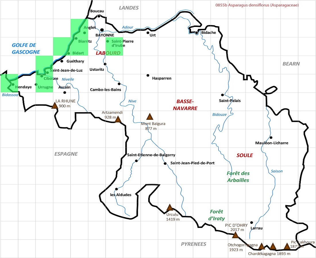 G – 1-2 m – Tige ± ligneuse grimpante, cladodes de L ≃ 2,5 cm linéaires-aigus serrés, persistants – Grappes axillaires denses de petites fleurs blanches à 6 tépales – Petite baie rouge