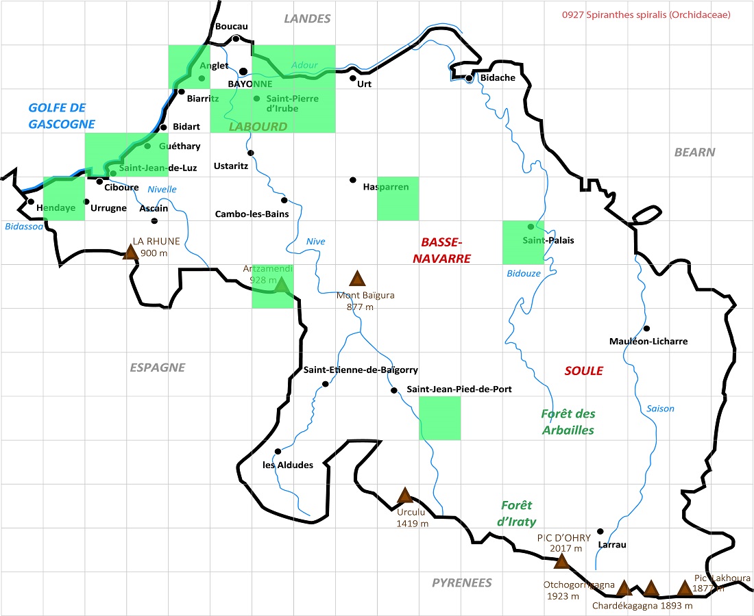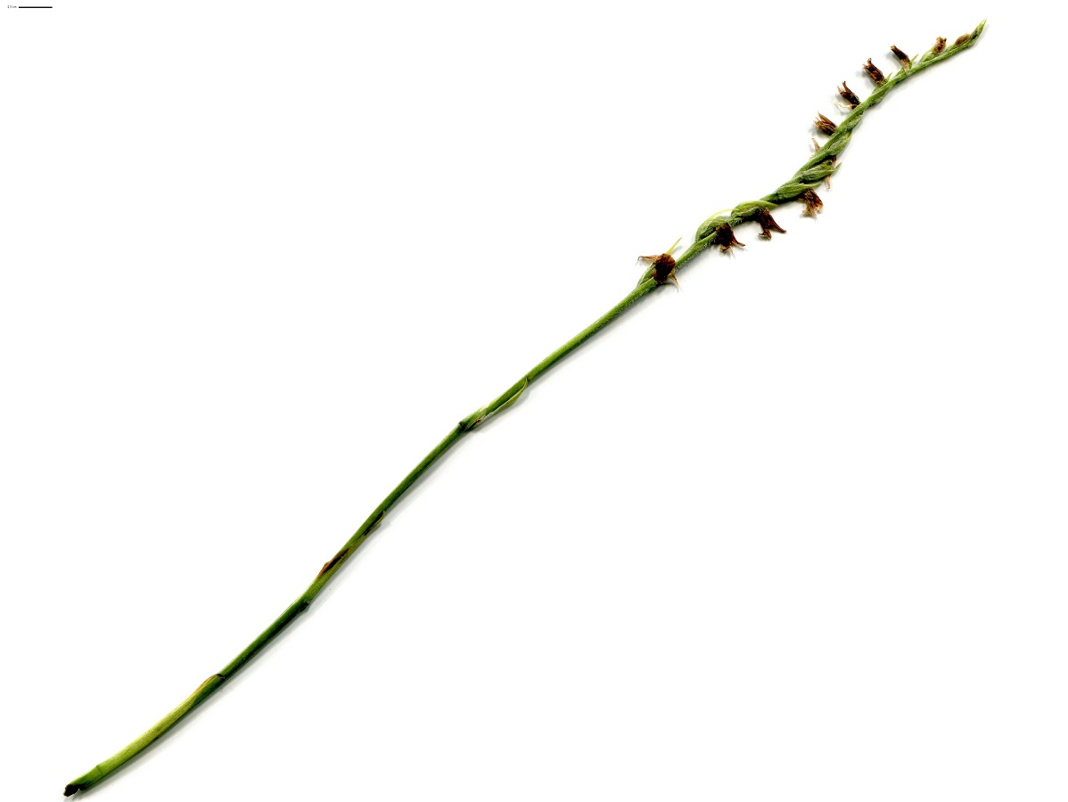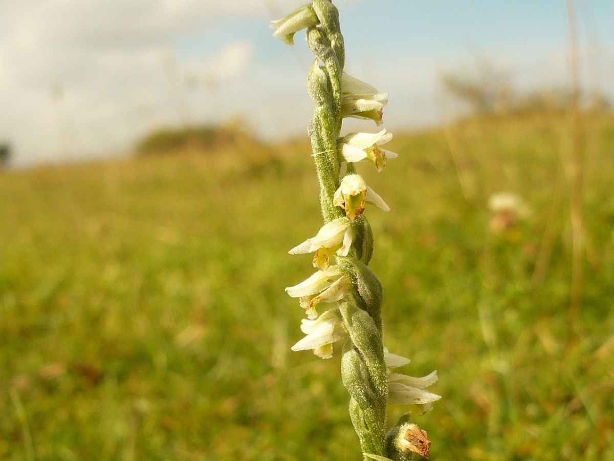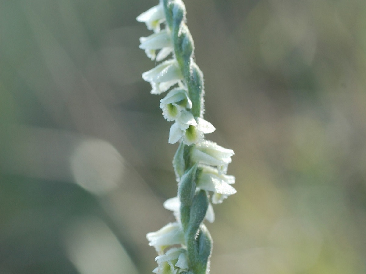 G à tubercule – 1-2,5 dm – Rosette fugace de feuilles elliptiques, les > appliquées – Épi spiralé sur 1 rang de fleurs L de 6-7 mm blanchâtres à gorge verdâtre, labelle entier, sans éperon
