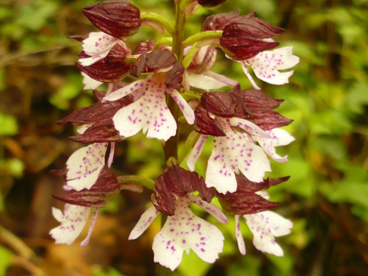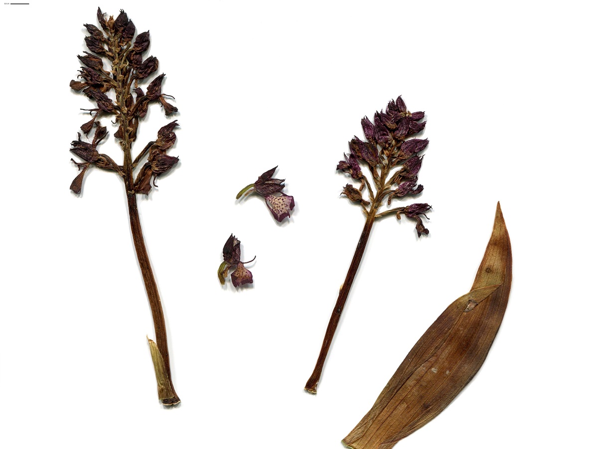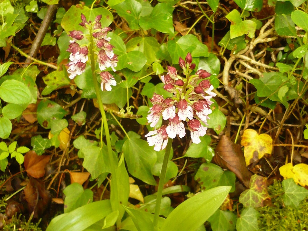 G à tubercule – 3-8 dm – Feuilles ovales – Fleurs à labelle L de 10-15 mm blanc ponctué de pourpre, à 2 lobes latéraux étroits, le médian large bifide, tépales en casque pourpre foncé