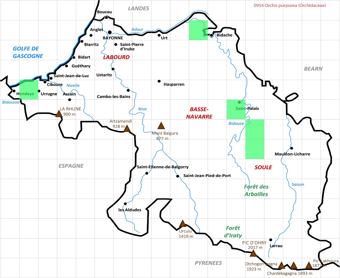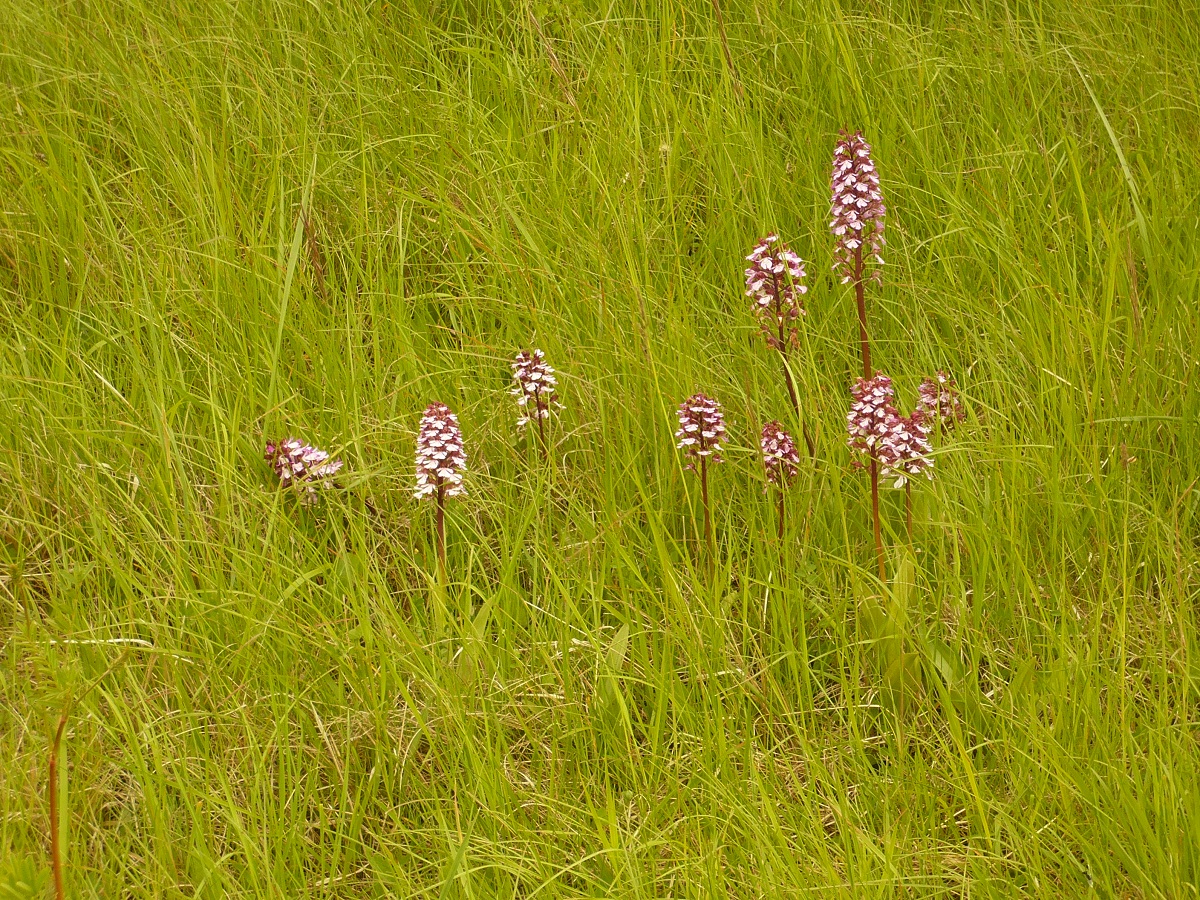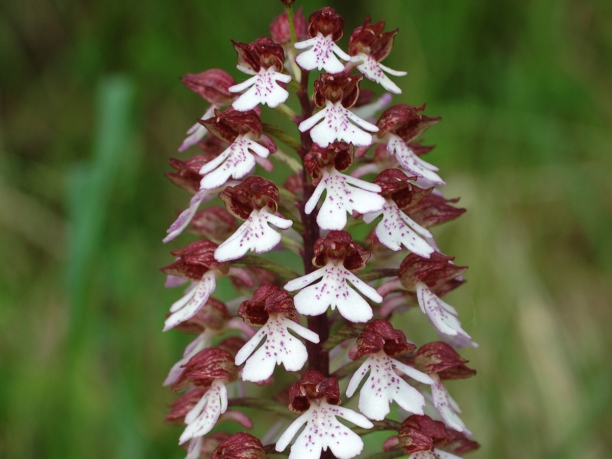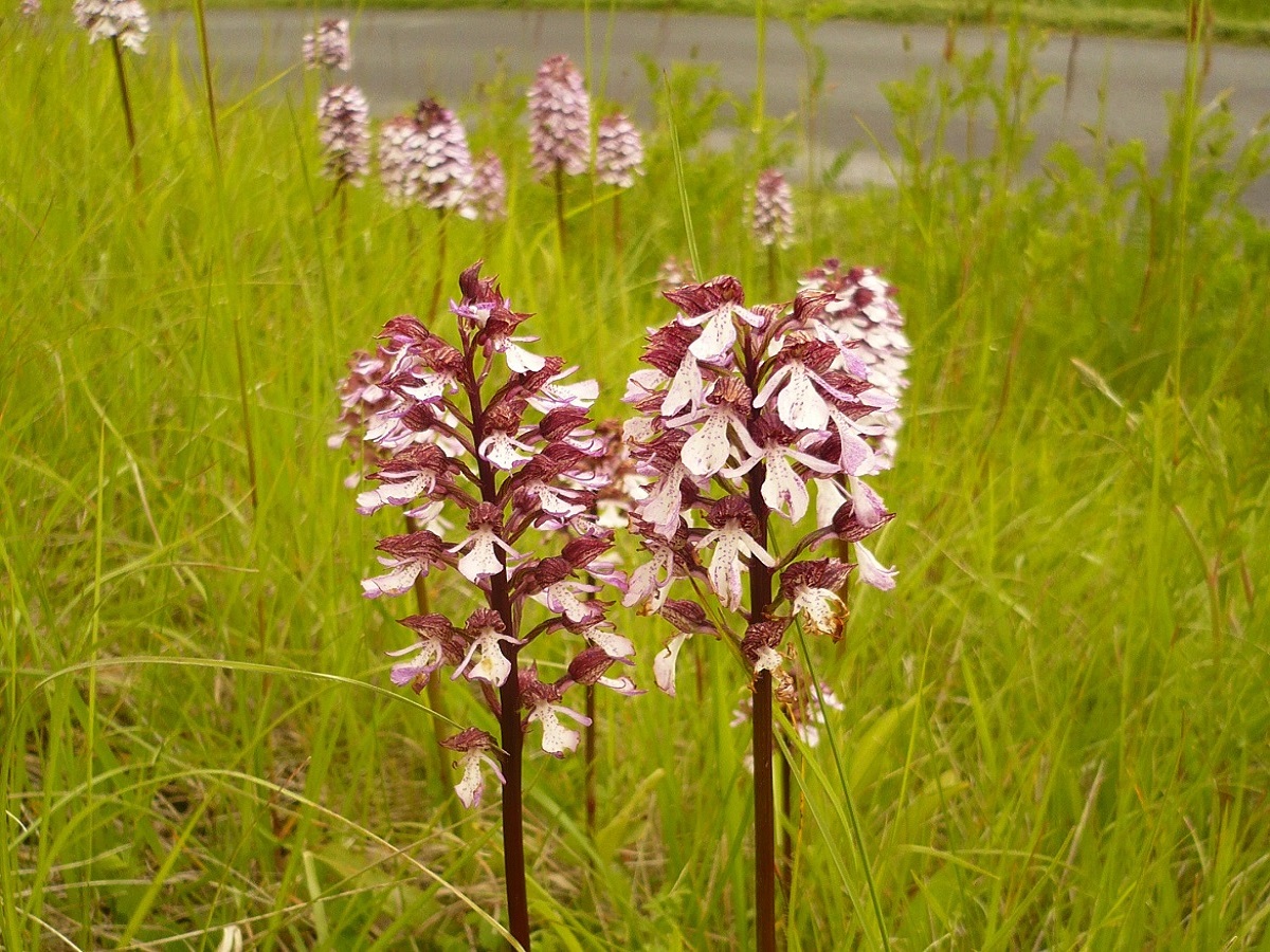 G à tubercule – 3-8 dm – Feuilles ovales – Fleurs à labelle L de 10-15 mm blanc ponctué de pourpre, à 2 lobes latéraux étroits, le médian large bifide, tépales en casque pourpre foncé