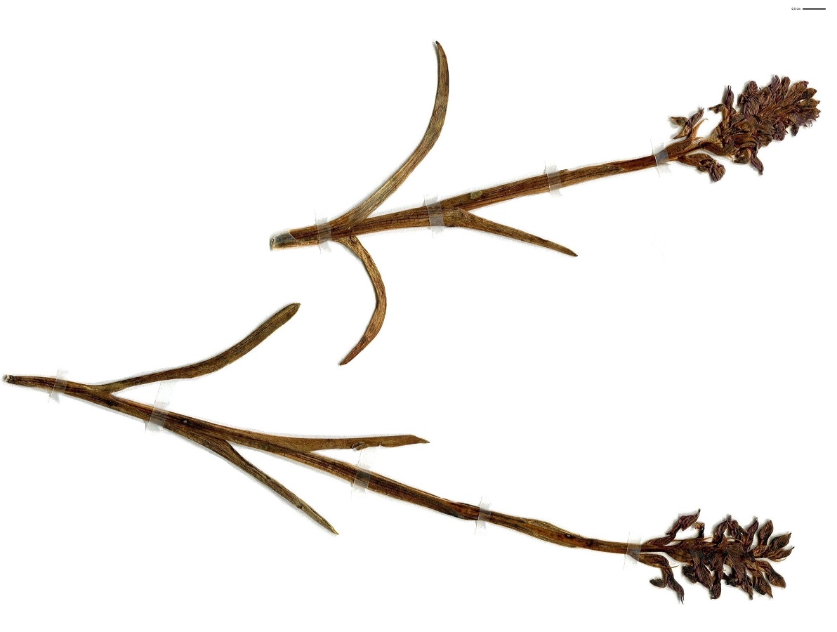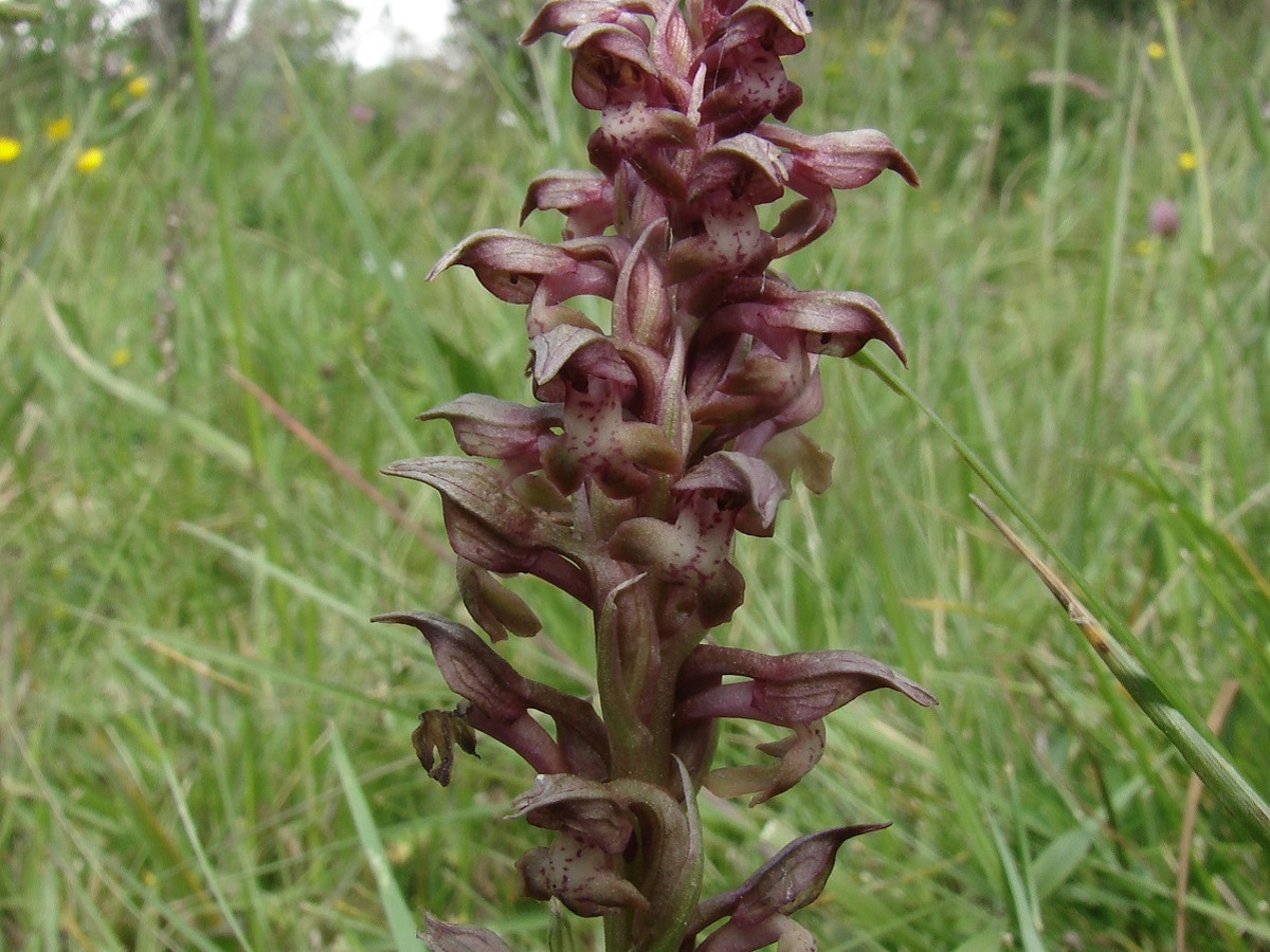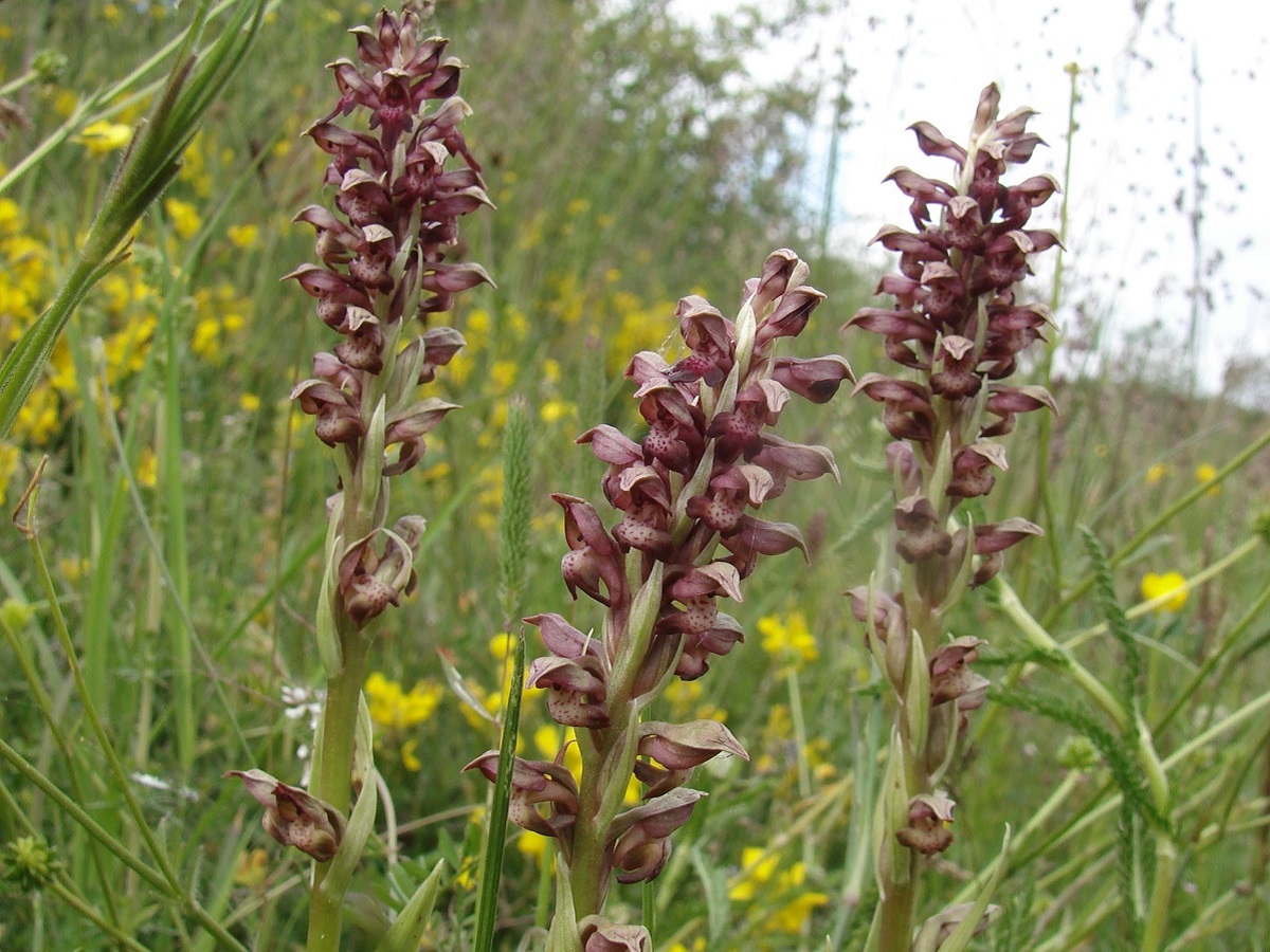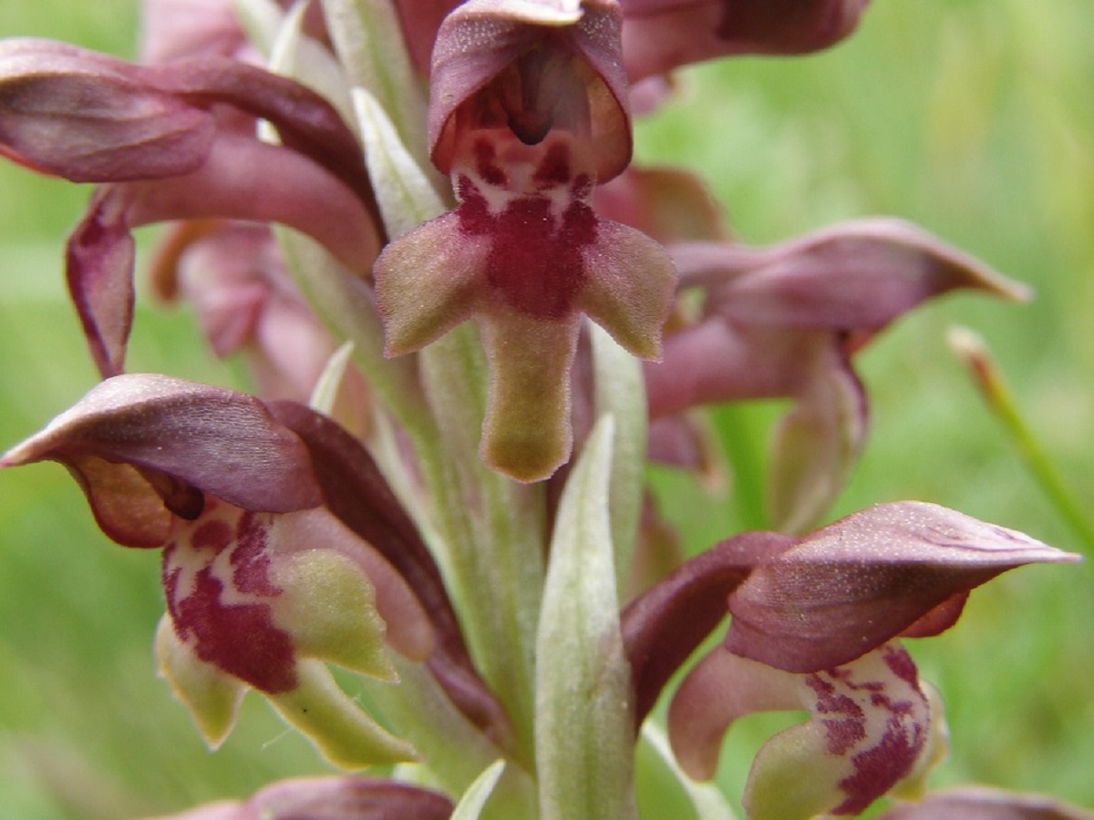 G à tubercule – 2-4 dm – Feuilles lancéolées – Fleurs pourpre verdâtre à odeur désagréable, labelle L de 6-8 mm trilobé ponctué de pourpre, tépales soudés en casque pointu