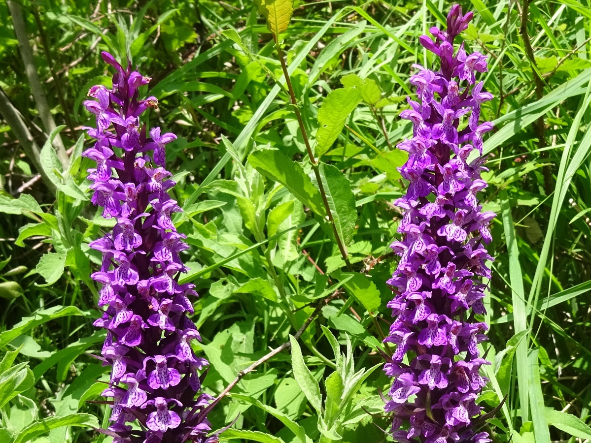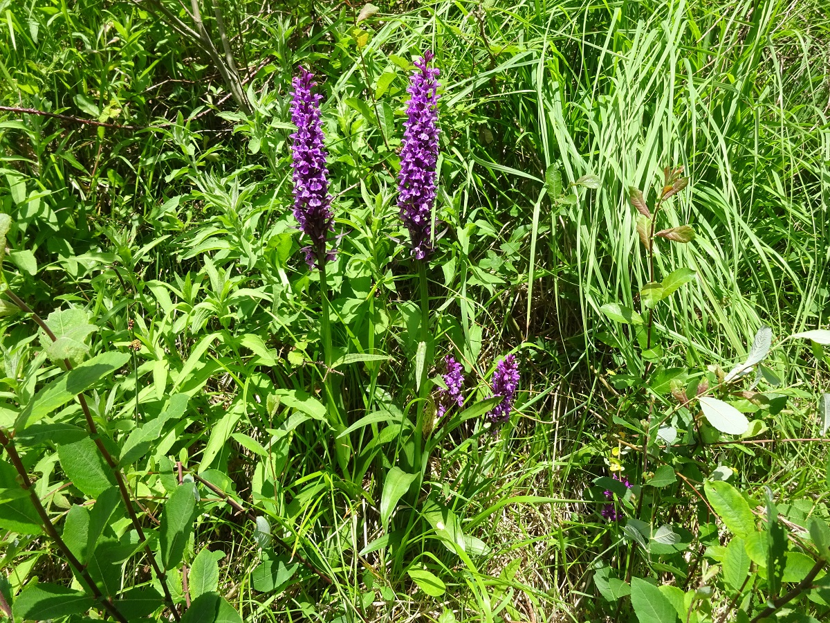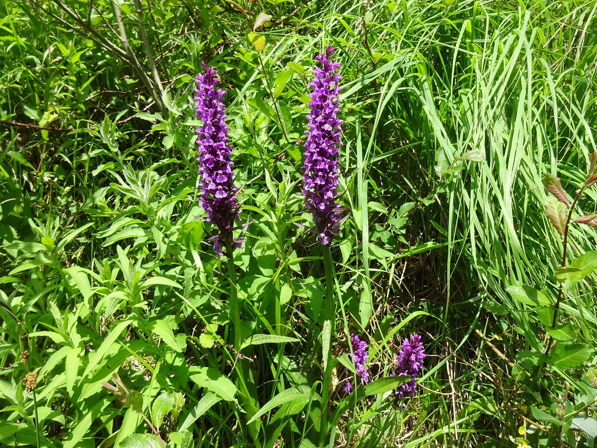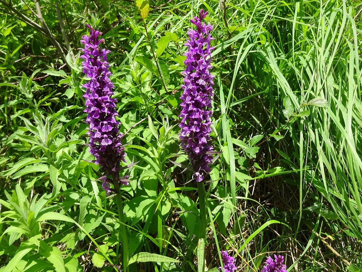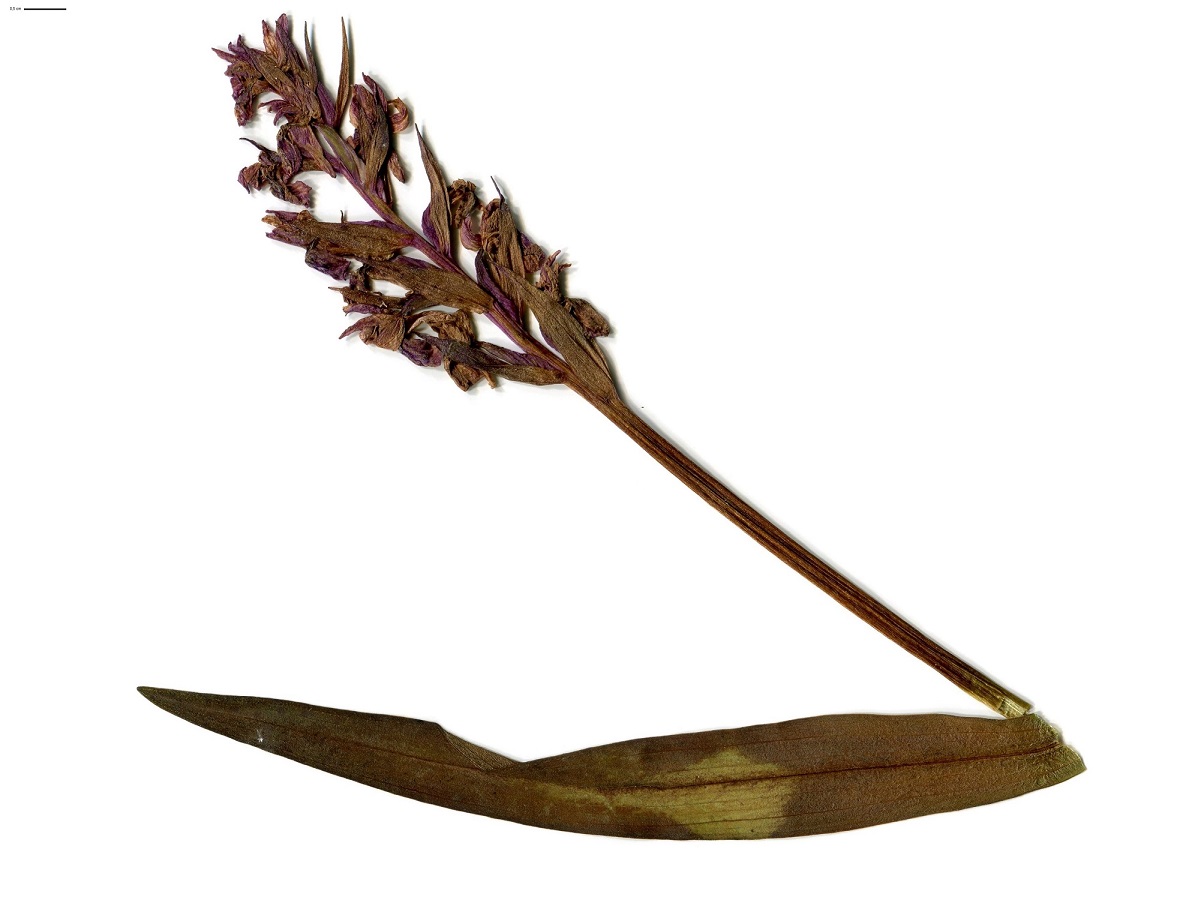 G à tubercule – 3-10 dm – Feuilles de l > 2 cm lancéolées ± immaculées – Fleurs en épi allongé, labelle pourpré à lignes bouclées, tépales en casque, éperon assez épais, à longues bractées