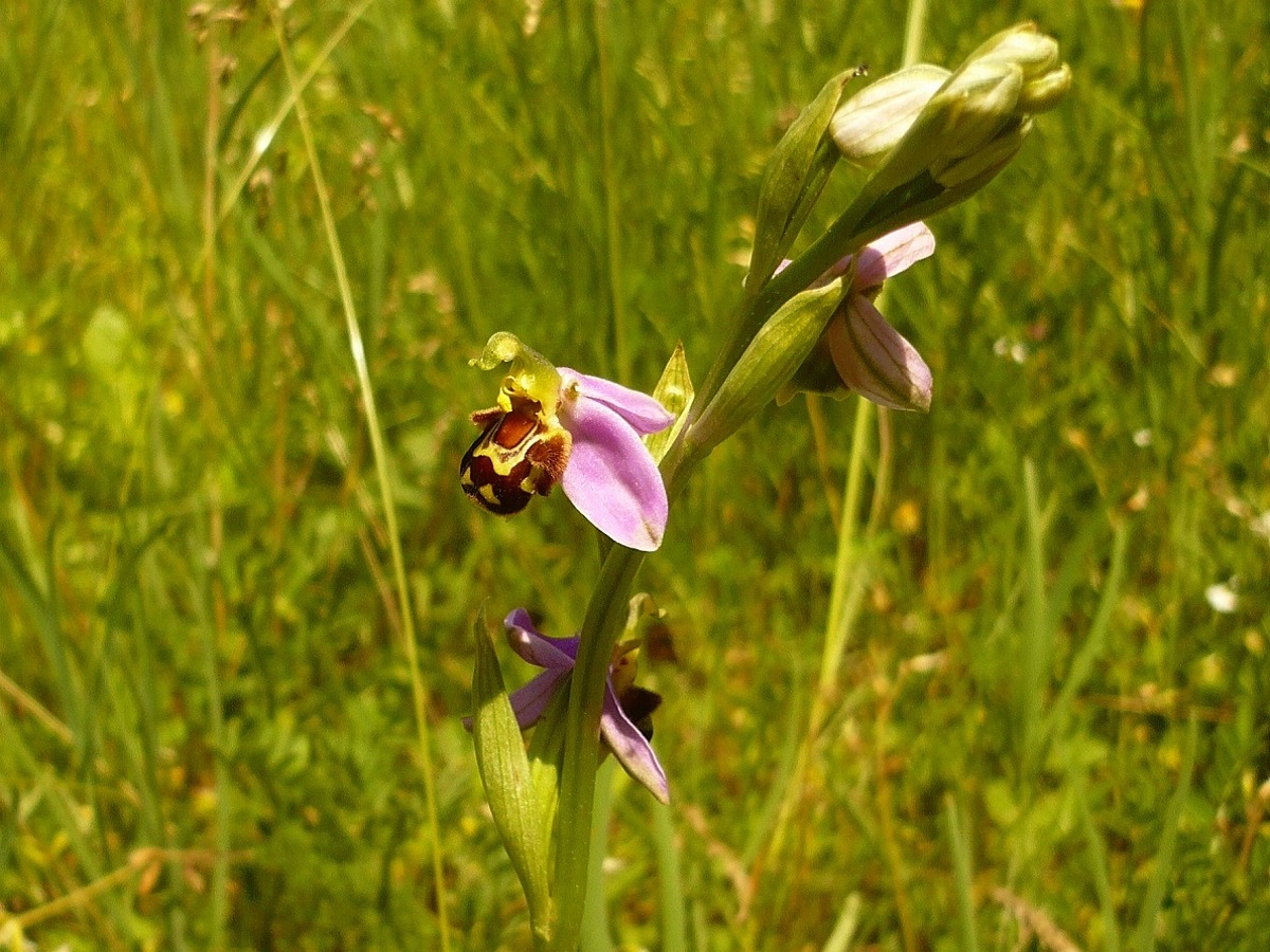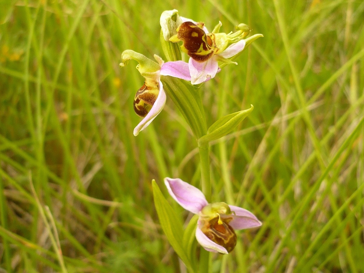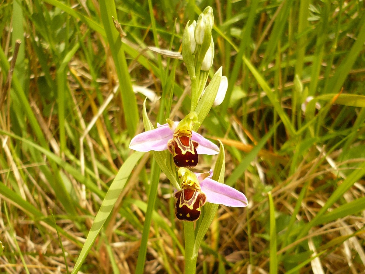 G à tubercule – 2-5 dm – Épi de 2-8 fleurs, labelle L de 10-13 mm brun orné à 2 lobes latéraux coniques, appendice incurvé, bec ± en S, 3 grands sépales roses, 2 pétales verts réduits