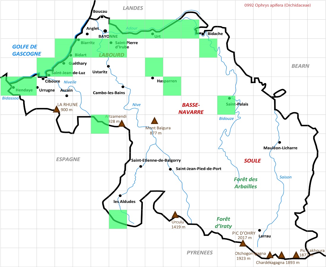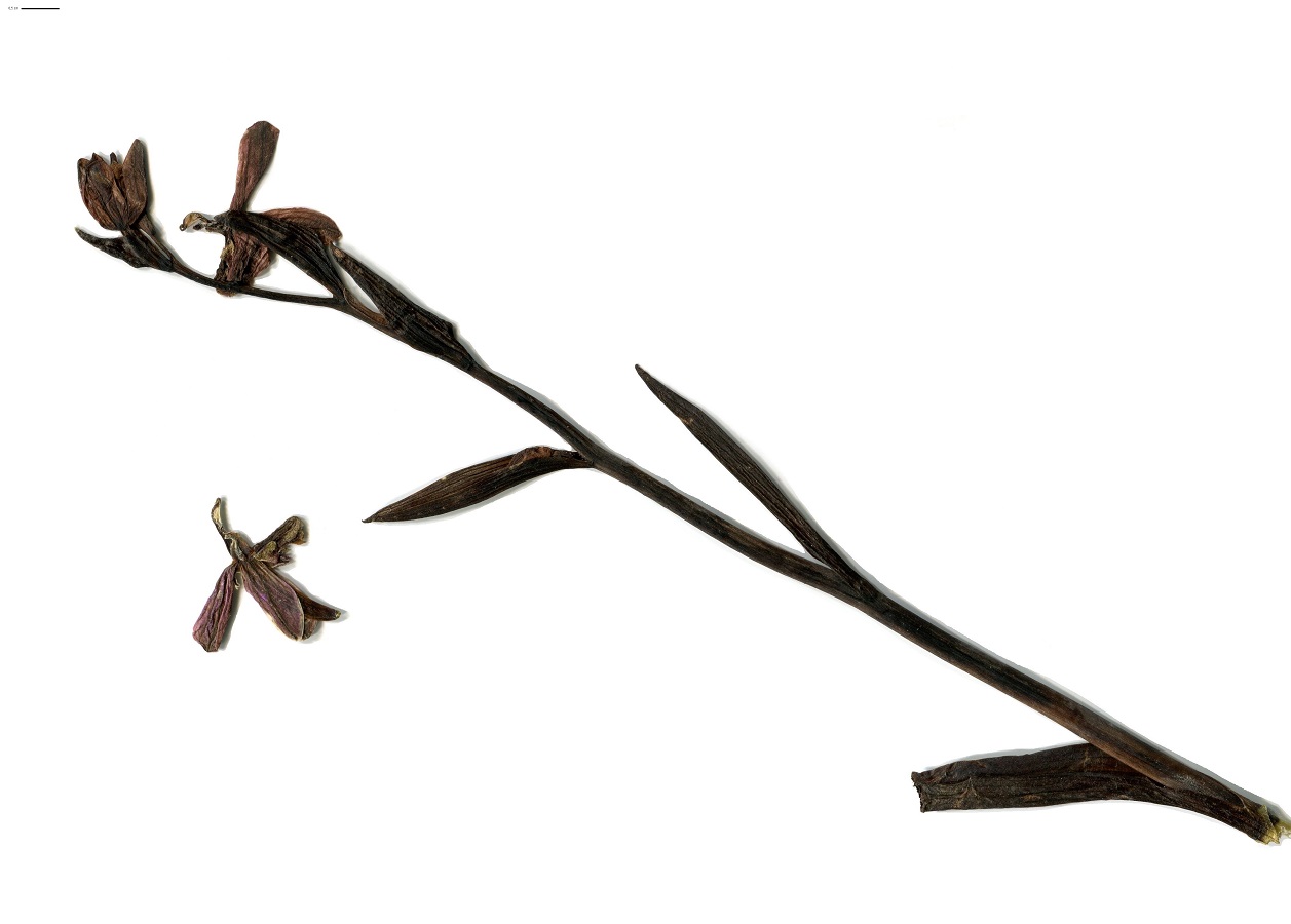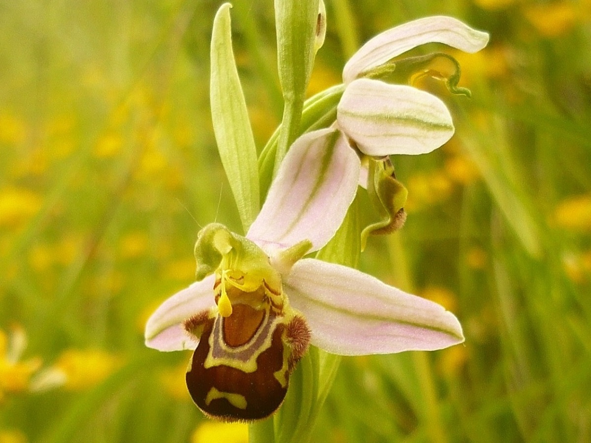G à tubercule – 2-5 dm – Épi de 2-8 fleurs, labelle L de 10-13 mm brun orné à 2 lobes latéraux coniques, appendice incurvé, bec ± en S, 3 grands sépales roses, 2 pétales verts réduits