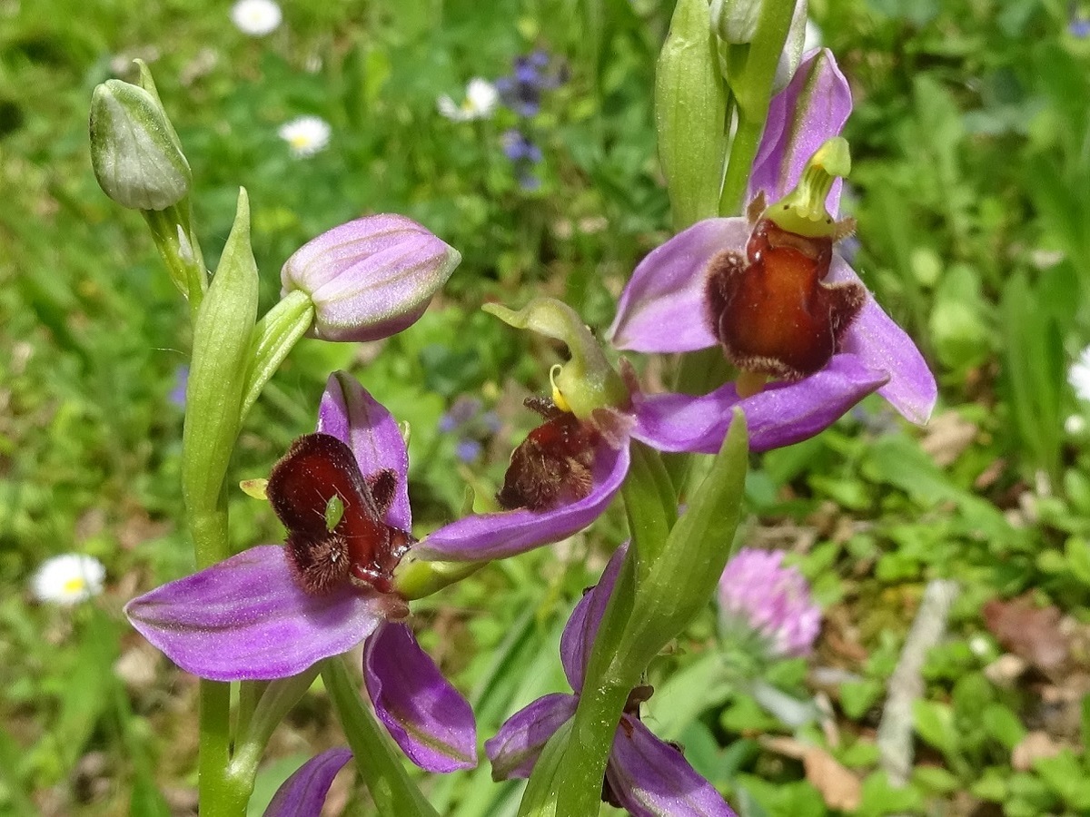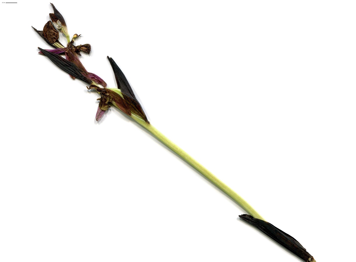 G à tubercule – 2-5 dm – Épi de 2-8 fleurs, labelle L de 10-13 mm brun rouge à 2 lobes latéraux coniques, appendice incurvé, bec ± en S, 3 grands sépales roses, 2 pétales roses réduits