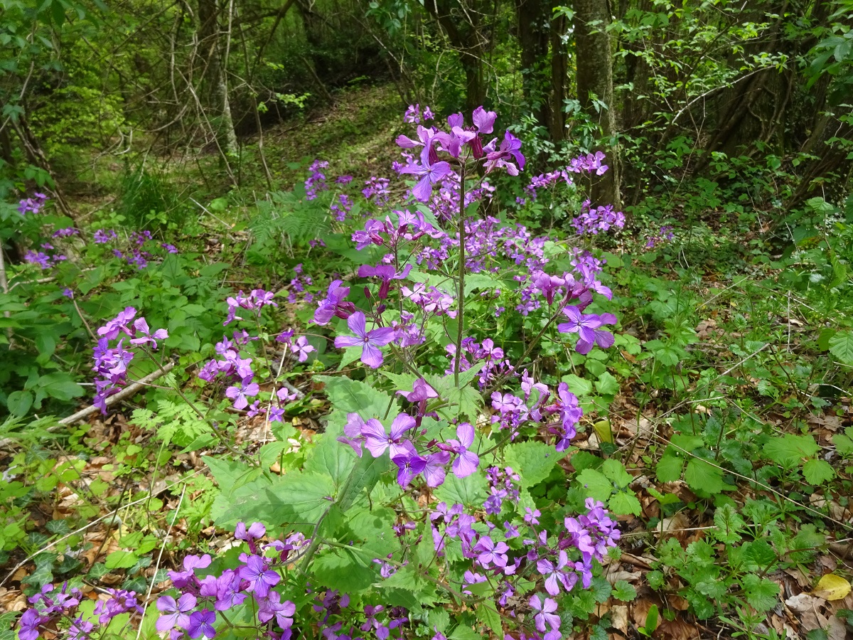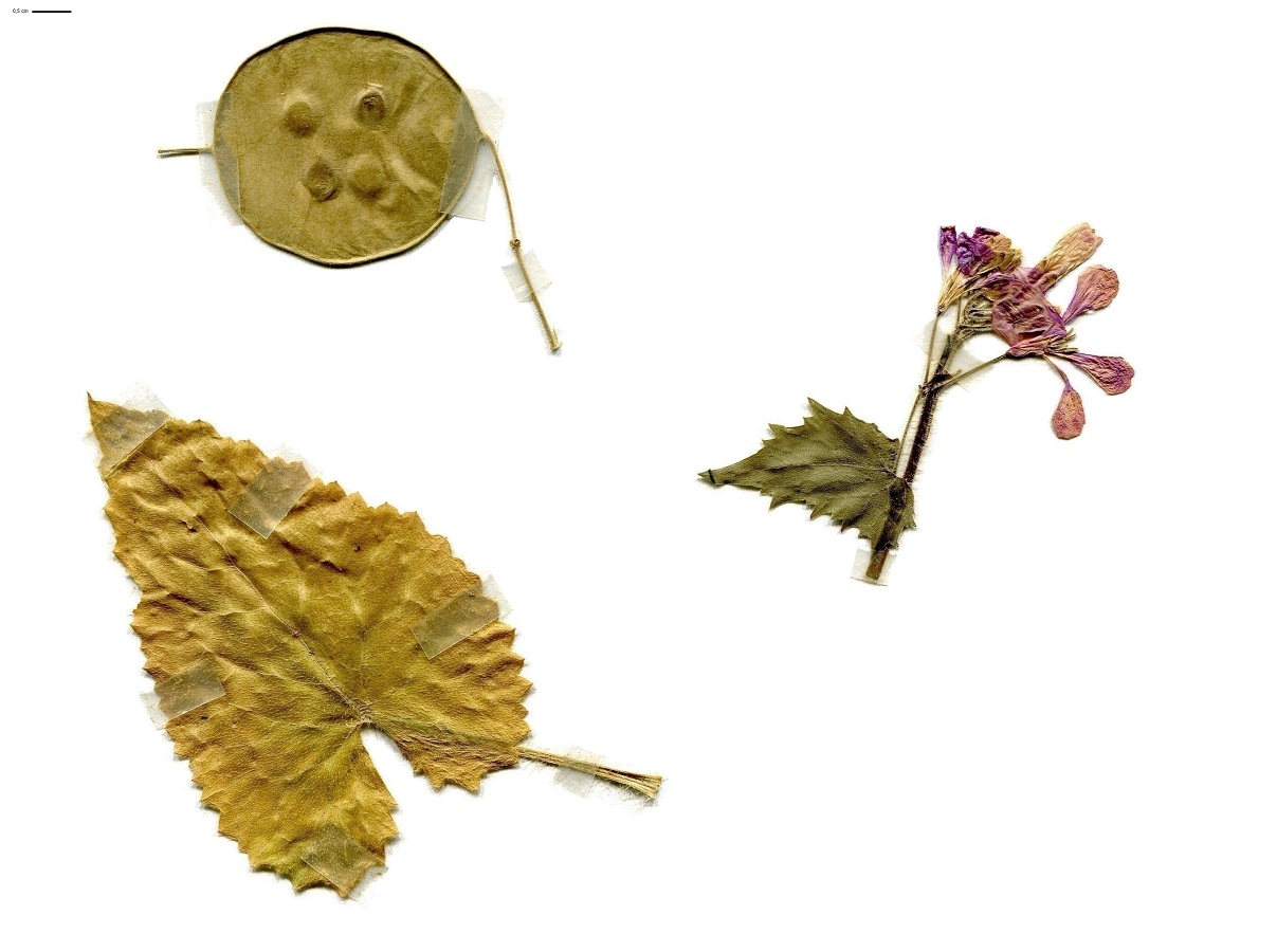 Ch – 4-8 dm – Feuilles ovales-aiguës en coeur, grossièrement dentées, les > sessiles – Fleurs à 4 pétales de L ≃ 1,5 cm pourpres ou blancs – Grande silicule aplatie orbiculaire-elliptique