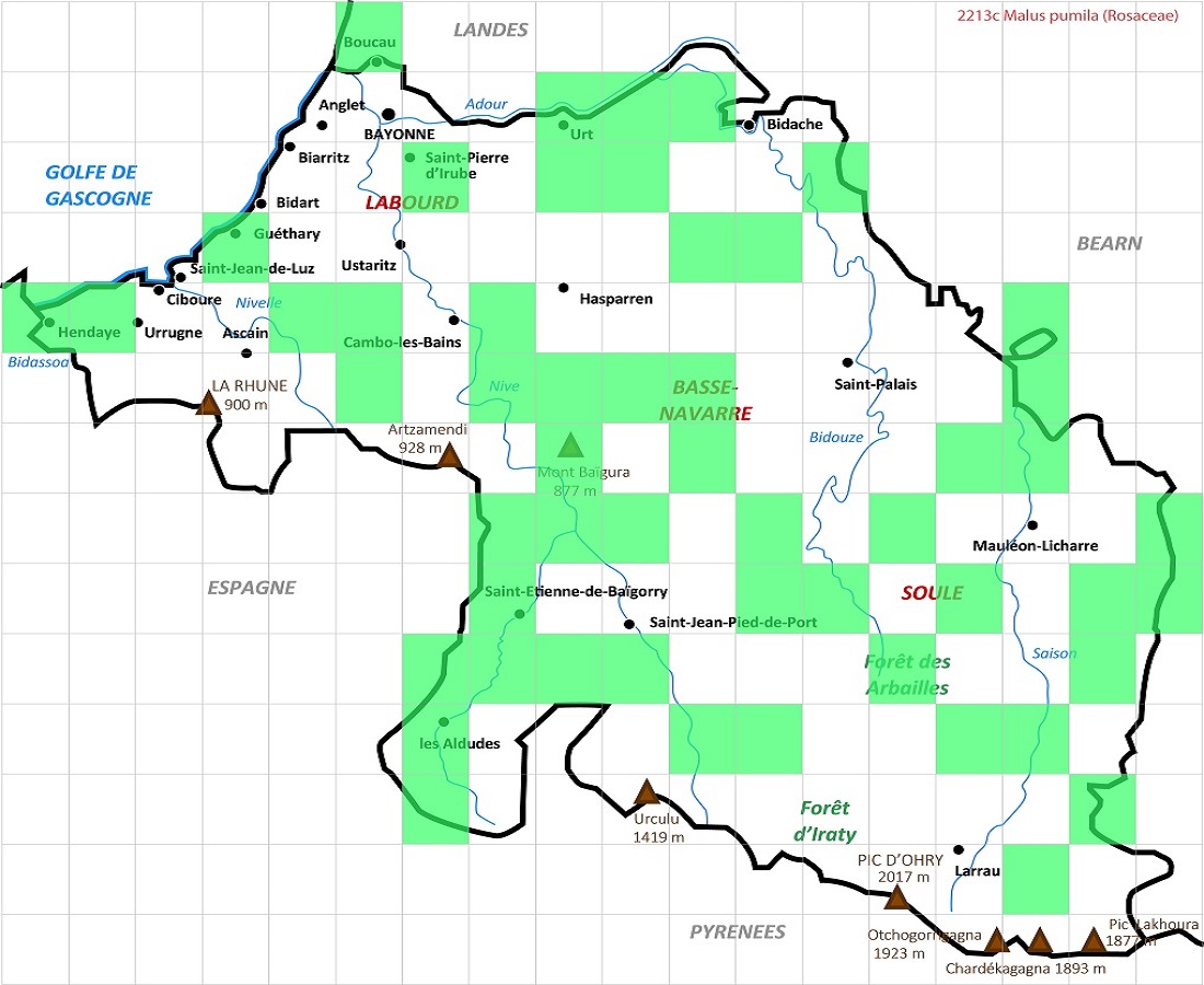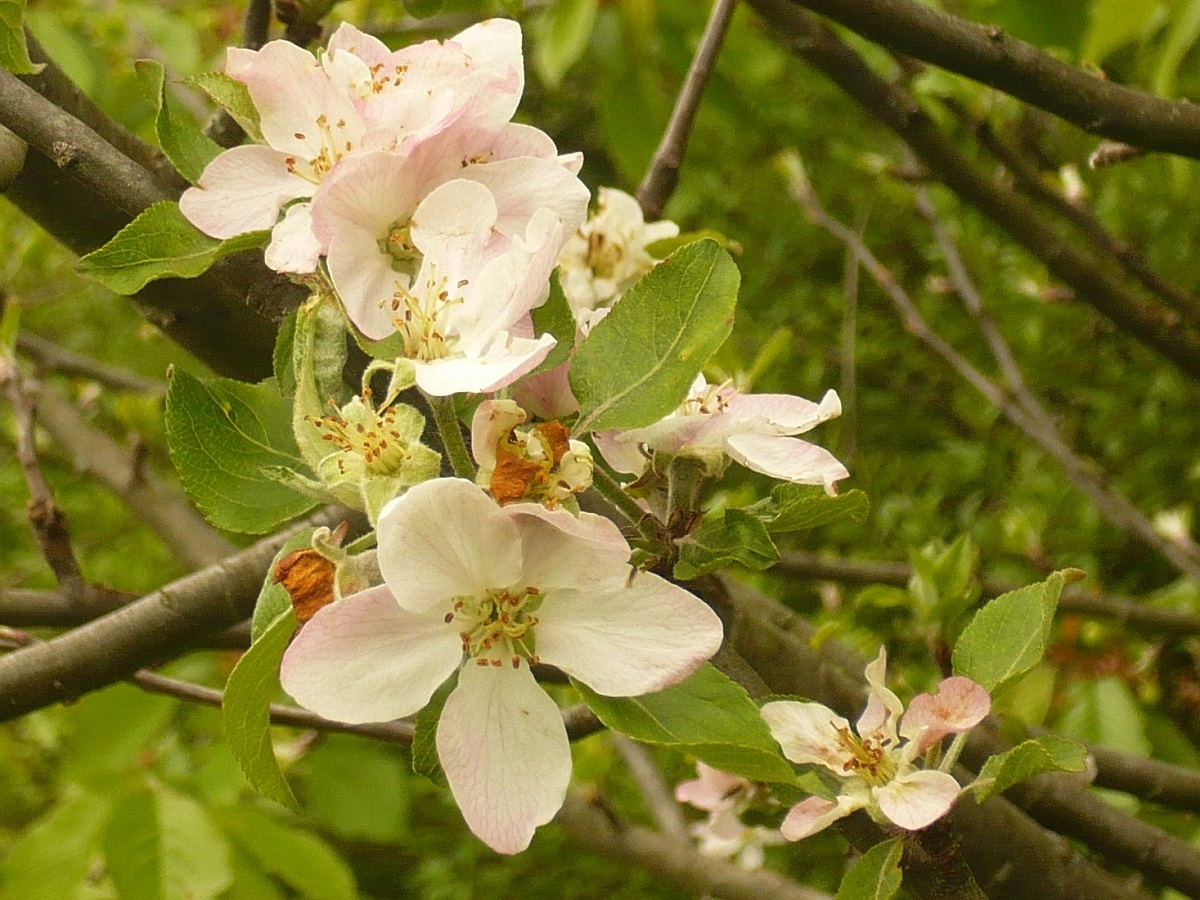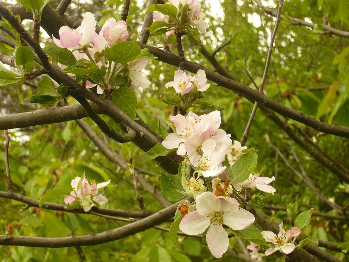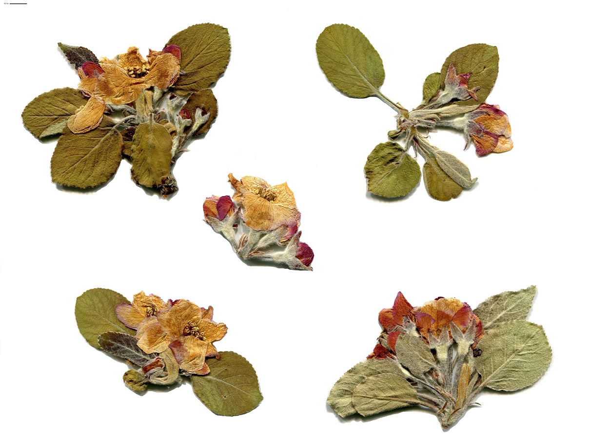 NPh/Ph – 2-10 m – Feuilles L de 4-13 cm ovales-elliptiques, tomenteuses dessous – Ombelle de fleurs de Ø 4-5 cm blanc rosé – Pomme de taille > 5 cm charnue à saveur douce ± acidulée