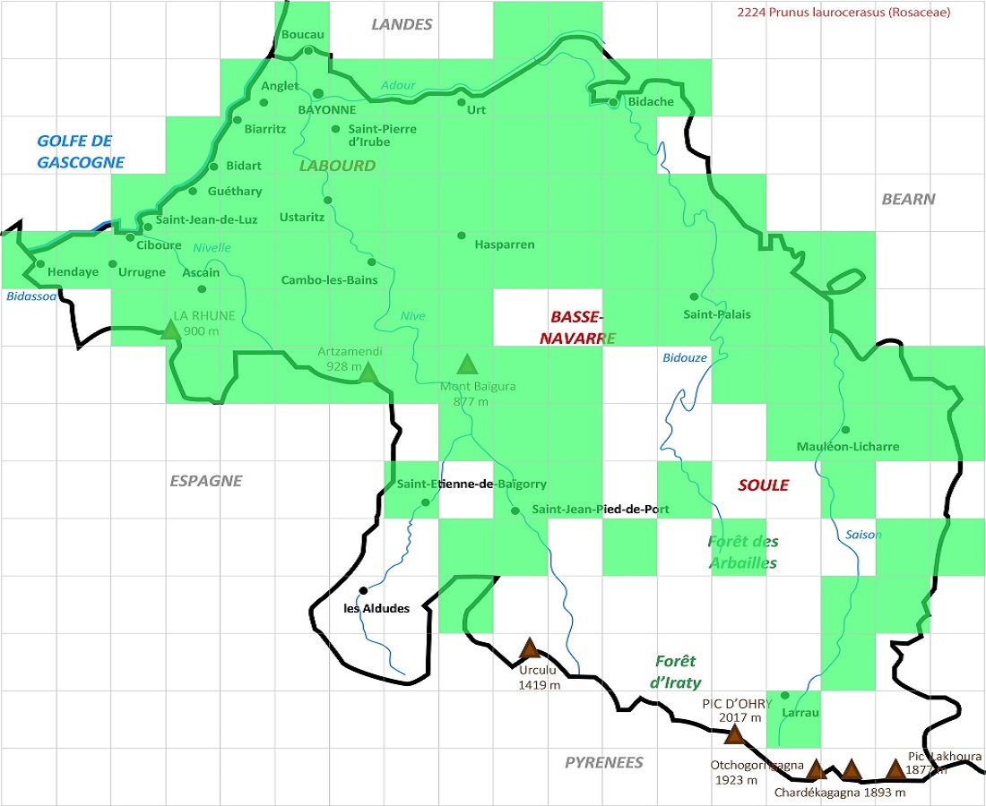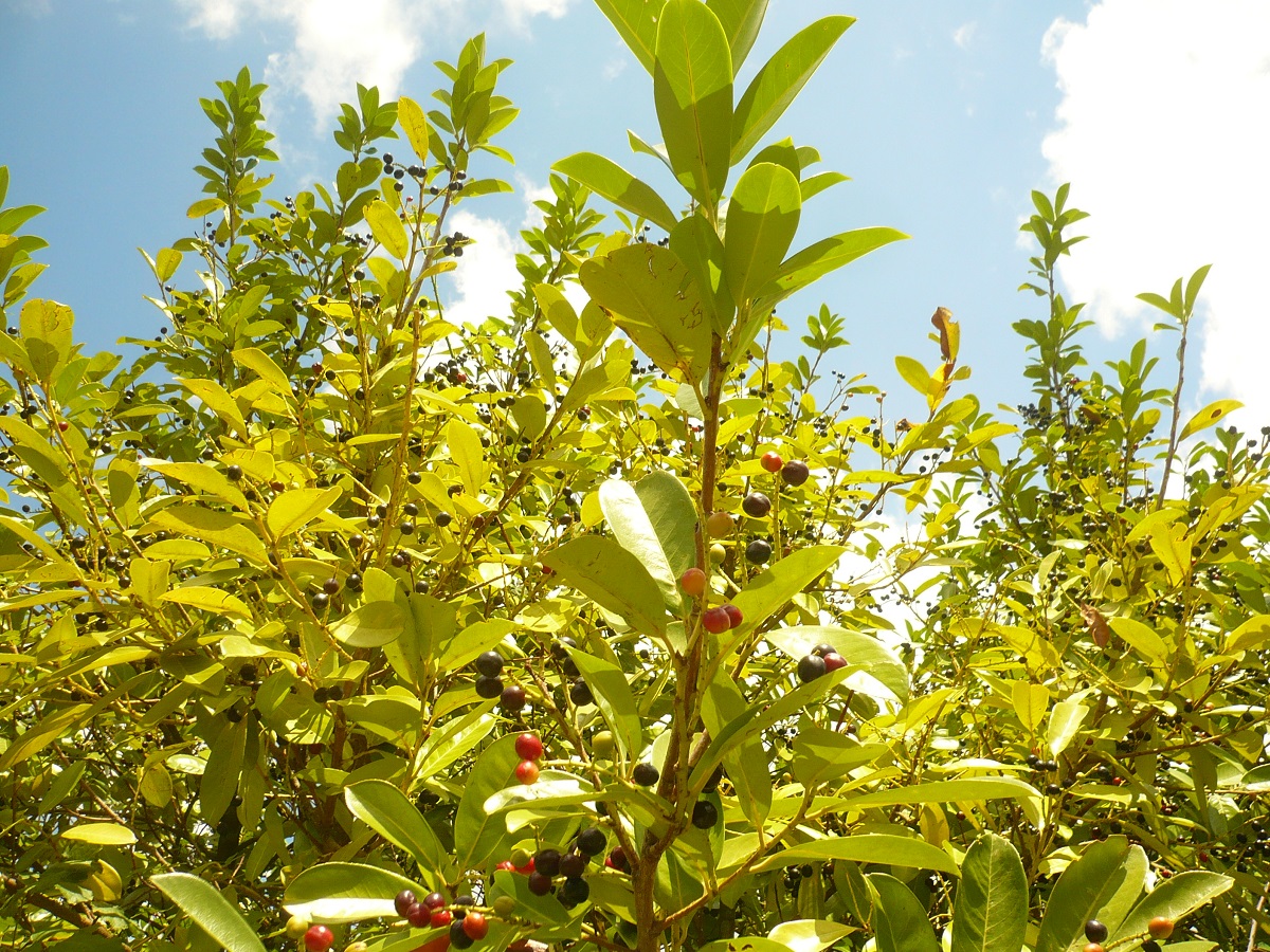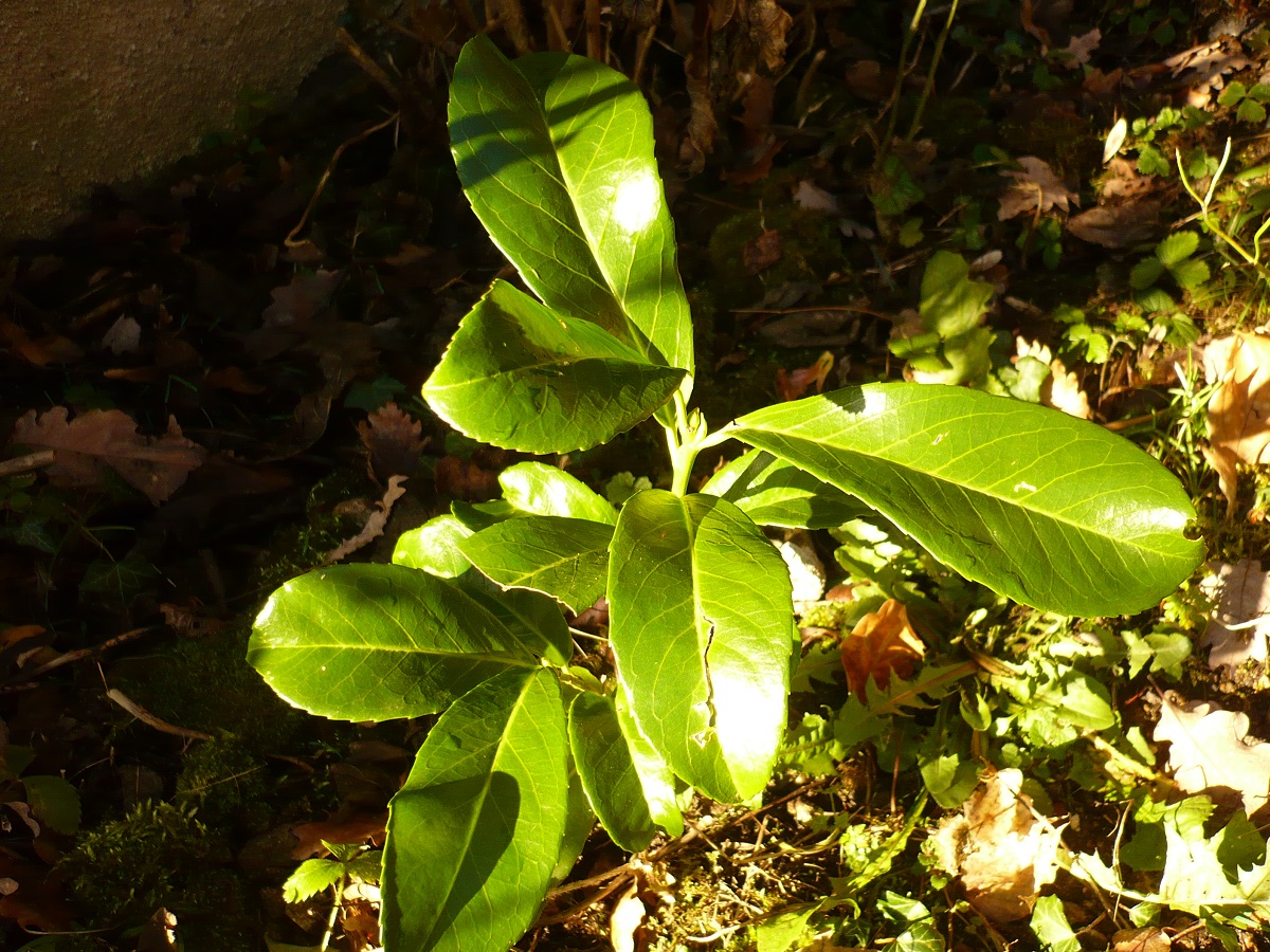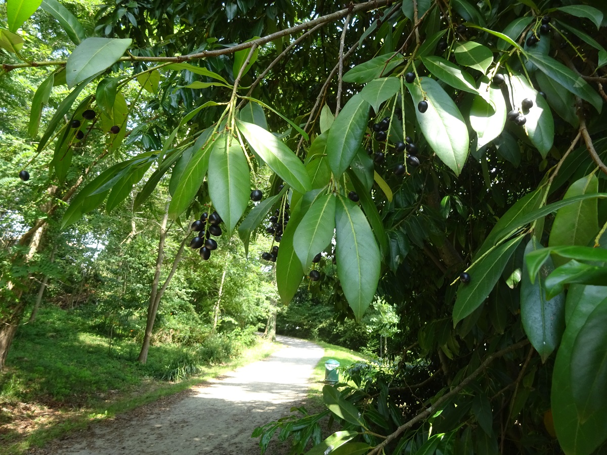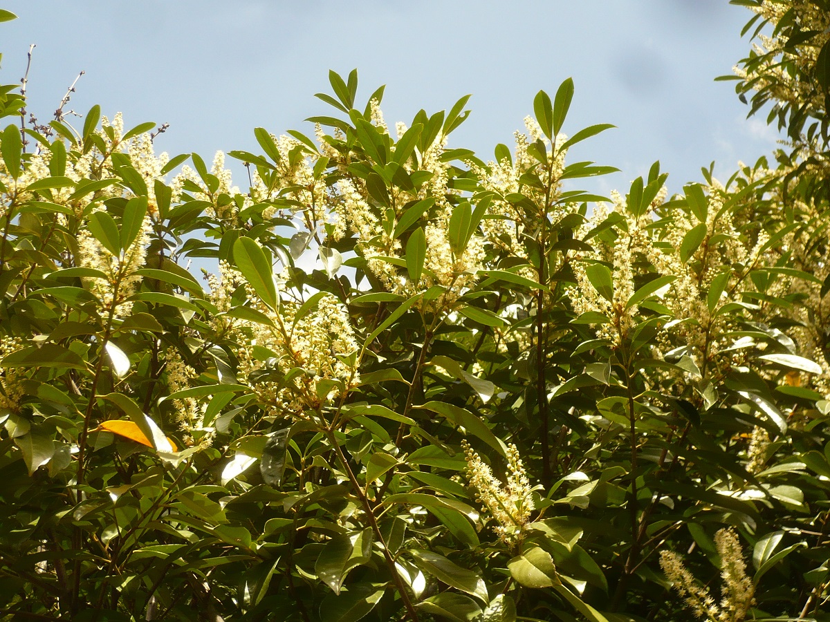 NPh/Ph – 2-6 m – Feuilles L de 12-15 cm persistantes luisantes épaisses, à court pétiole vert – Fleurs de Ø ≃ 8 mm blanches en épi L de 8-12 cm – « Fruit » de L ≃ 1 cm noir ovoïde, à 1 noyau