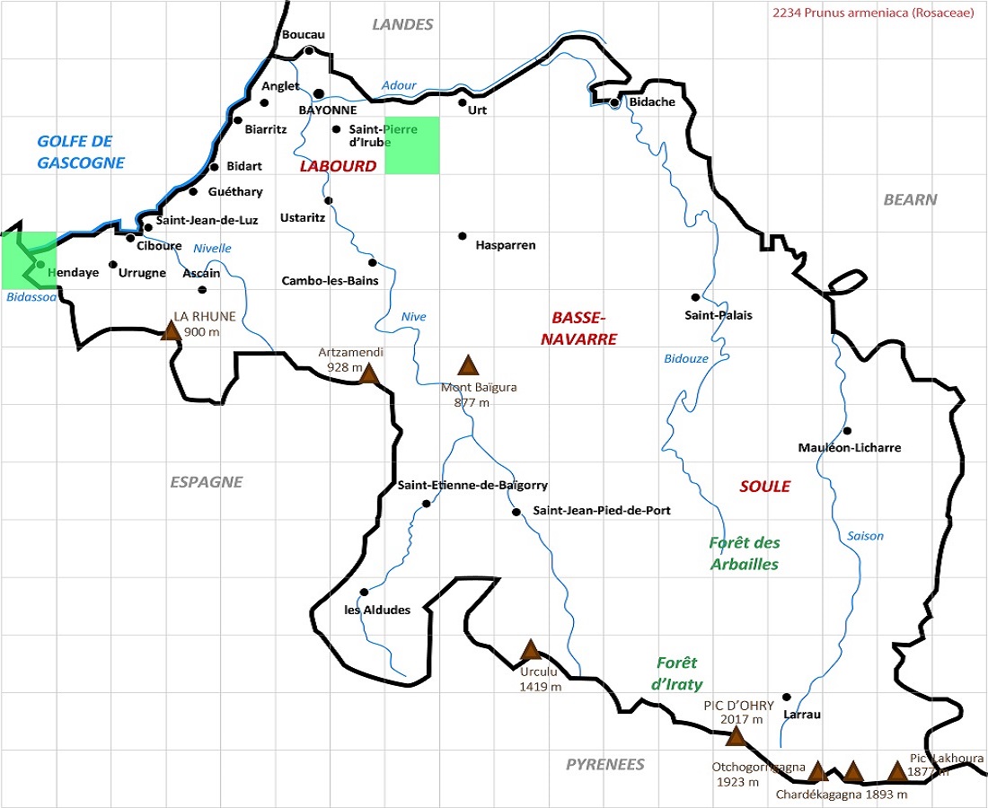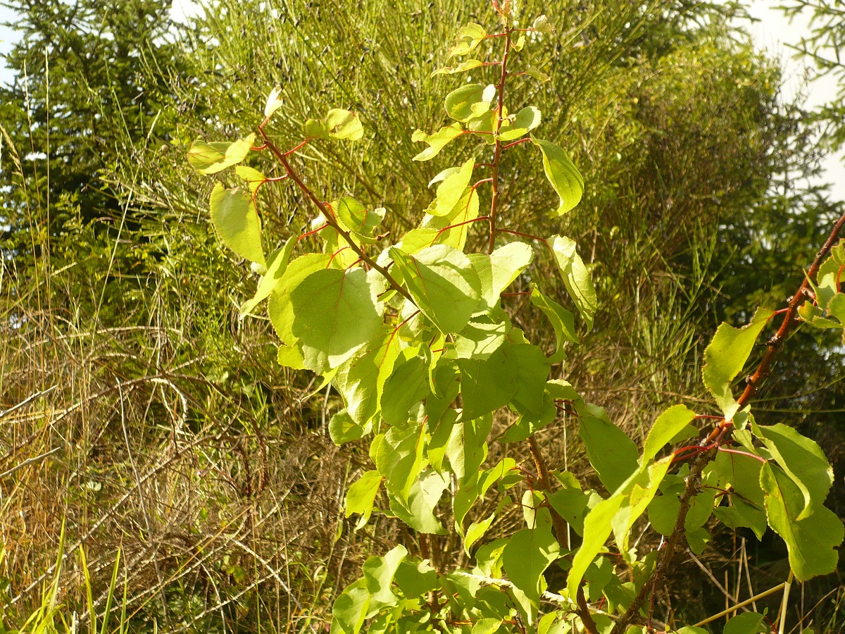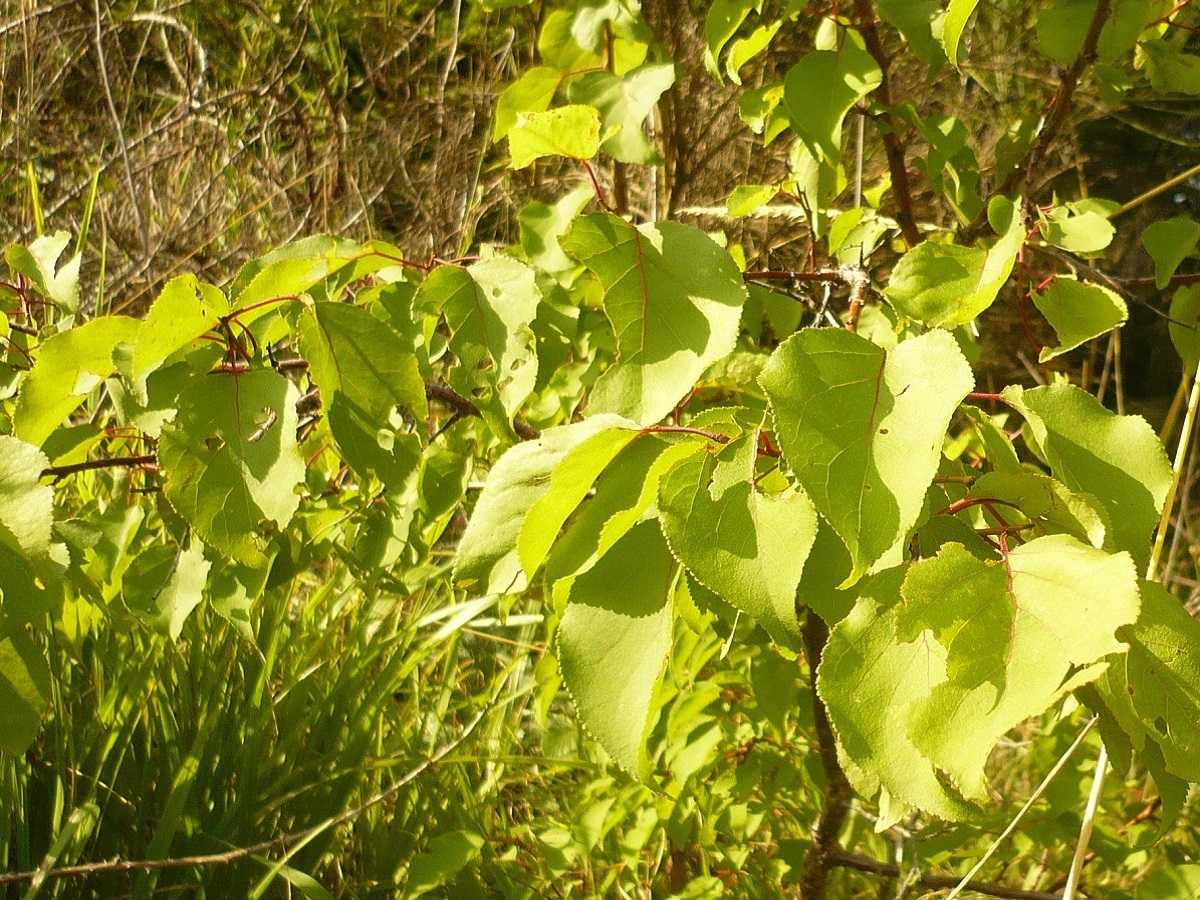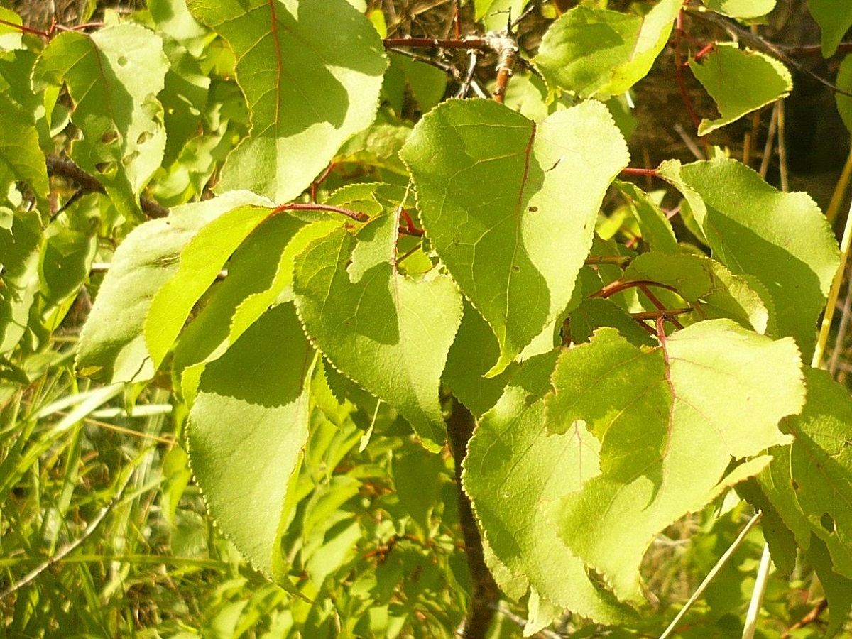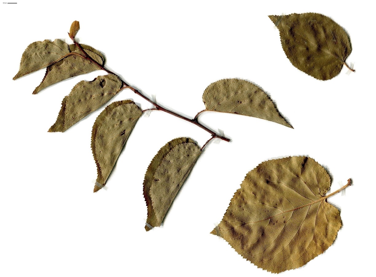 Ph – 3-6 m – Feuilles L de 5-10 cm arrondies en coeur, acuminées, bidentées – Fleurs par 1-2 à pétales L de 10-15 mm blancs à rosés – Fruit (abricot) de Ø 4-6 cm jaune charnu à noyau