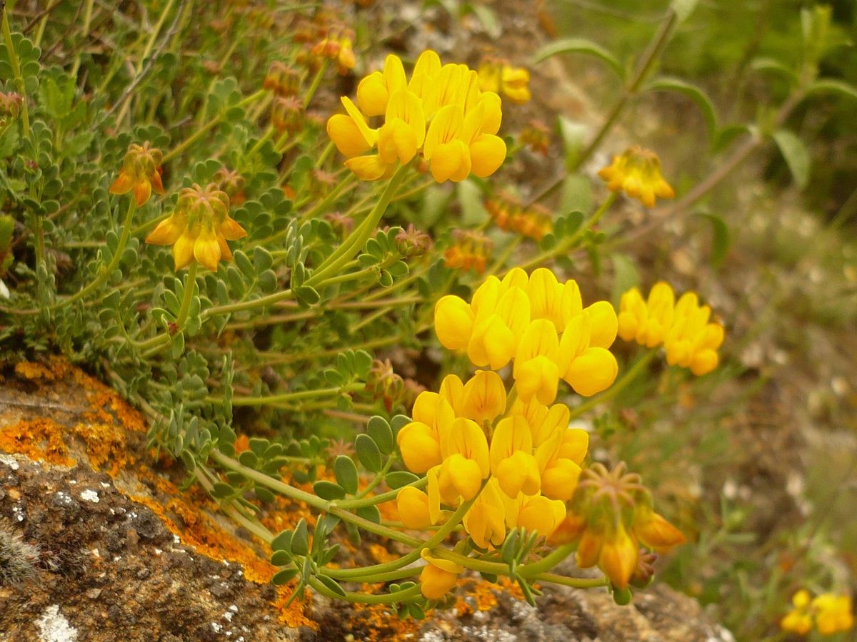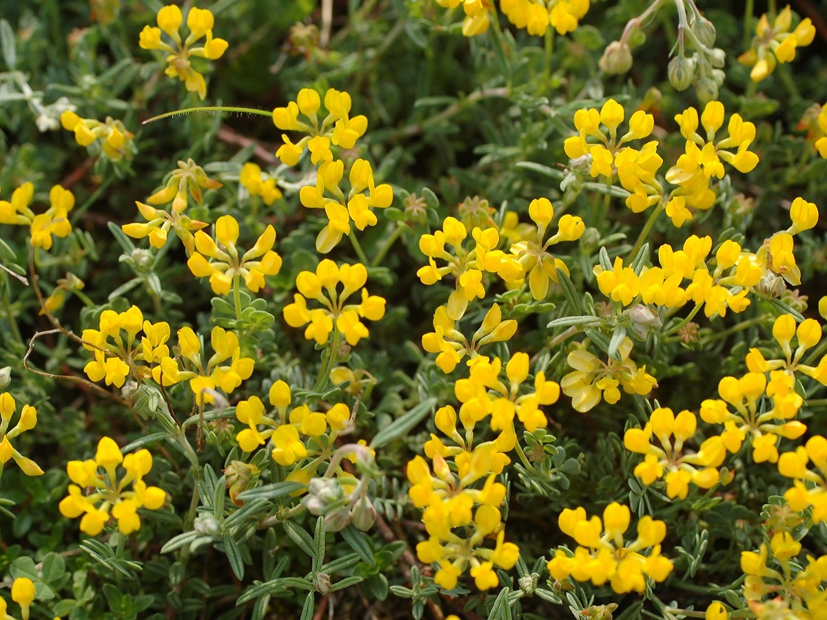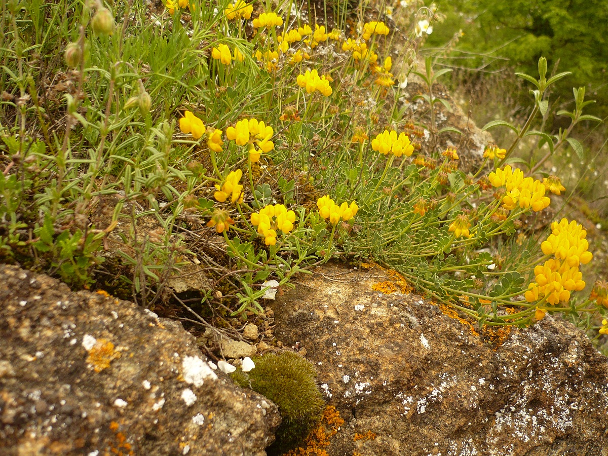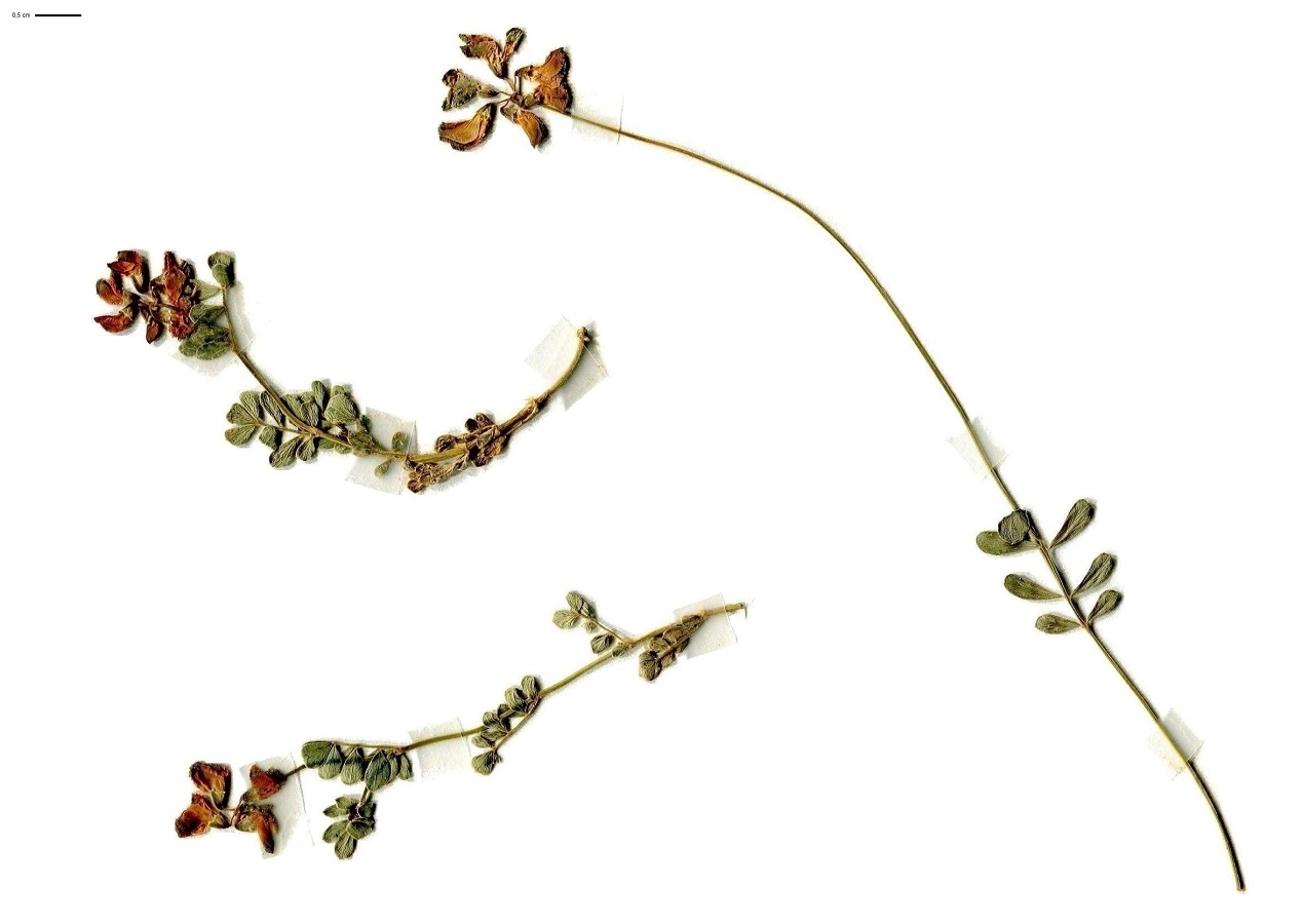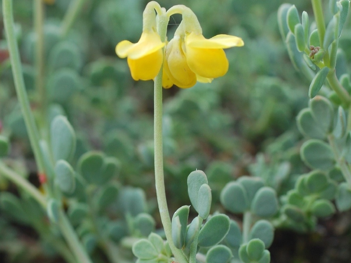 Ch – 0,5-2 dm – Feuilles glauques à 7-9 petites folioles obovales épaisses – Fleurs en tête par 5-10, corolle jaune L de 5-7 mm – Gousse L de 1-3,5 cm droite articulée, pendante