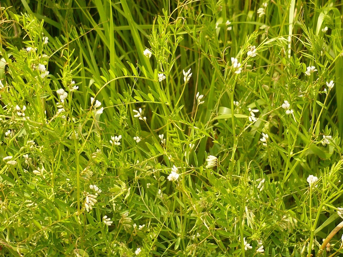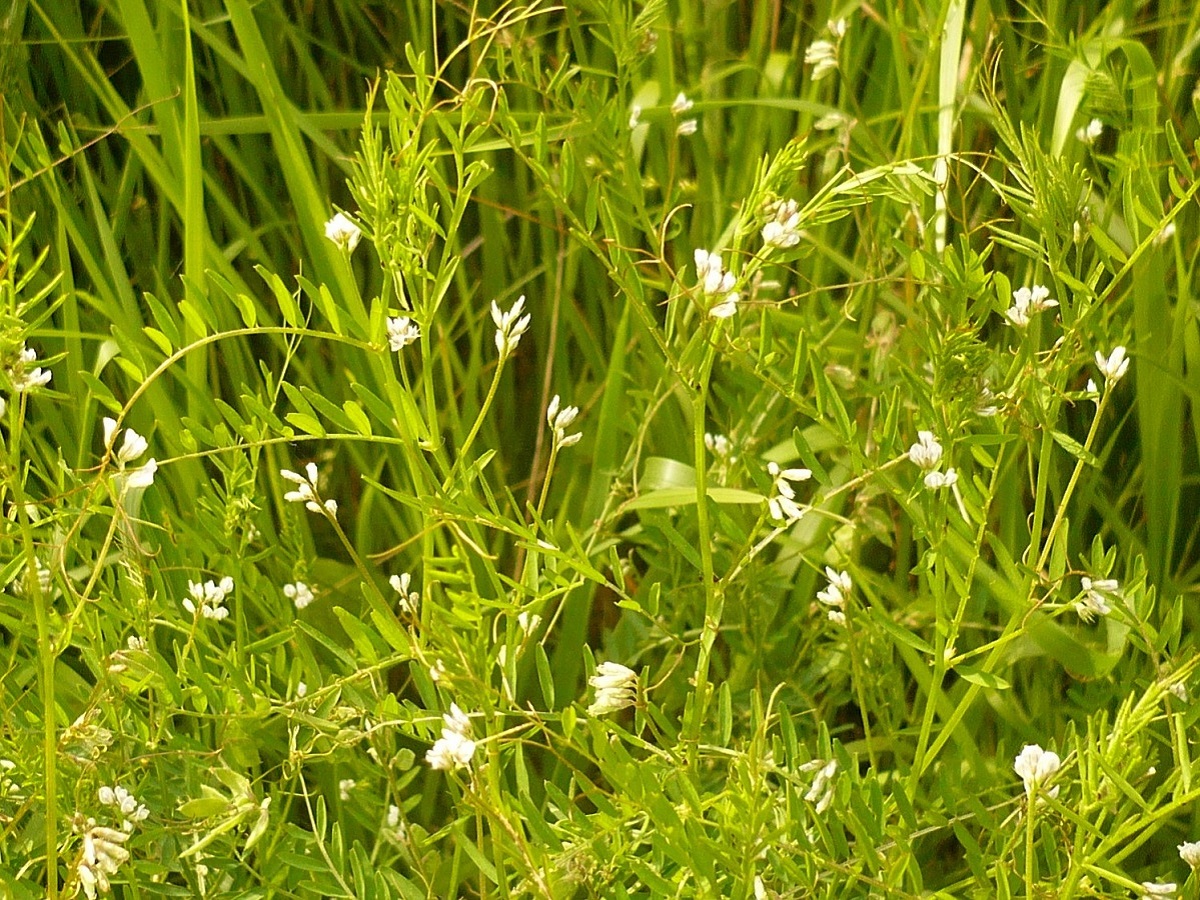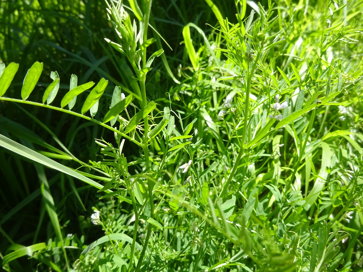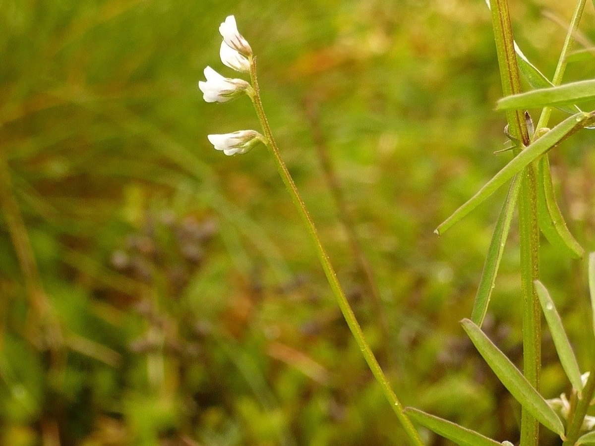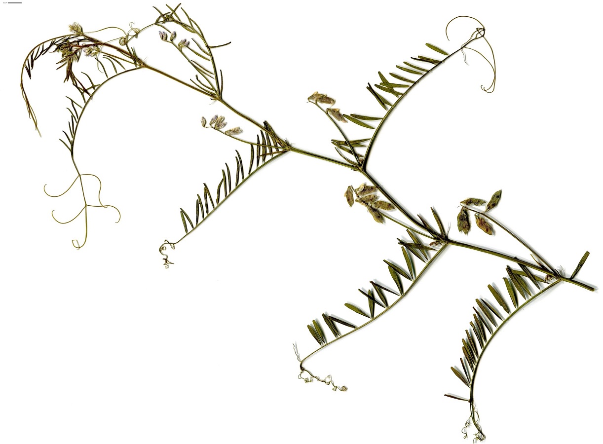 Th – 2-6 dm – Feuilles pennées à 8-20 folioles L de 0,5-2 cm linéaires et vrille > – Grappe de 1-8 petites fleurs à corolle de 2-4 mm blanche ± violacée – Gousse L de 6-11 mm velue, à 2 graines