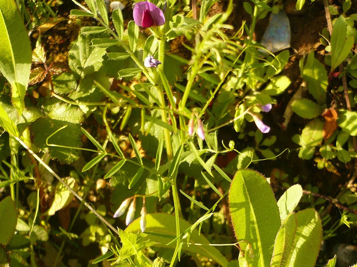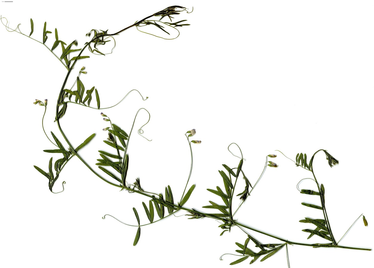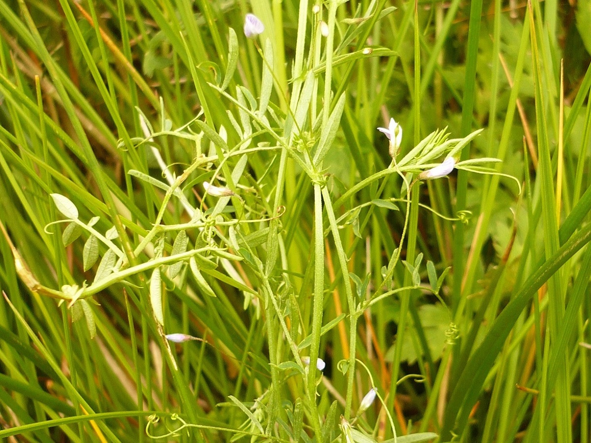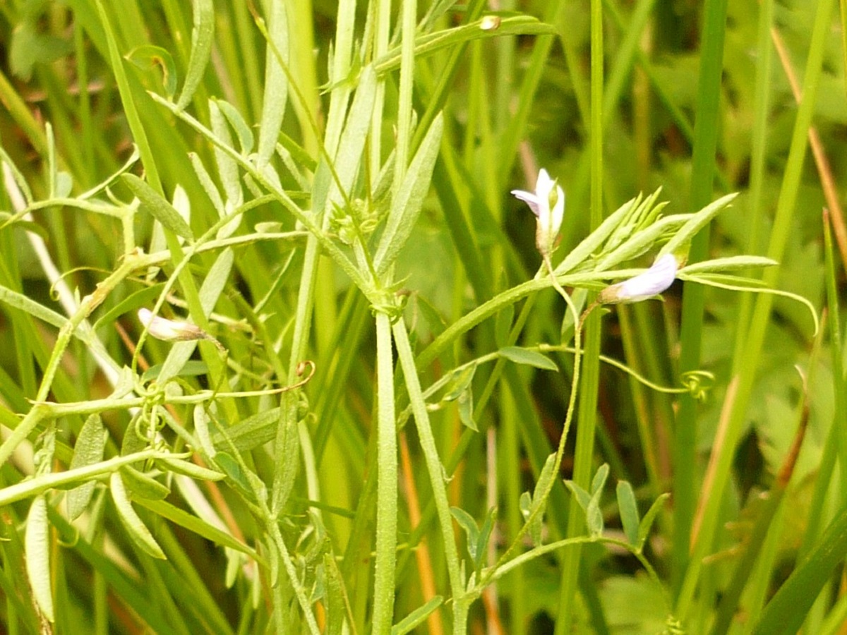 Th – 3-6 dm – Feuilles pennées à 6-12 folioles L de 0,5-2 cm linéaires et vrille > – 1(-2) Fleurs à corolle L de 4-6 mm lilacée, pédoncule ≃ à la feuille – Gousse L de 9-16 mm à 3-4 graines