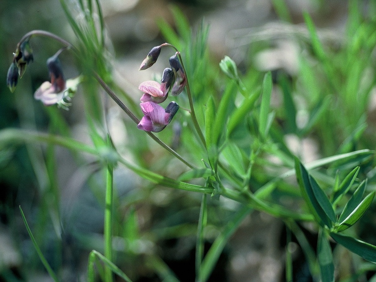 G à rhizome – 2-5 dm – Tige ailée, feuilles à 4-8 folioles de L 1-5 cm elliptiques oblongues, sans vrille – Fleurs par 2-6, corolle L de 1-1,5 cm rouge violacé puis bleuâtre – Gousse glabre