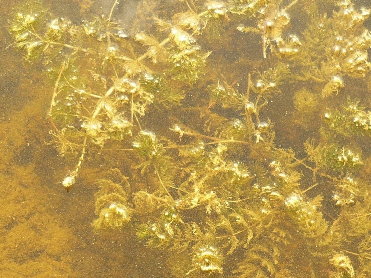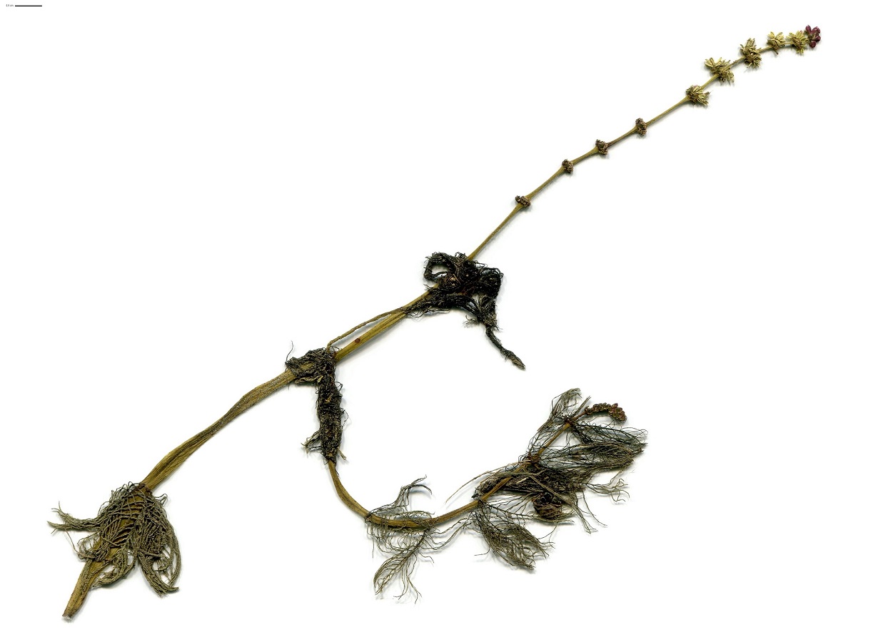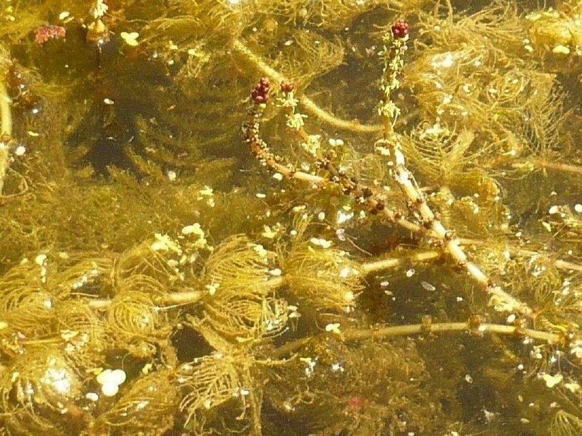 Hydr G – 2-20 dm – Plante robuste, feuilles submergées étagées par 4, à 13-35 fins segments – Épi long multiflore de petites fleurs, ♀ < à 4 pétales rosés et ♂ >, verticillées par 4