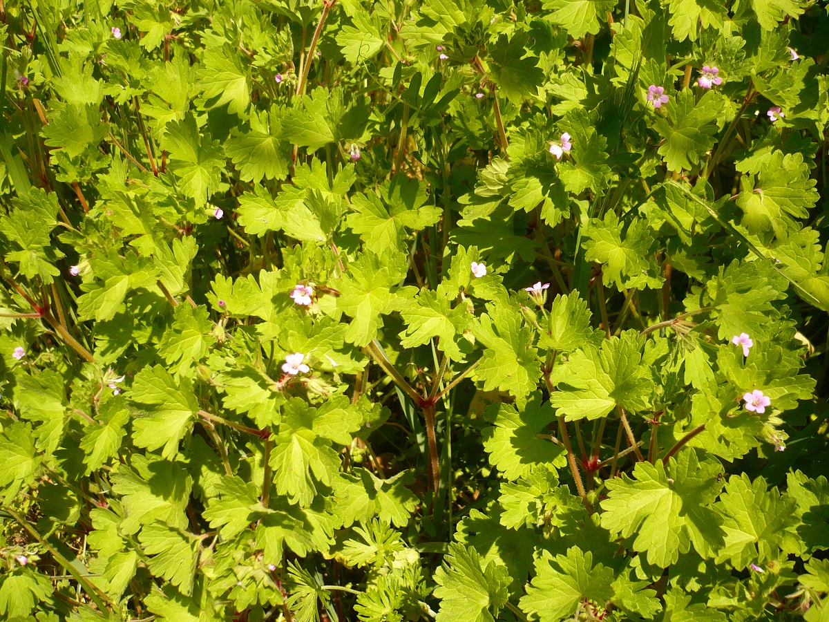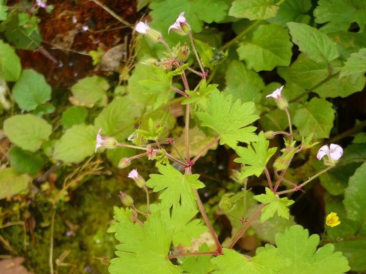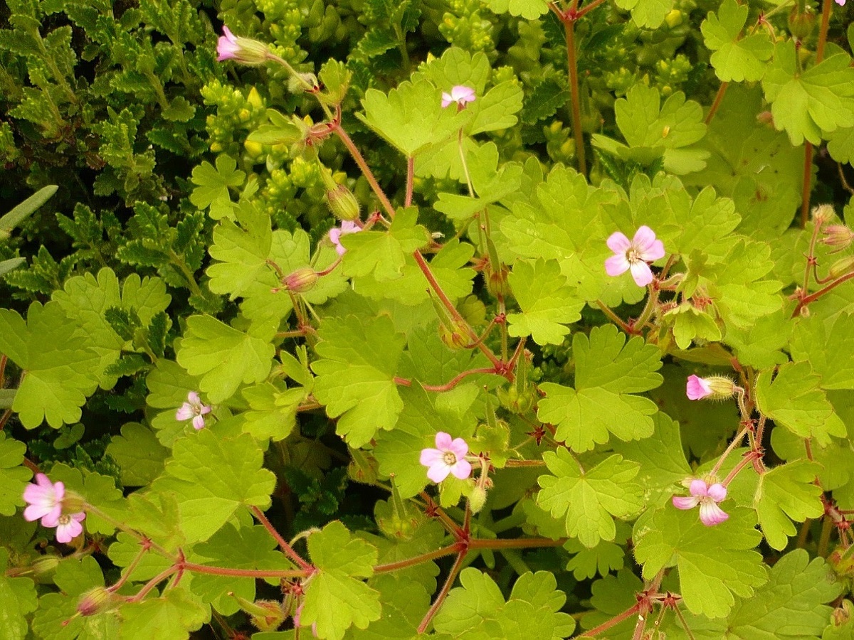 Th – 1,5-3 dm – Odorant, feuilles L de 3-6 cm ± orbiculaires à 5-7 lobes peu profonds crénelés – Fleurs à 5 pétales de L 5-7 mm entiers roses – Fruit à bec, méricarpes lisses, velus