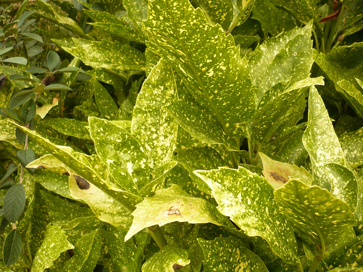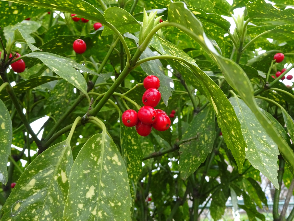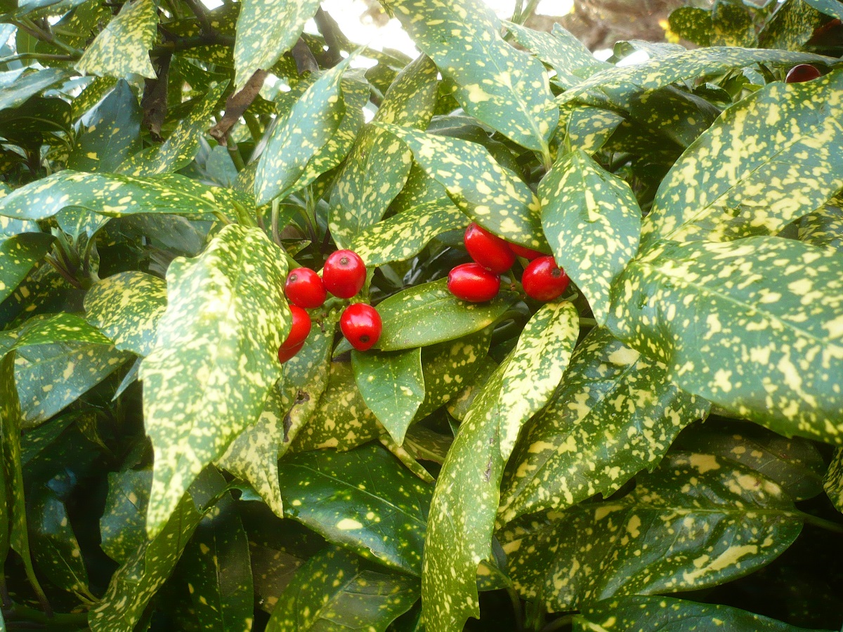 NPh – 1-3 m – Feuilles L de 8-15 cm ovales oblongues ± marbrées, dentées, coriaces, persistantes – Dioïque, fleurs à 4 pétales pourpre foncé – Fruit ovoïde rouge vif à 1 graine