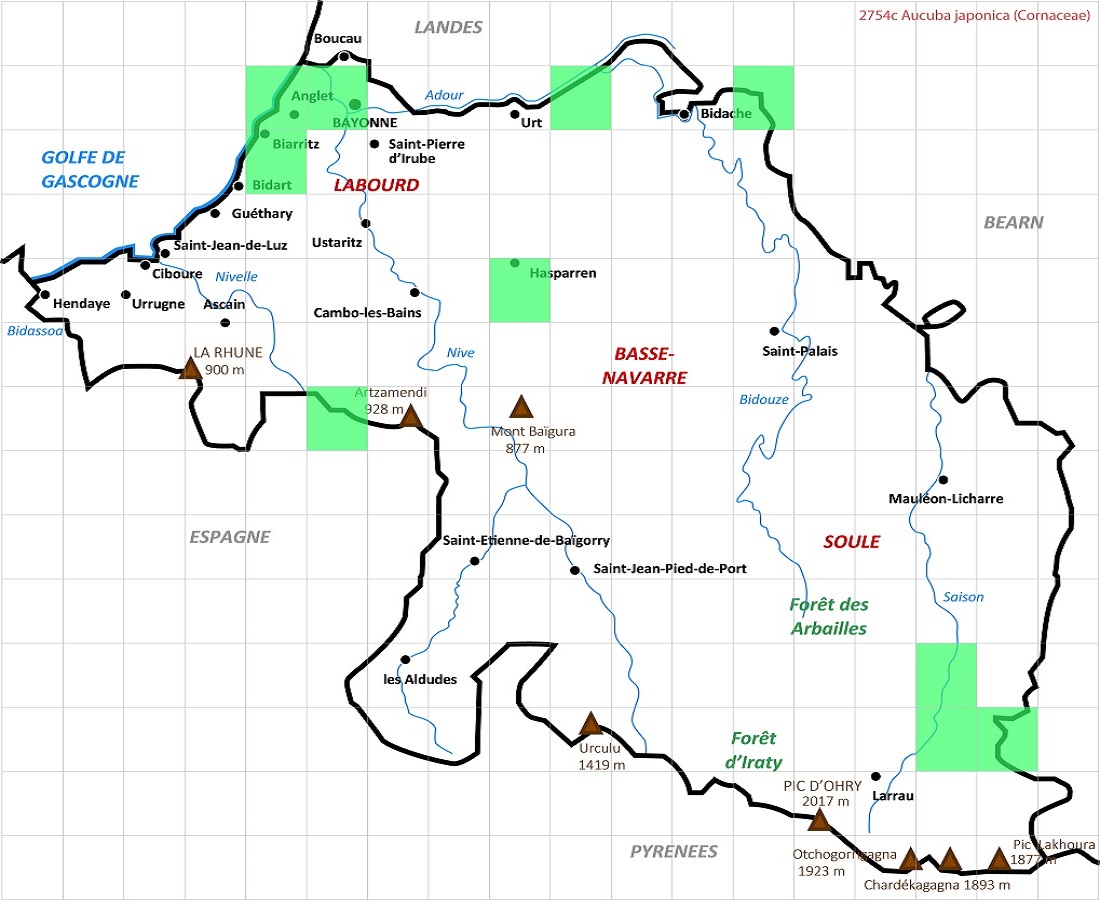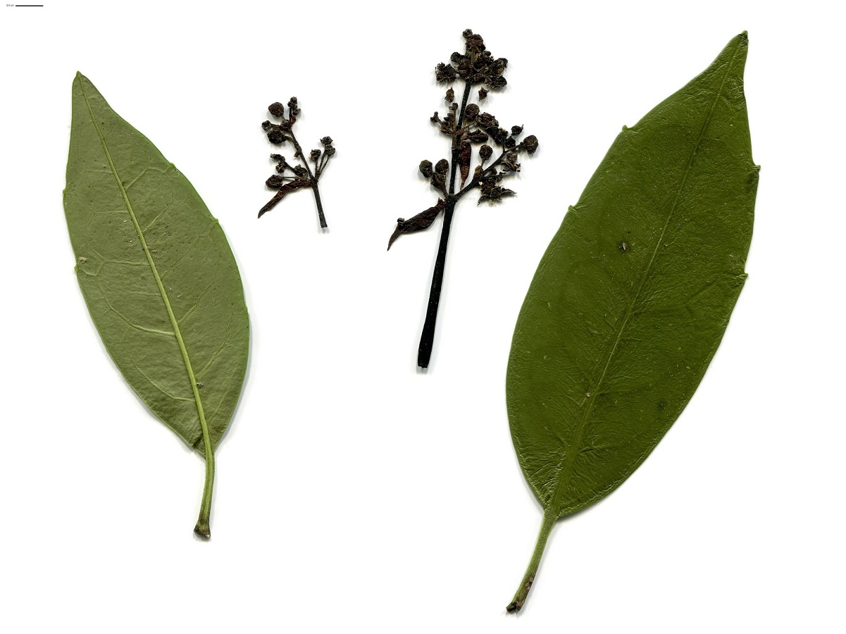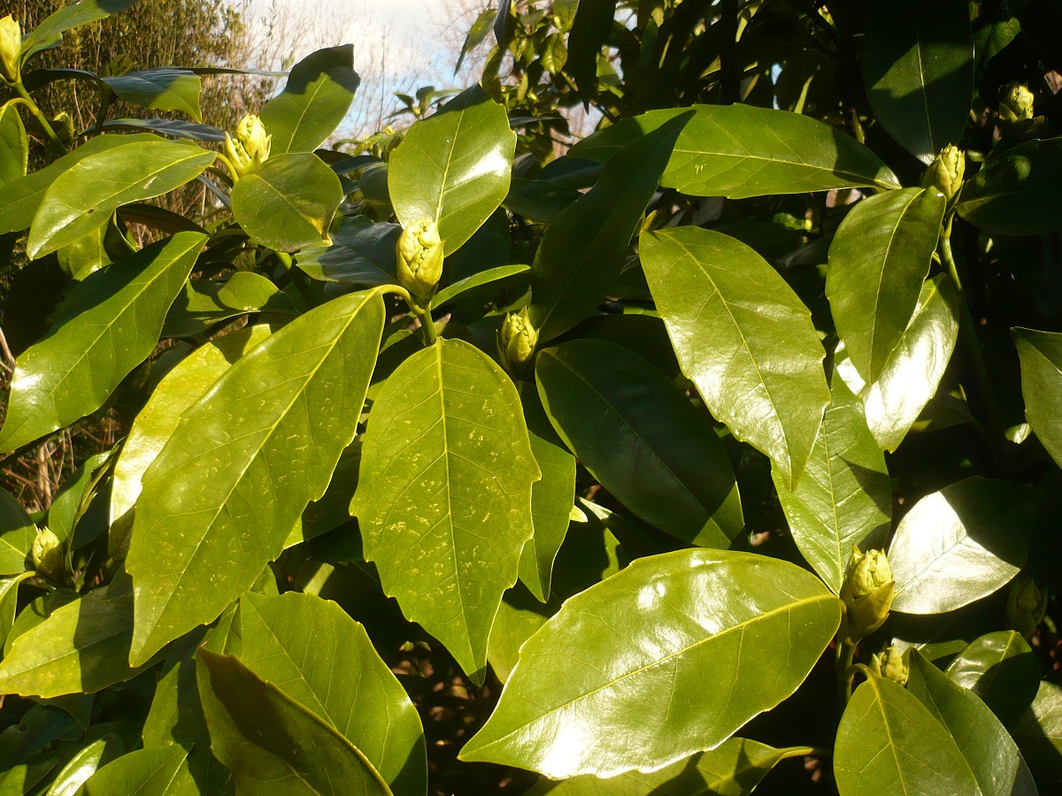 NPh – 1-3 m – Feuilles L de 8-15 cm ovales oblongues ± marbrées, dentées, coriaces, persistantes – Dioïque, fleurs à 4 pétales pourpre foncé – Fruit ovoïde rouge vif à 1 graine