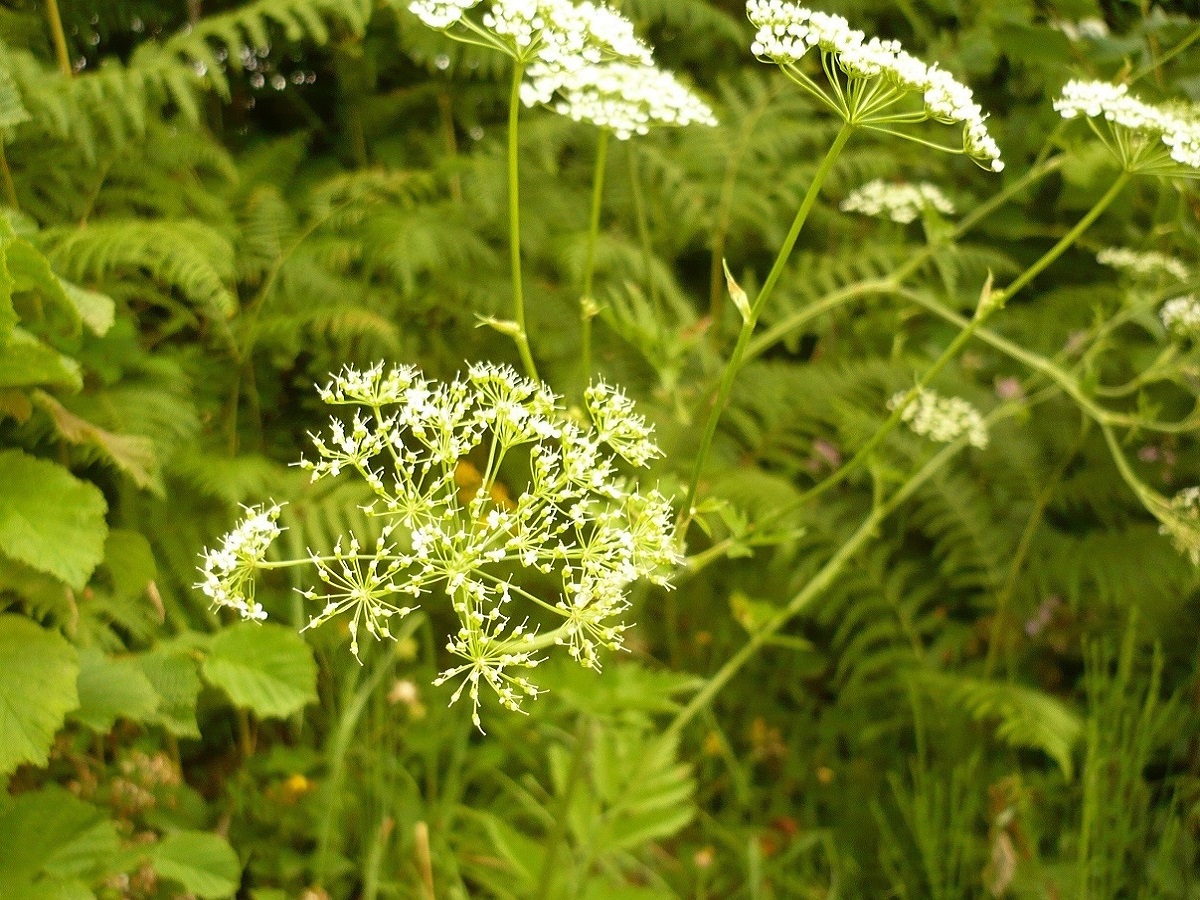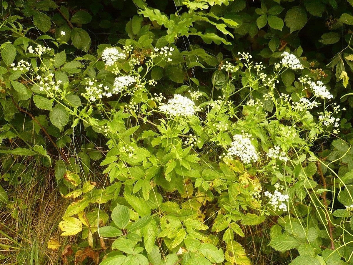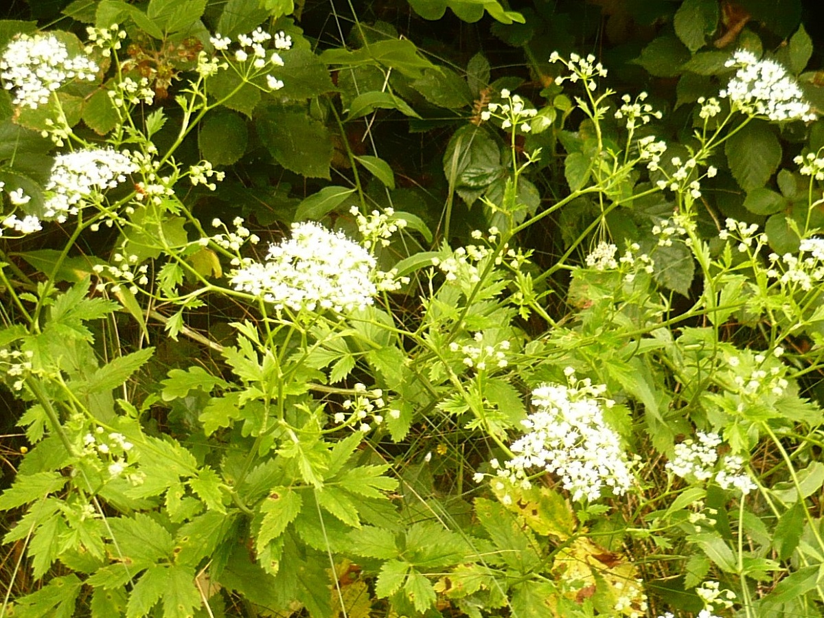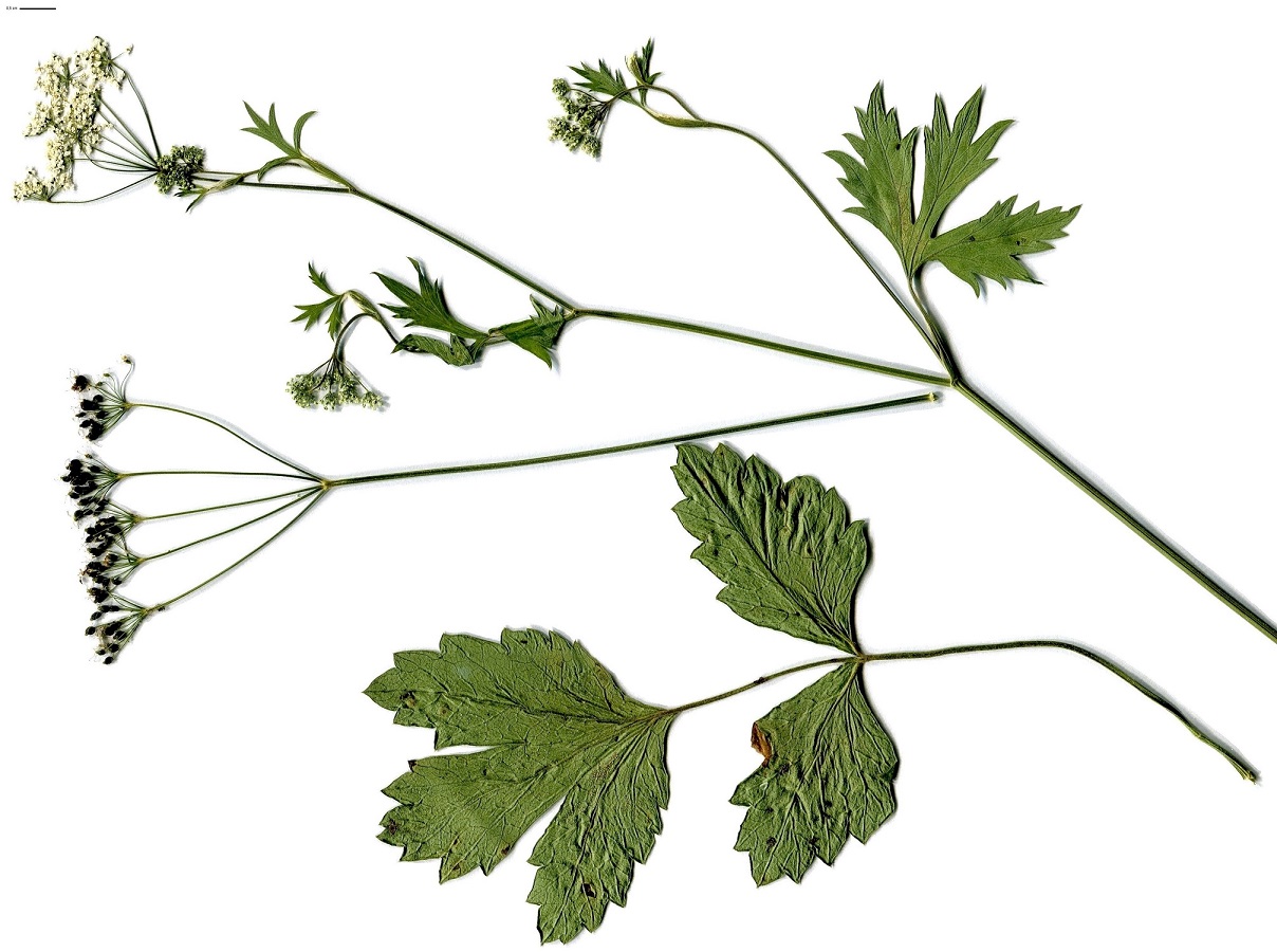 Hc – 5-10 dm – Tige creuse, feuilles pennées à 3-9 segments ovales ± lobés, dentés – 10-25 Rayons, fleurs blanches ou rosées, bractéoles ~ nulles – Fruit de L ≃ 3 mm à côtes blanchâtres