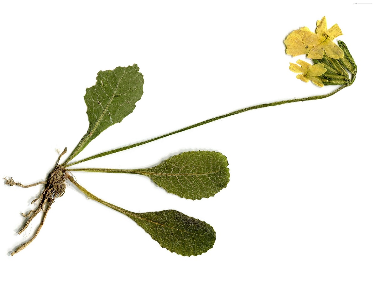 Hc – 1-2 dm – Feuilles L de 5-10 cm obovales gaufrées, crénelées dentées, à face < verte, en rosette – Hampe à fleurs de Ø 1,5-2 cm, à 5 lobes étalés jaune soufre, calice étroit