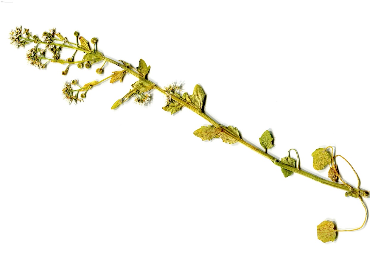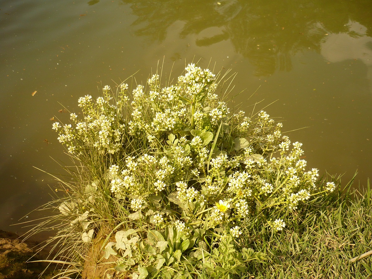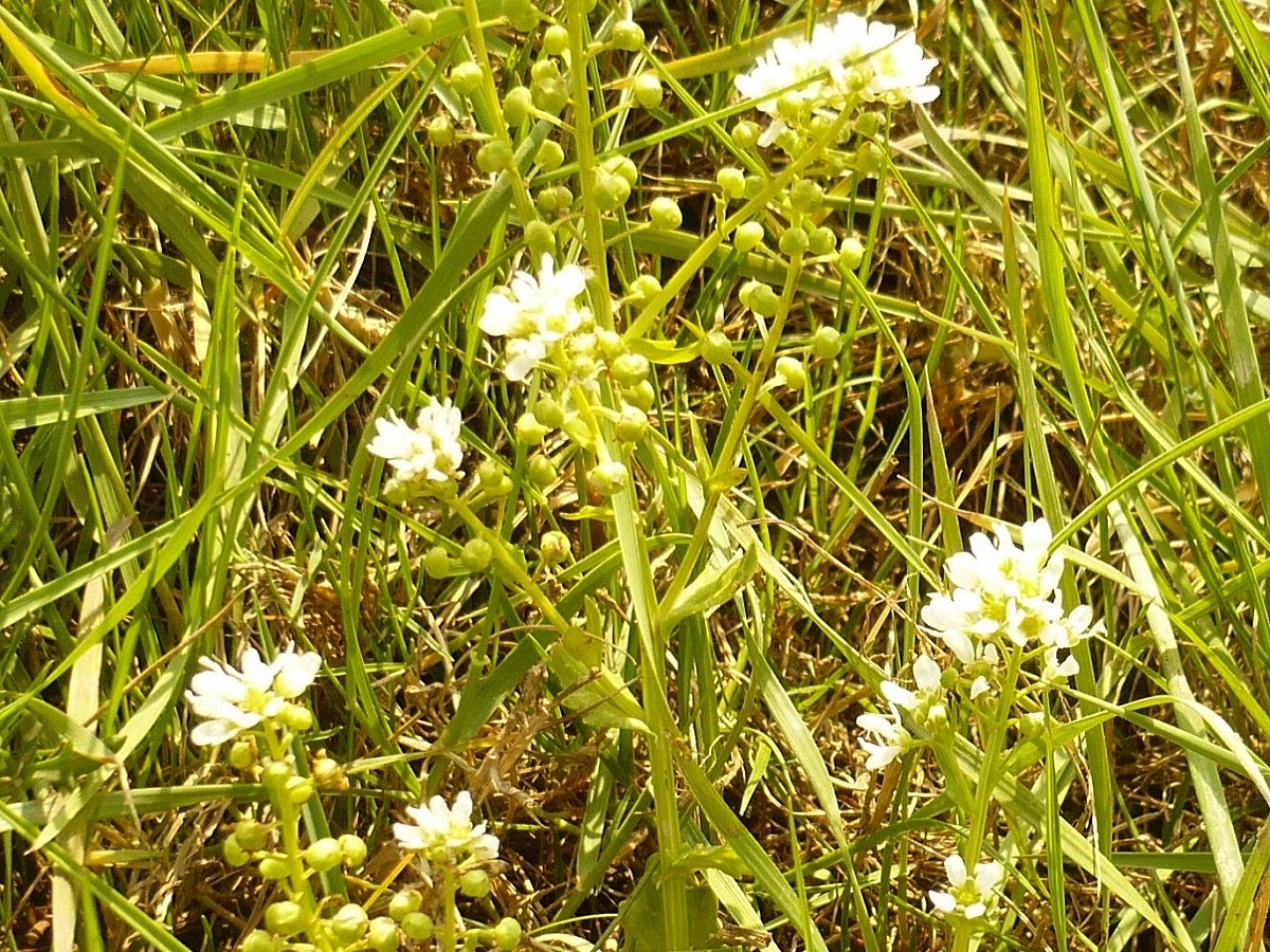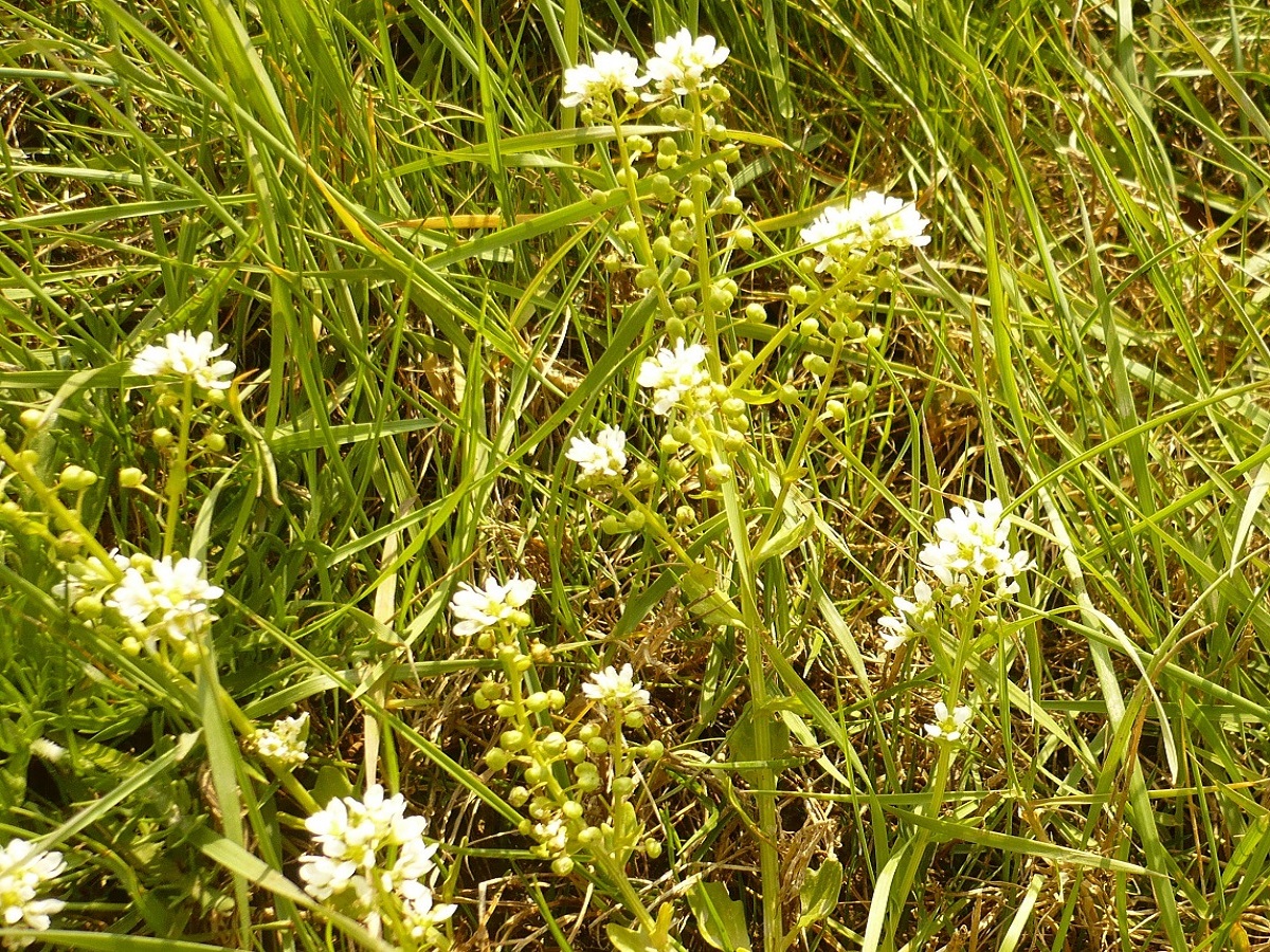 Hc – 2-4 dm – Tige ramifiée, feuilles < pétiolées, > embrassantes ± dentées – Fleurs à 4 pétales blancs, filets staminaux droits – Silicules globuleuses apiculées en grappe → nettement étirée