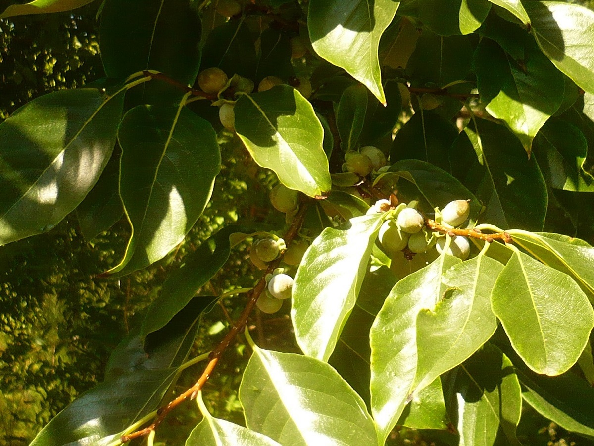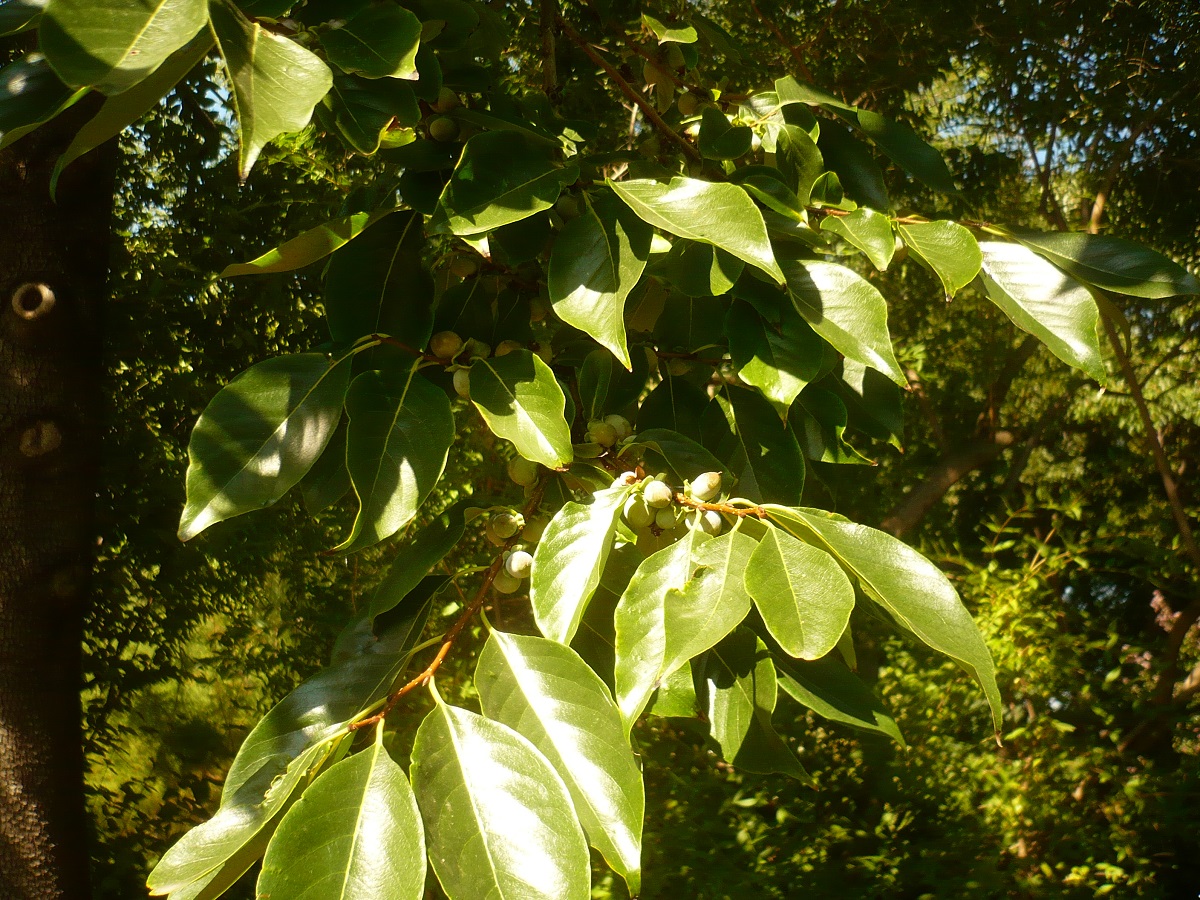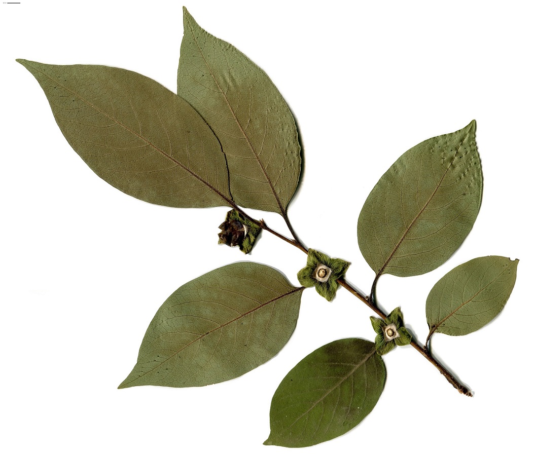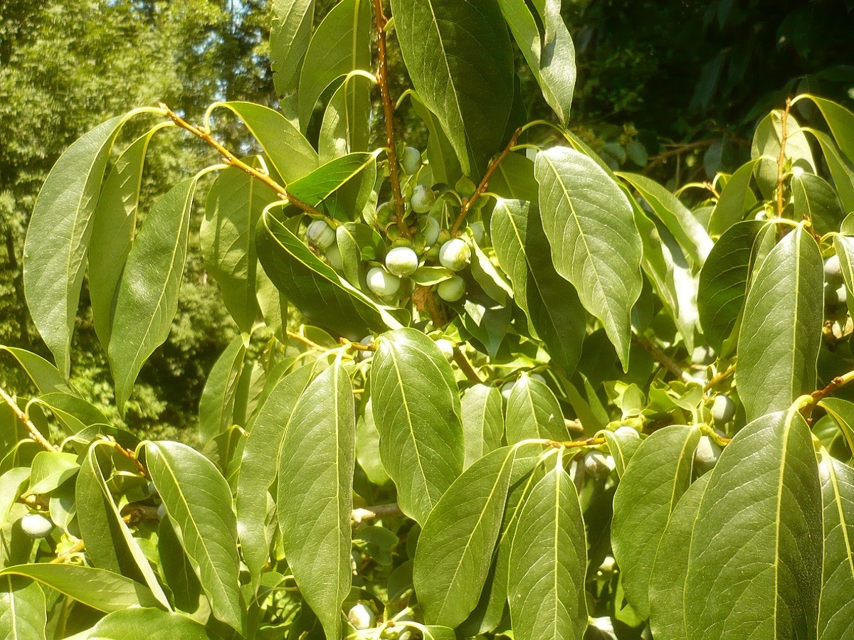 Ph – 2-5 m – Feuilles de L ≃ 10 cm elliptiques acuminées, entières, glauques à l’envers – Fleurs axillaires de Ø ≃ 1 cm verdâtres ♂ ou ♀, calice à 4 lobes étalés – Fruit de Ø 1-2 cm orangé