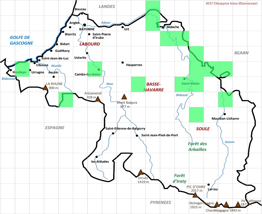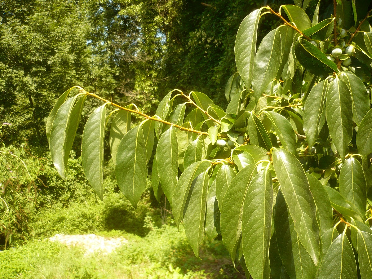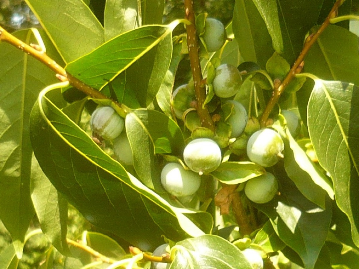 Ph – 2-5 m – Feuilles de L ≃ 10 cm elliptiques acuminées, entières, glauques à l’envers – Fleurs axillaires de Ø ≃ 1 cm verdâtres ♂ ou ♀, calice à 4 lobes étalés – Fruit de Ø 1-2 cm orangé