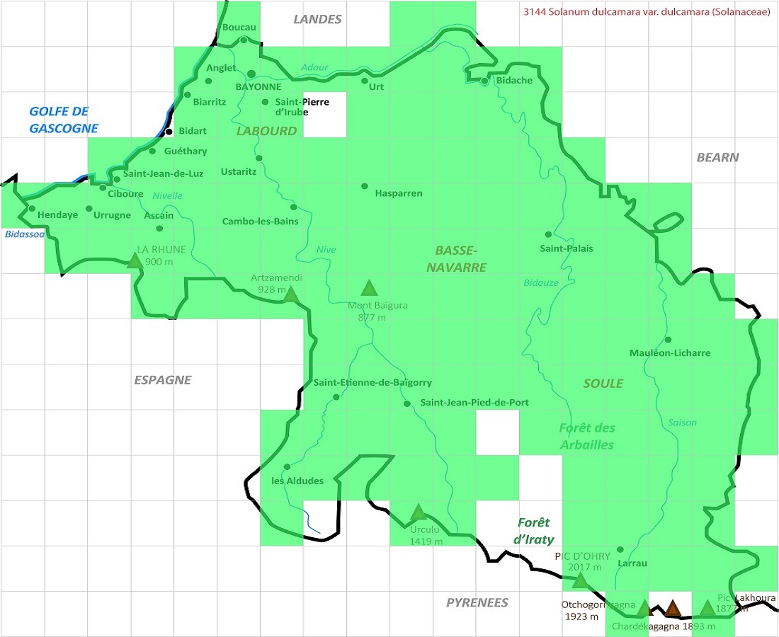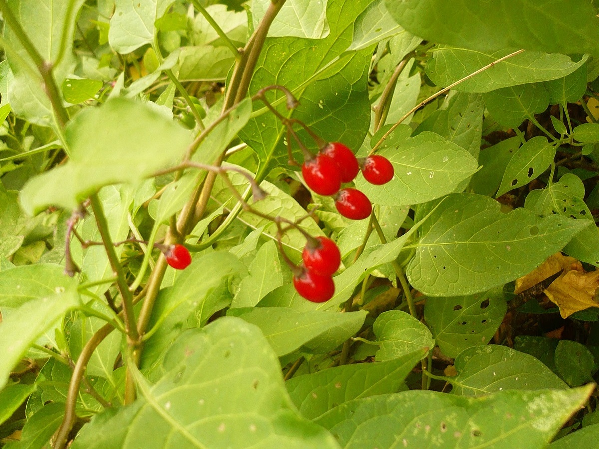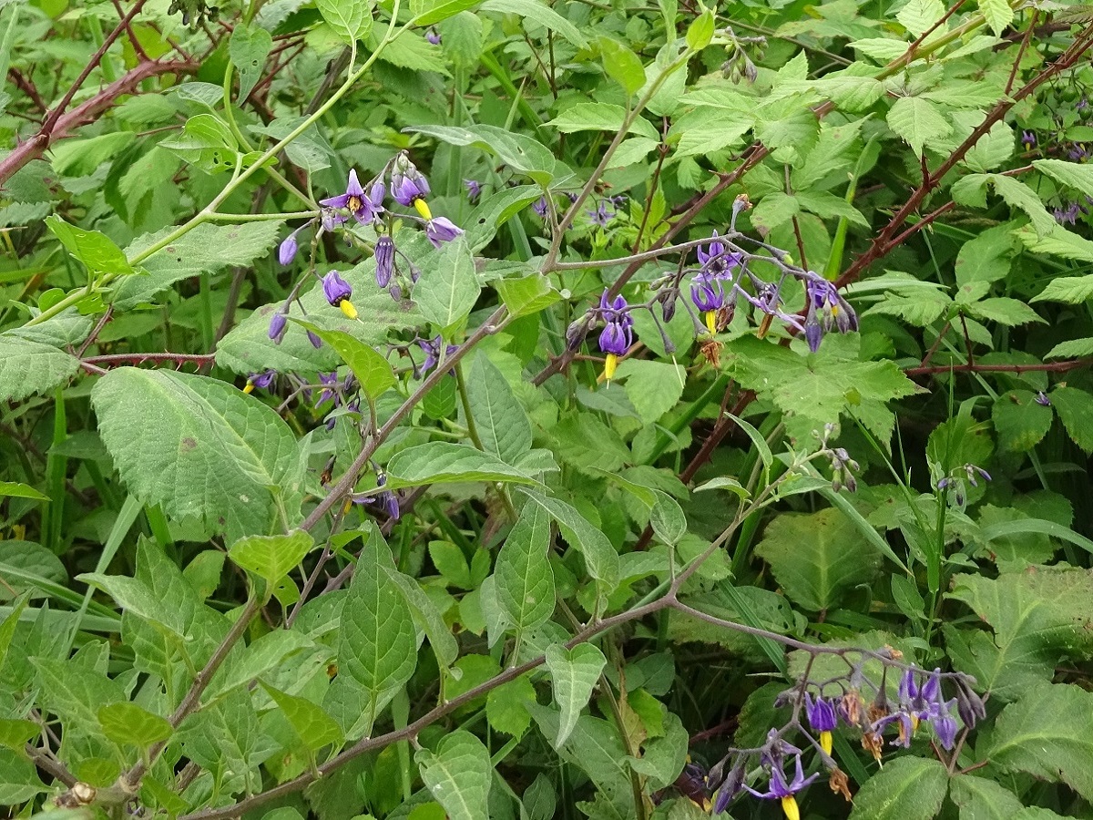 Hc/Ch – 5-15 dm – Volubile, feuilles ovales acuminées ± cordées, lobées à la base – Corolle de Ø 1-1,5 cm violette à lobes récurvés, anthères jaunes – Baie L de 1-1,5 cm ovoïde rouge