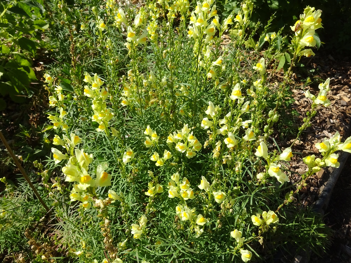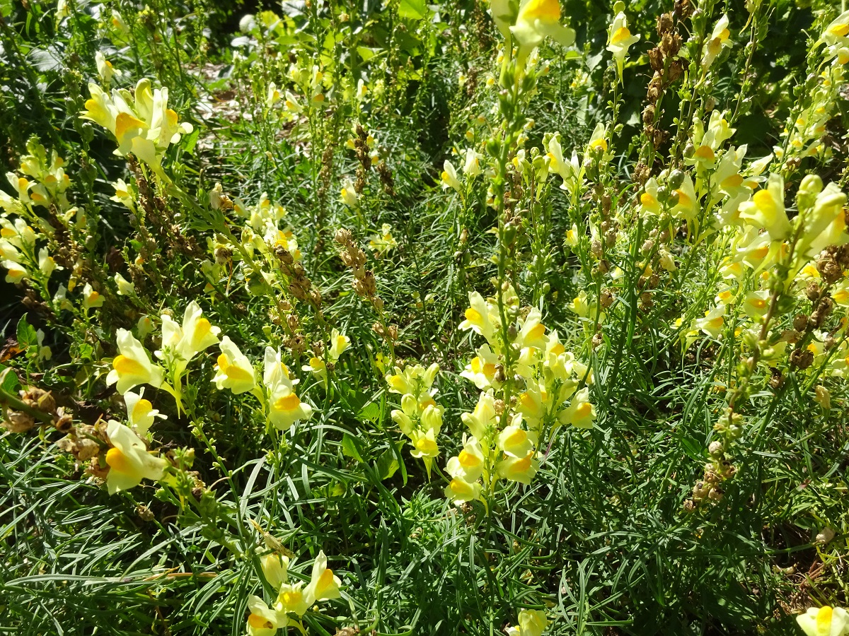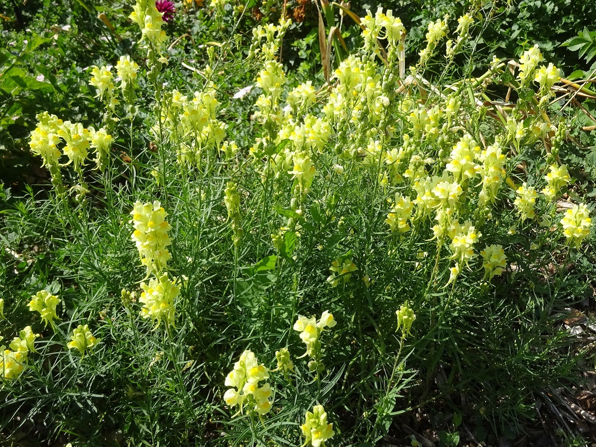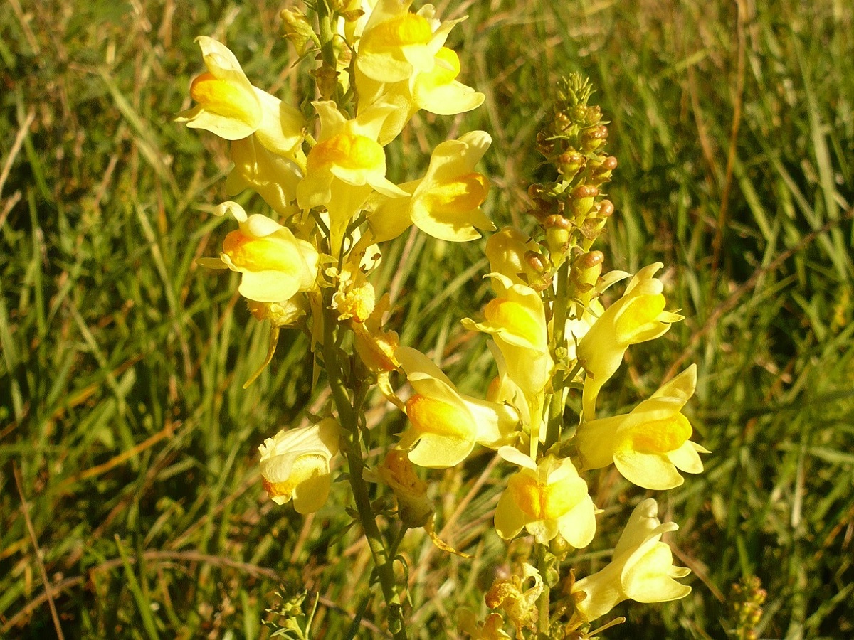 G à drageons – 3-6 dm – Dressée, feuilles nombreuses linéaires mucronées, glauques – Grappe dense, corolle L de 2,5-3 cm jaune, palais orangé, éperon de L ≃ 1 cm ~ droit – Capsule ovoïde