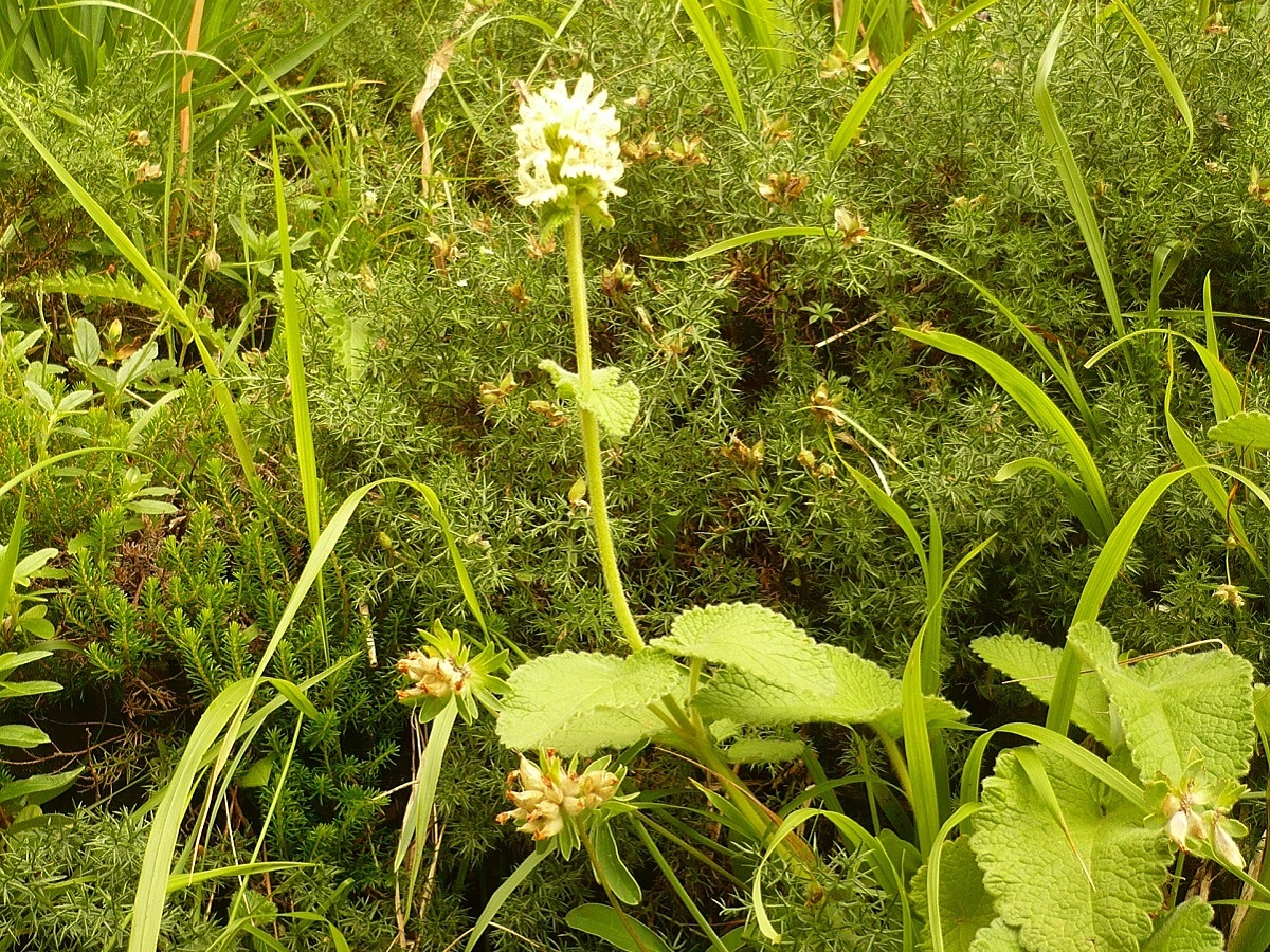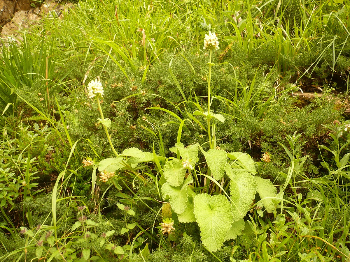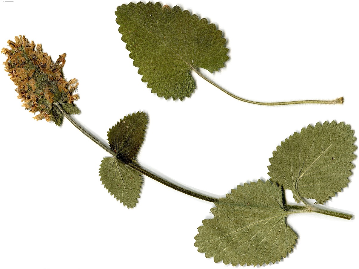 Hc – 2-5 dm – Feuilles de L 4-8 cm épaisses, velues, larges elliptiques cordées crénelées, les < pétiolées – Verticillastres en épi ovoïde dense, corolle bilabiée jaune pâle L de 1,5-2 cm