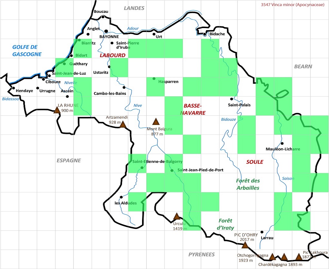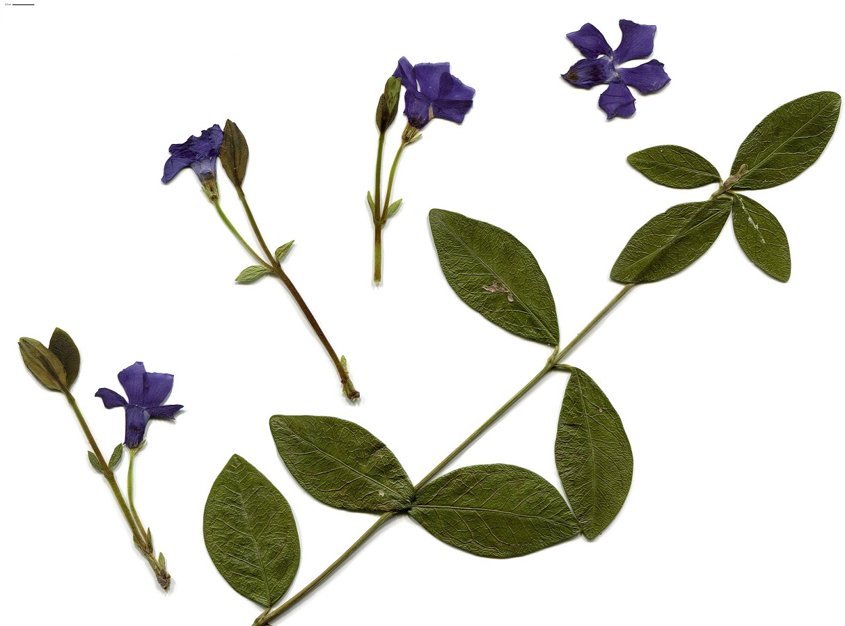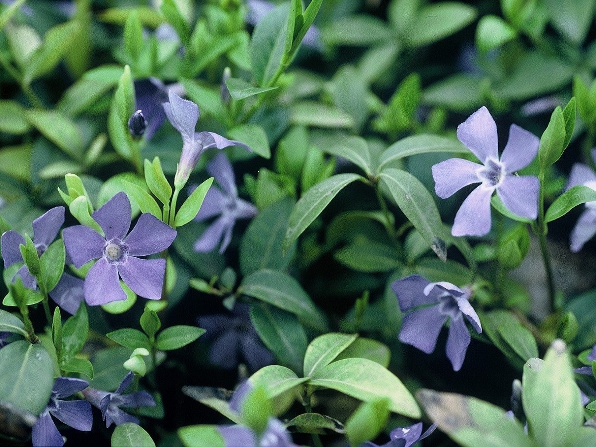 Ch – 1-3 dm – Rampante, feuilles L de 2-4 cm elliptiques lancéolées, coriaces, persitantes – Fleurs bleu violet de Ø 2,5-3 cm à tube de L ≃ 1 cm et 5 lobes formant une hélice, pédicelle long