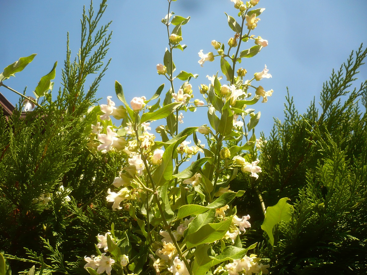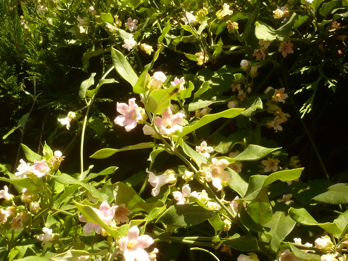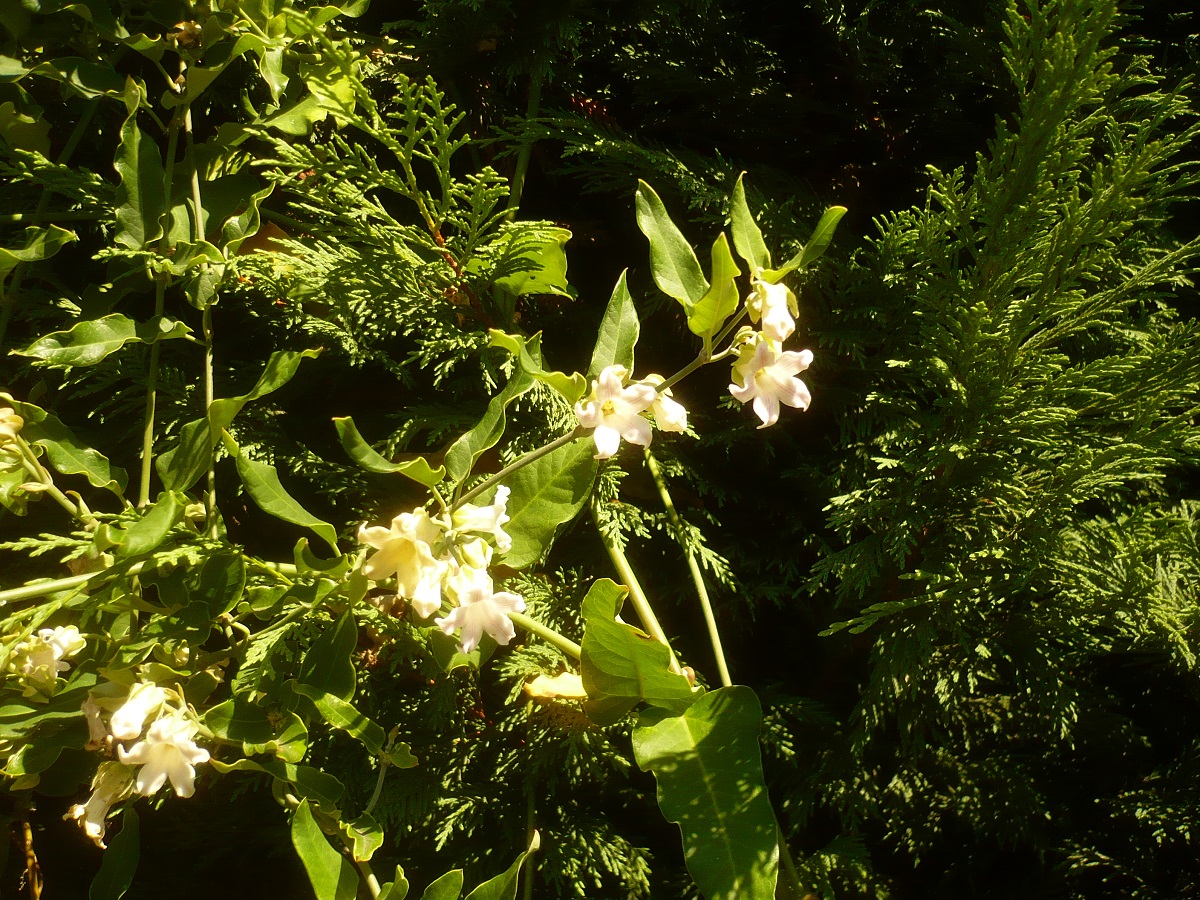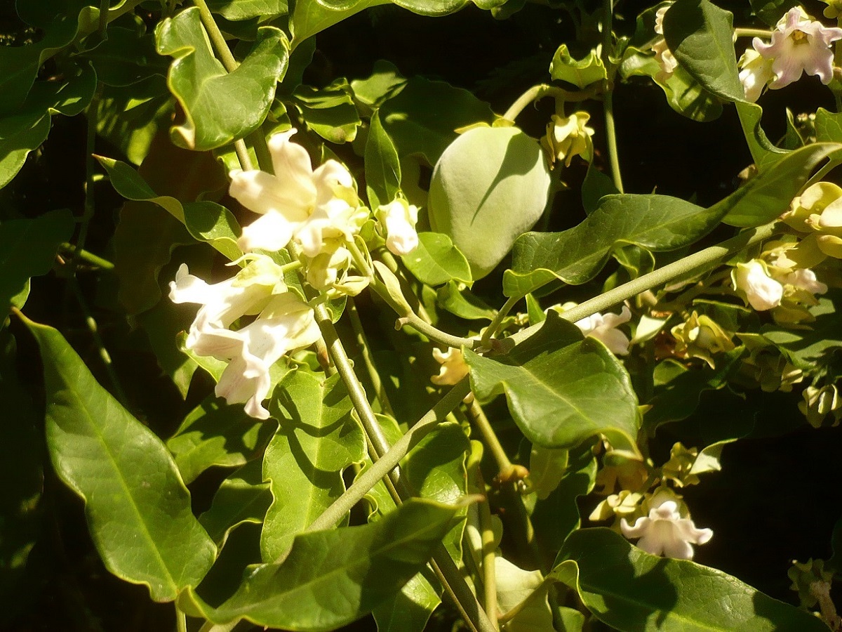 NPh/Ph L – 2-10 m – Feuilles tronquées auriculées, ondulées, coriaces, envers blanchâtre – Fleurs blanches odorantes de Ø ≃ 2 cm évasées à 5 lobes – Fruit gros soyeux, graines plumeuses