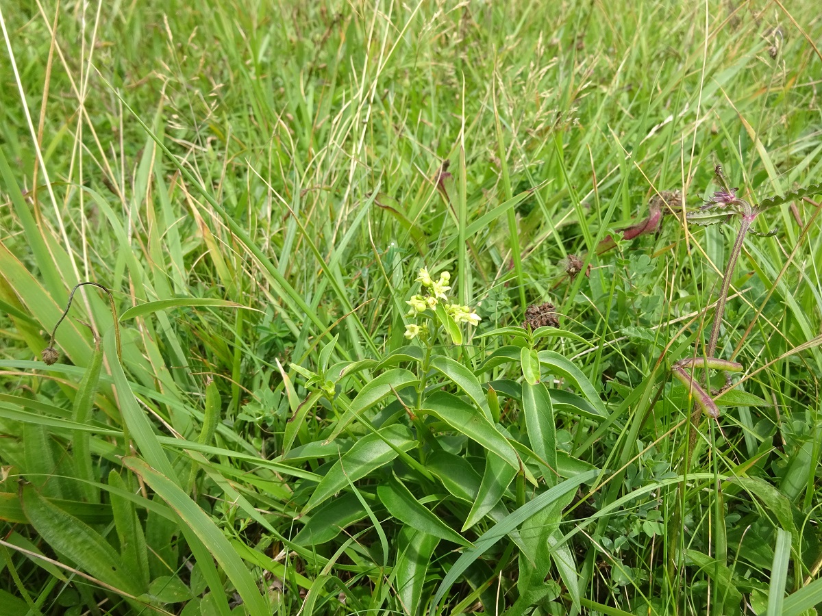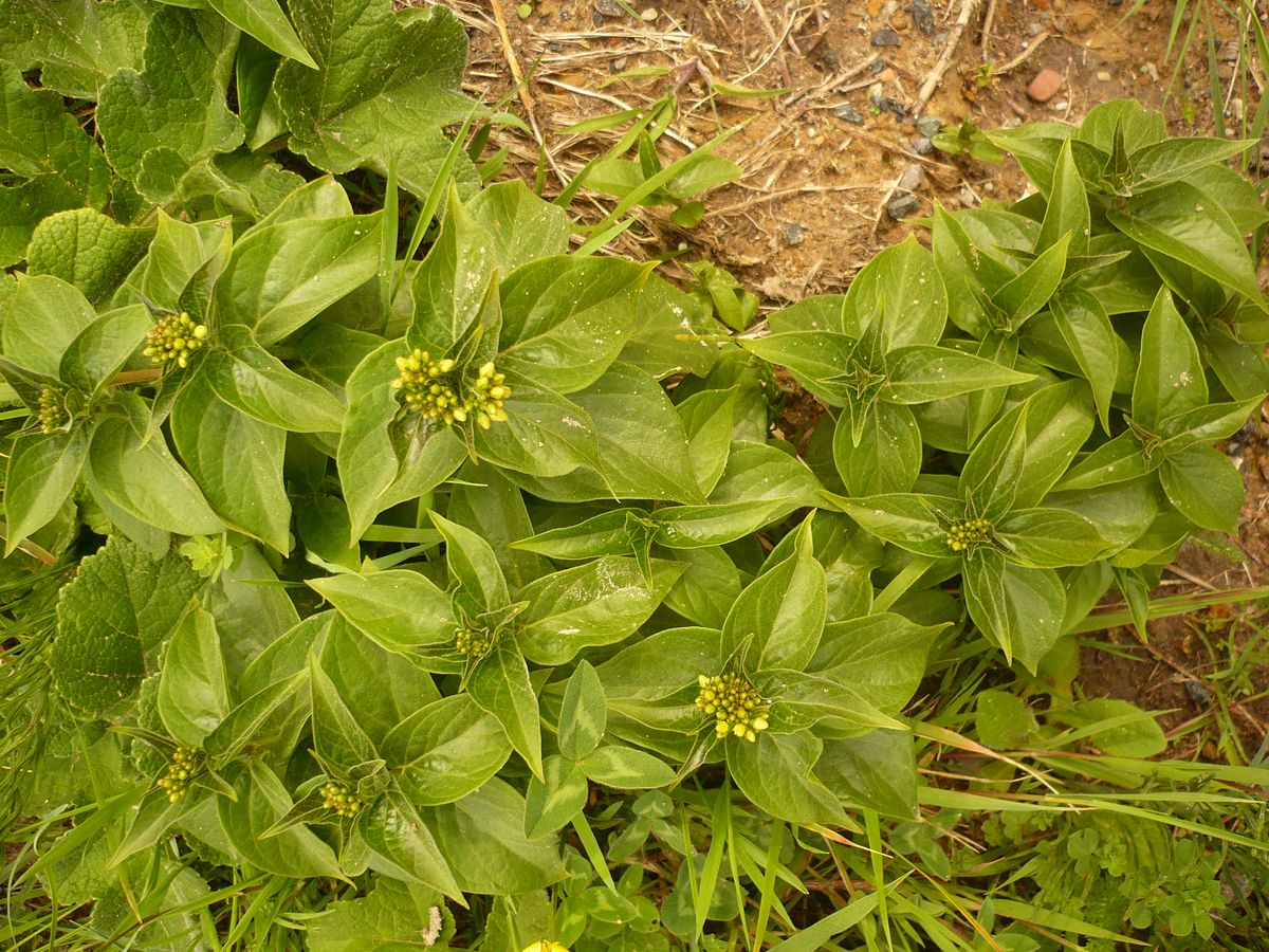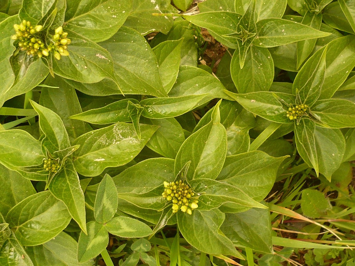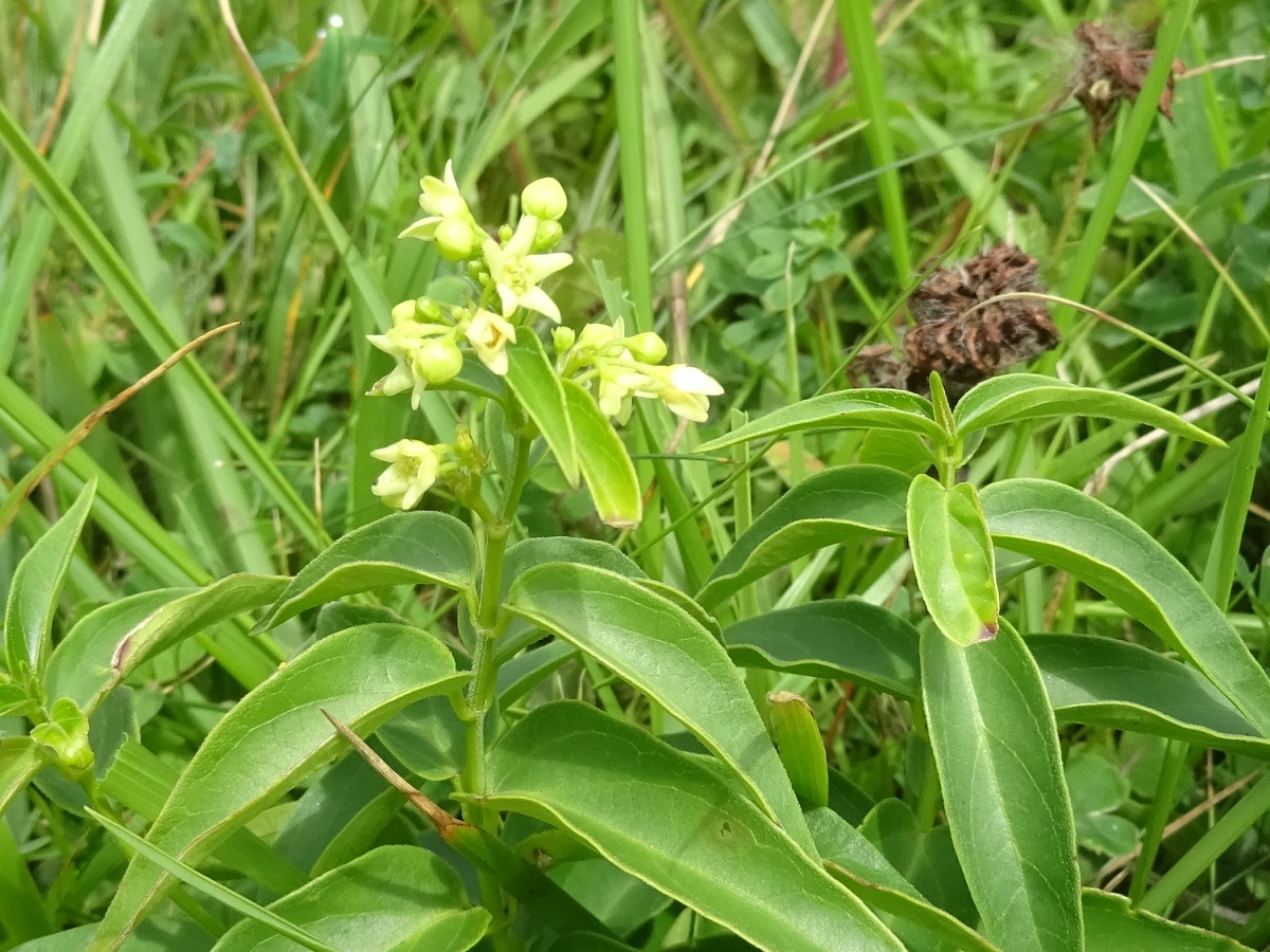 Hc – 0,5-2 dm – Feuilles ovales à lancéolées acuminées, épaisses, serrées, opposées – Cymes de 6-8 fleurs de Ø 3-4 mm à 5 lobes obtus blanc-jaunâtre – Fruit renflé en fuseau