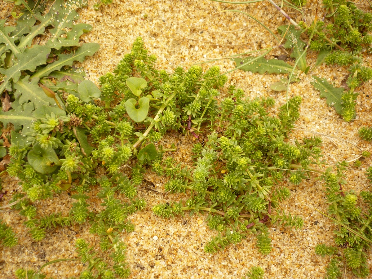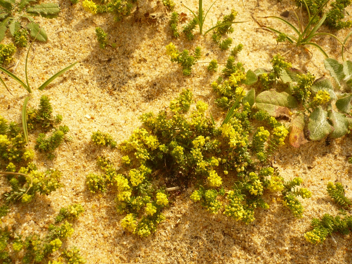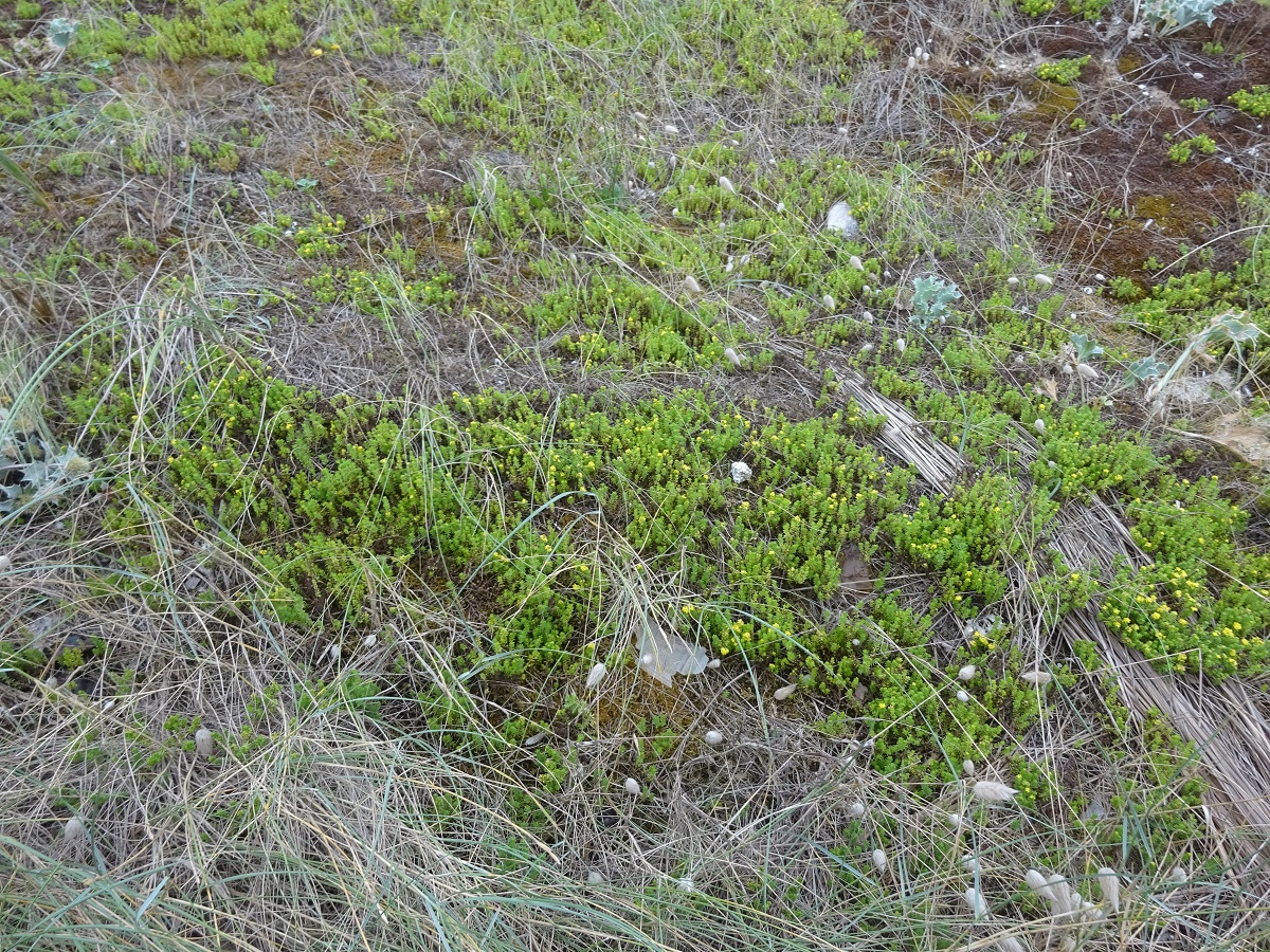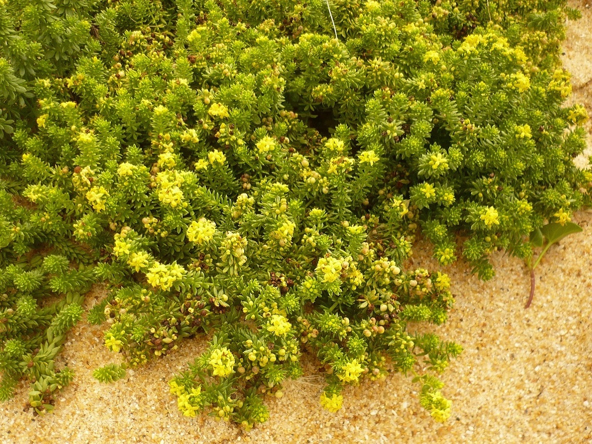 G à rhizome – 0,5-1,5 dm – Prostrée, « feuilles » obovales charnues L de 3-8 mm, très serrées – Têtes denses de fleurs de Ø 3-4 mm jaune d’or à 4 lobes aigus – Fruit de Ø ≃ 3 mm ± charnu