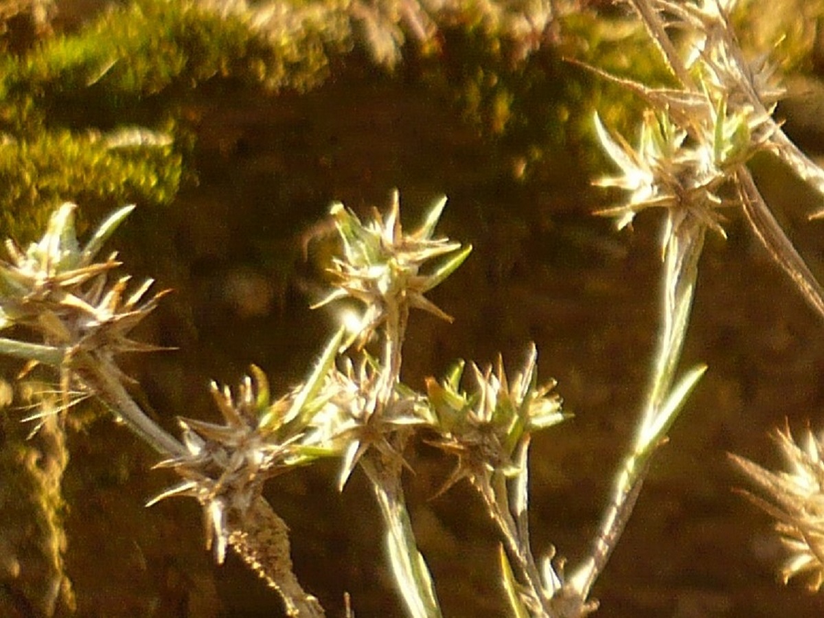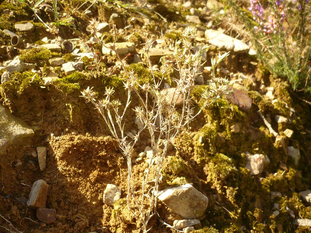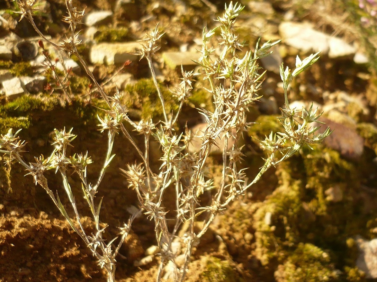 Th – 0,5-2,5 dm – Grisâtre ramifiée, feuilles L de 1,5-2,5 cm en alêne, raides – Glomérules (< feuilles) sessiles de 2-14 capitules de L ≃ 3 mm ovoïdes à 5 angles, bractées à base très renflée