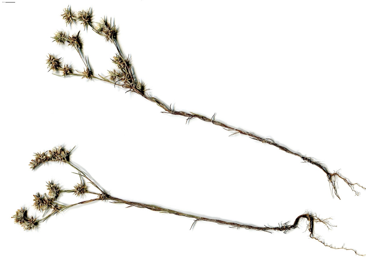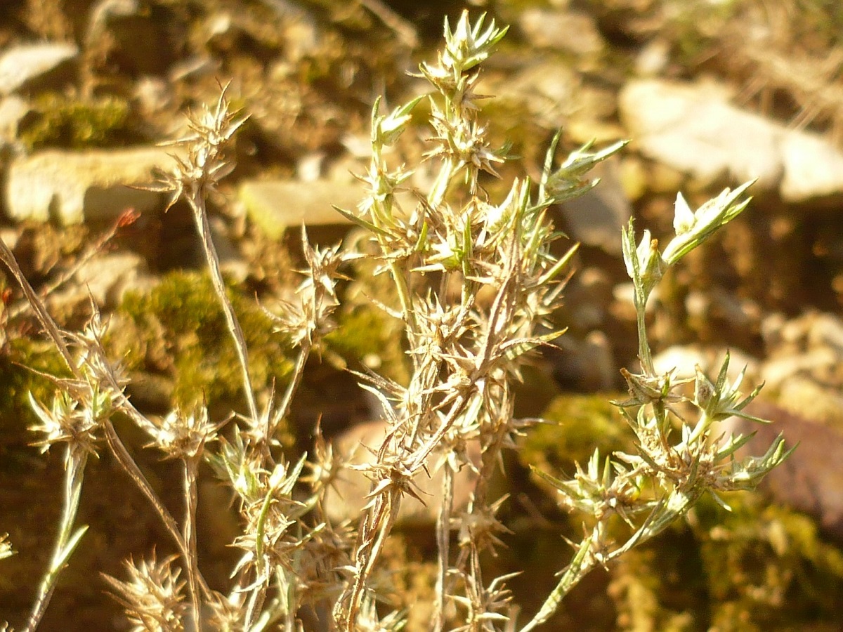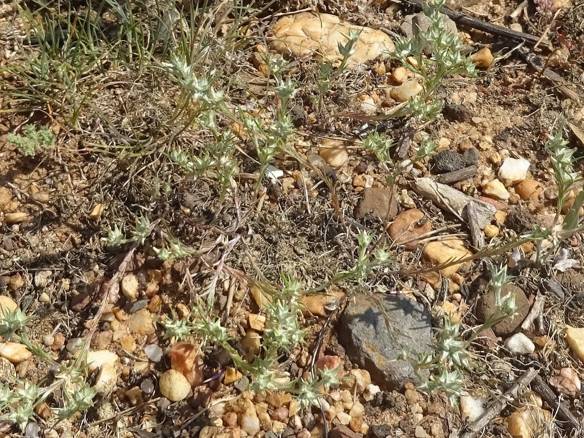 Th – 0,5-2,5 dm – Grisâtre ramifiée, feuilles L de 1,5-2,5 cm en alêne, raides – Glomérules (< feuilles) sessiles de 2-14 capitules de L ≃ 3 mm ovoïdes à 5 angles, bractées à base très renflée