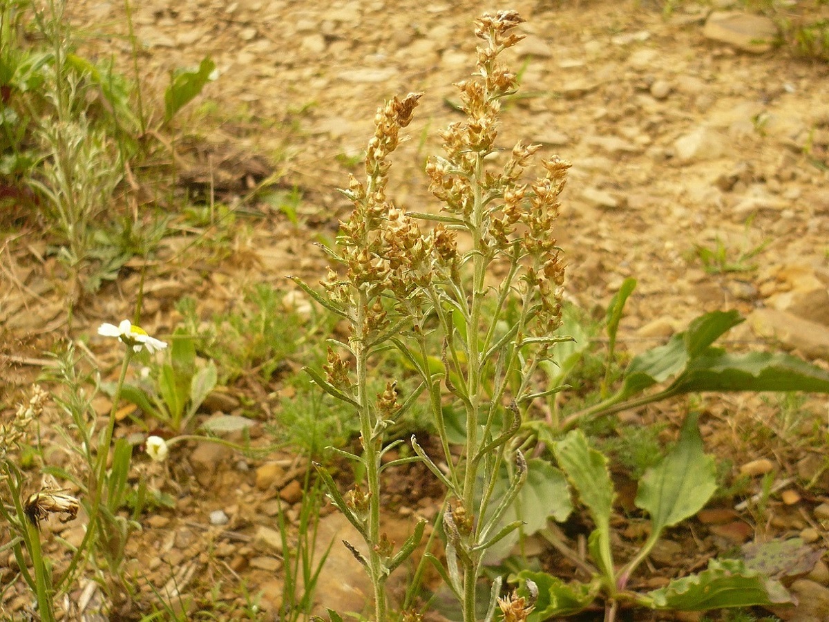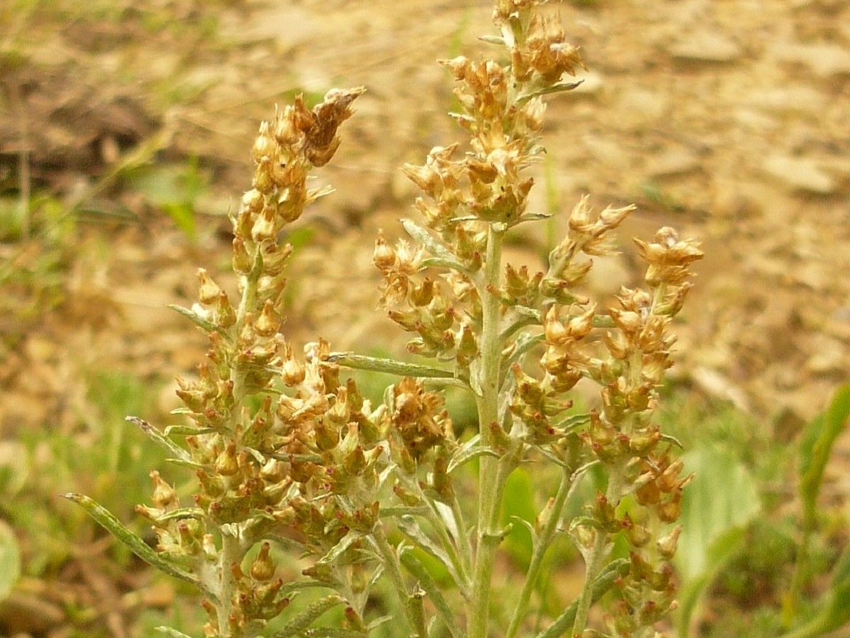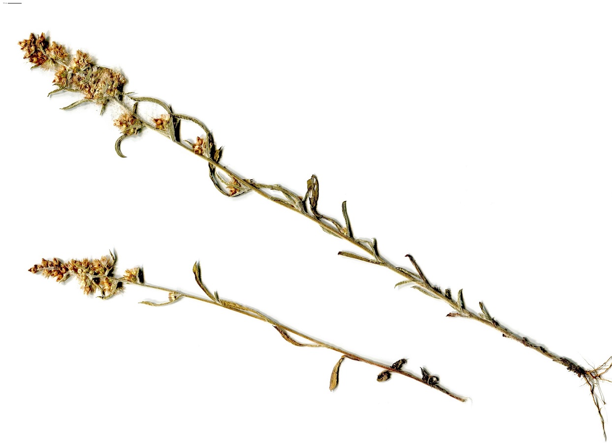 Th– 2-4 dm – Feuilles velues grisâtres spatulées à linéaires ± en faux, les < fugaces – Inflorescence étirée, capitules ovoïdes L de 3-3,5 mm, à 2-5 fleurons jaunâtres ± rosés