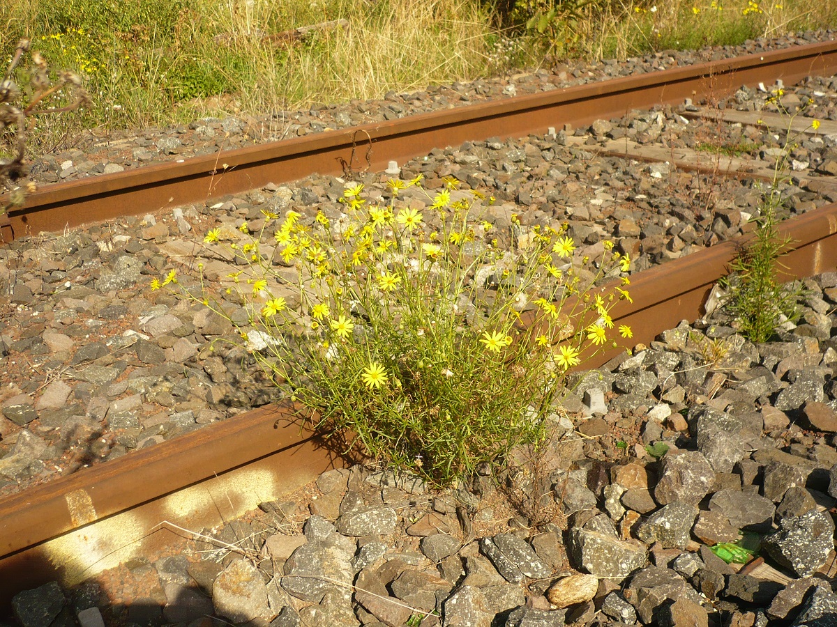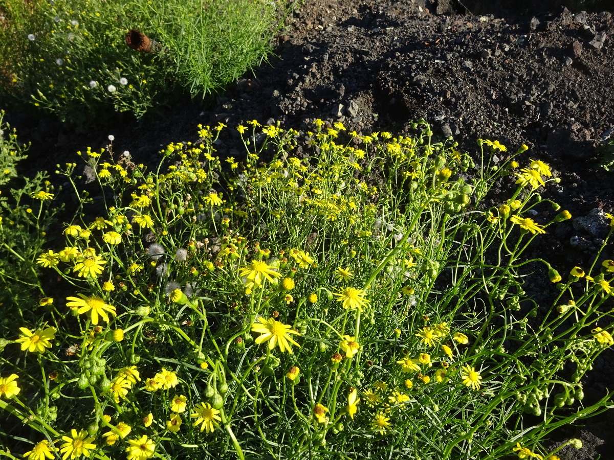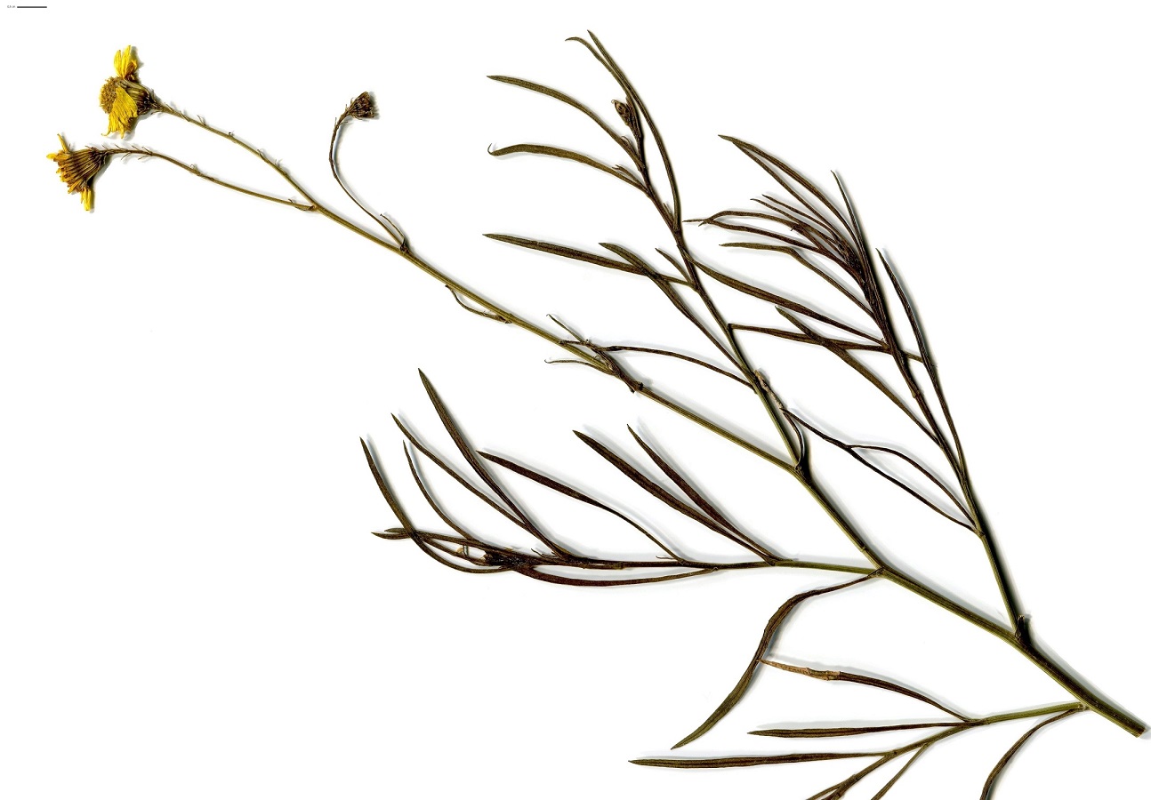 Hc/Ch – 4-8 dm – Feuilles simples linéaires de l ≃ 1 mm, denticulées, révolutées, auriculées – Capitules de Ø ≃ 2 cm en corymbe, fleurons et hémiligules jaunes, bractées à marge fimbriée