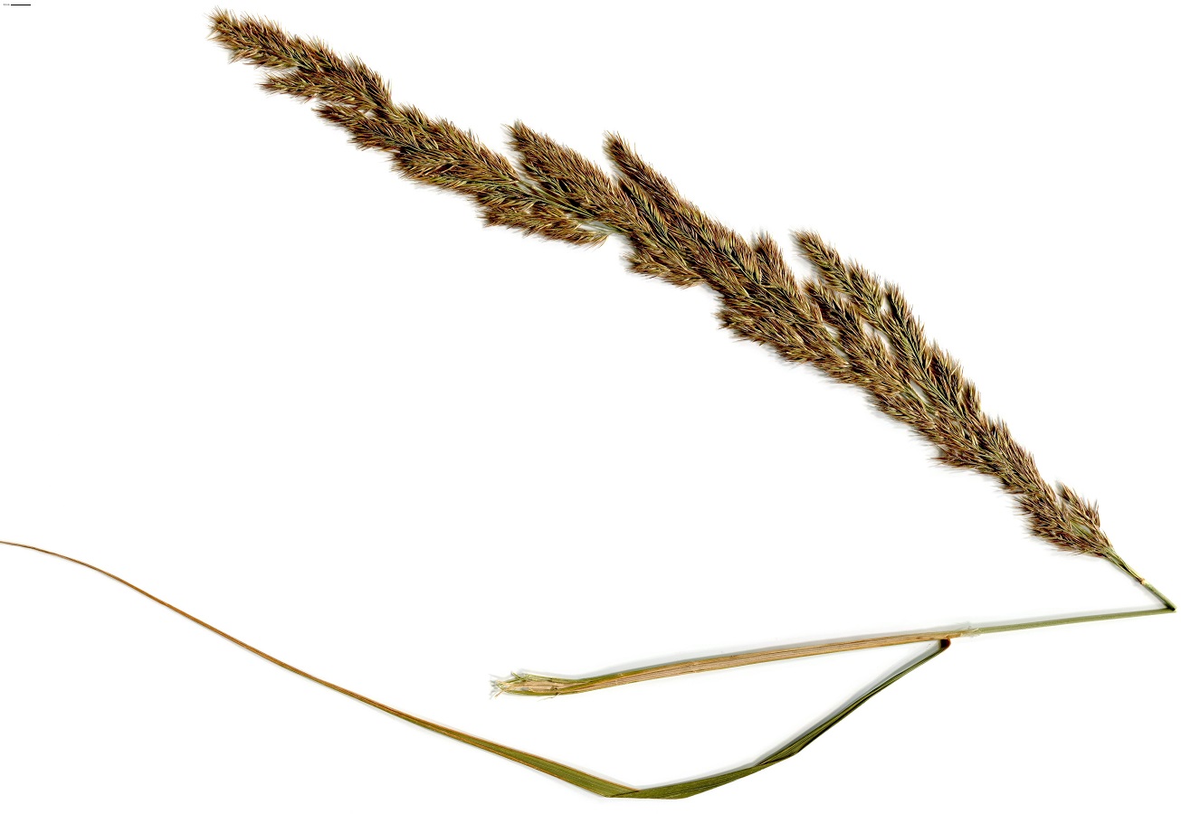 G à rhizome/Hc – 8-12 dm – Feuilles effilées, rudes dessus, ligule longue, aiguë – Panicule argentée à violacée dense à étalée, ± arquée, arête + longue que la lemme à poils longs