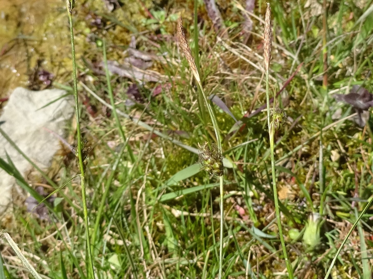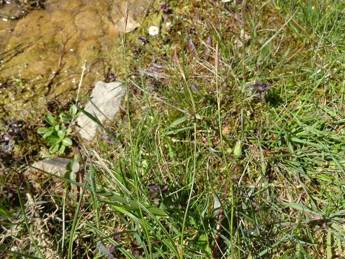 Hc – 4-10 dm – Feuilles pliées en V, gaines basales orangées – 1 Épi > ♂ fusiforme, 2-4 épis < ♀ distants, écailles ovales, pourpre foncé, 3 stigmates – Utricules de L ≃ 4 mm binervés
