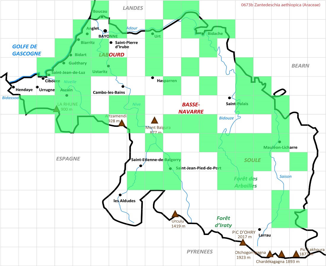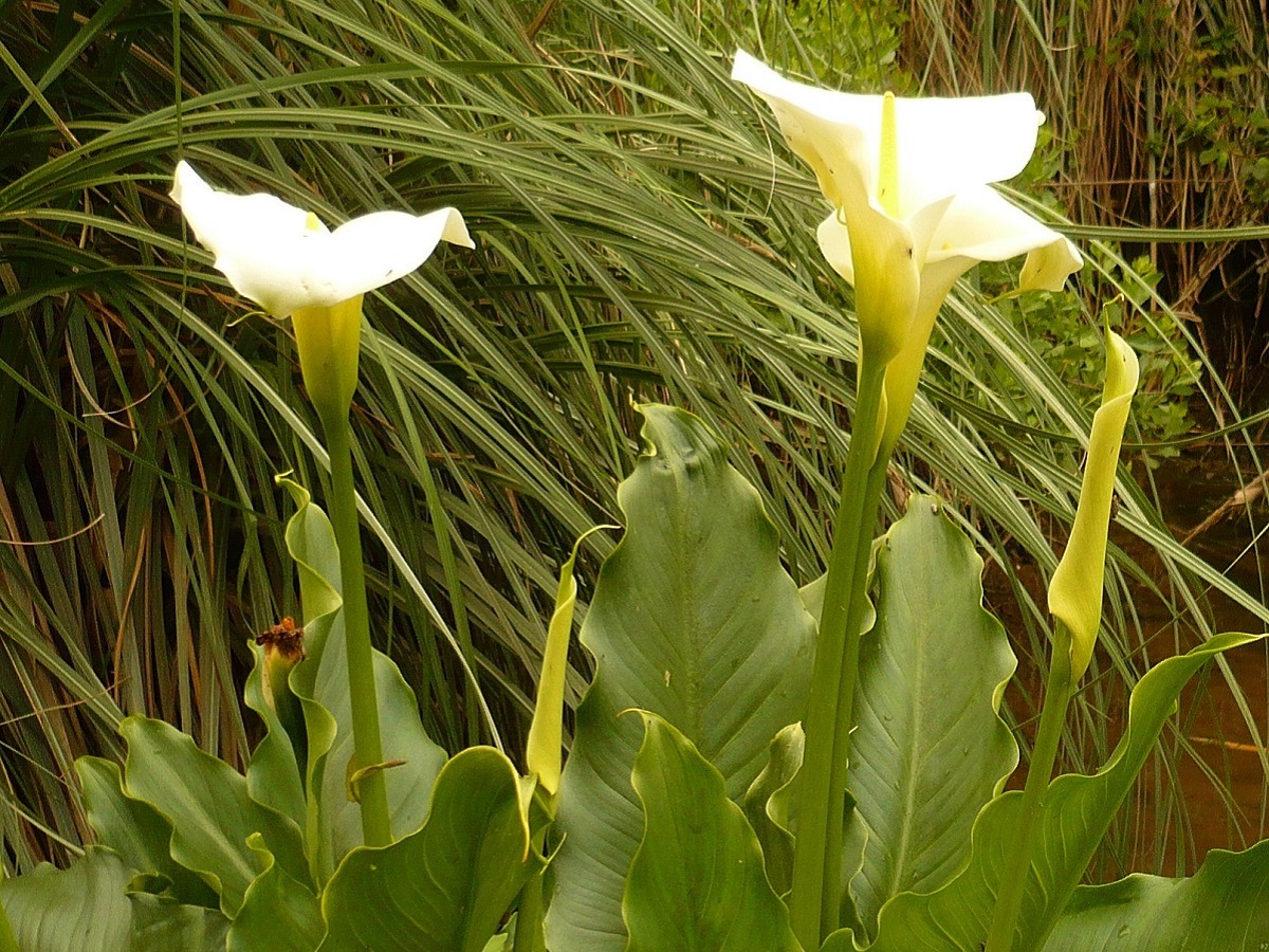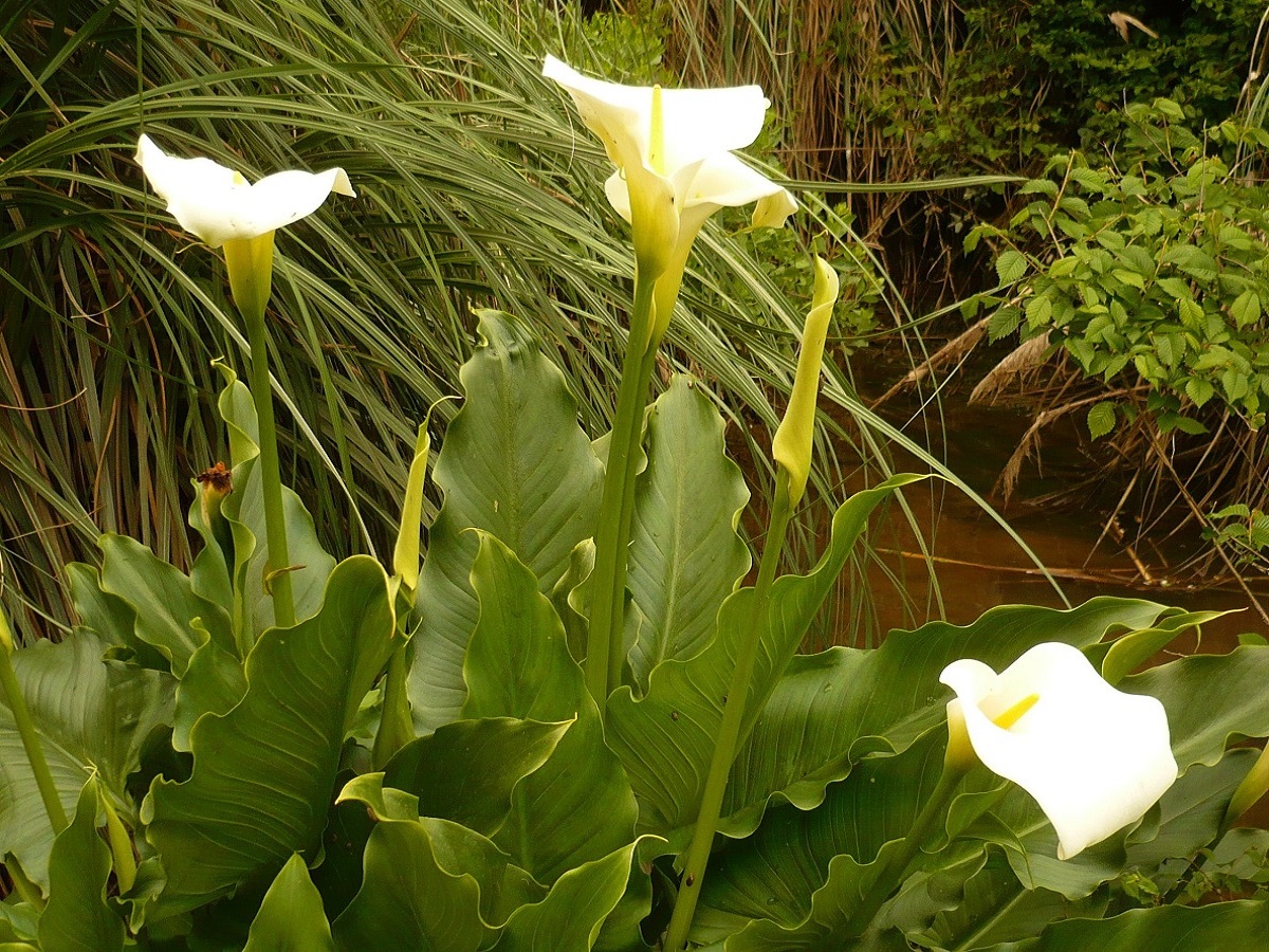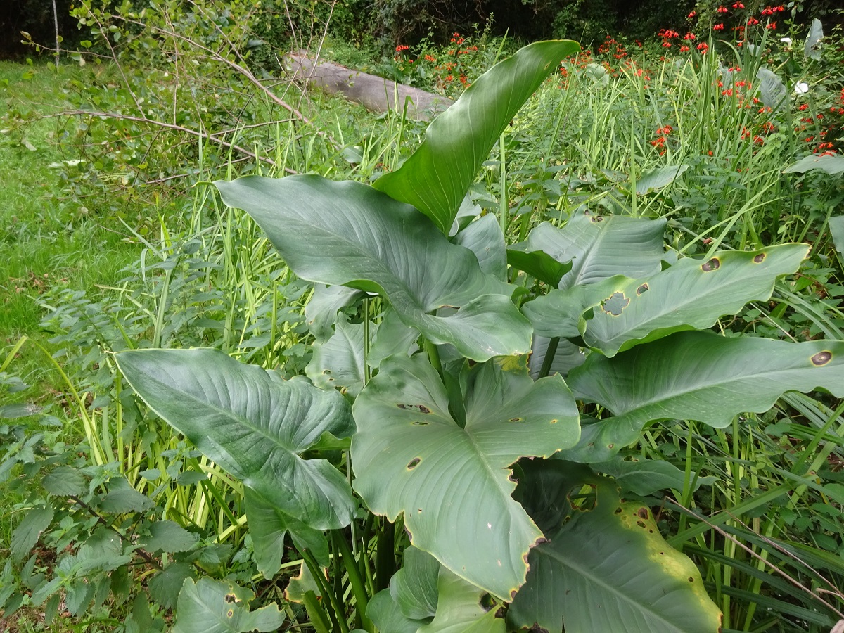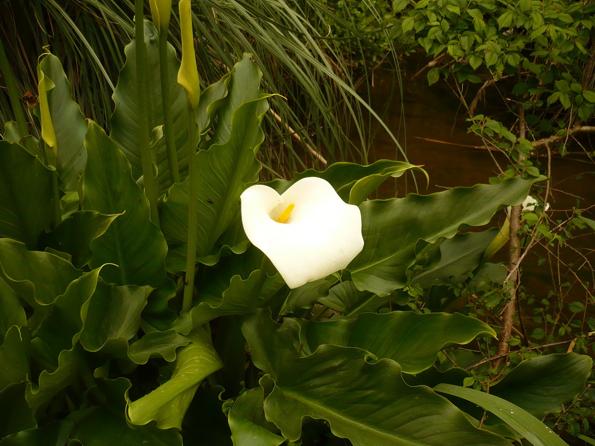 G à rhizome – 5-10 dm – Feuilles grandes (L → 50 cm), sagittées, pétiolées – Spathe blanche en entonnoir ≃ 15 cm, spadice subcylindrique jaune crème – Baies orangées en épi ovoïde