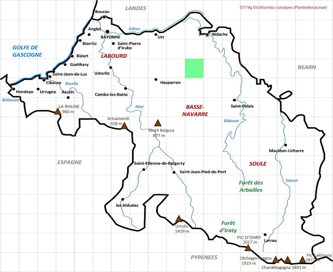 Hydr Hc – 1-3 dm – Feuilles de L 5-10 cm elliptiques larges à nervures parallèles, pétiole dilaté en flotteur, racines immergées – Fleurs de L ≃ 3 cm en épi, à 6 pétales lilacés, le > à oeil jaune