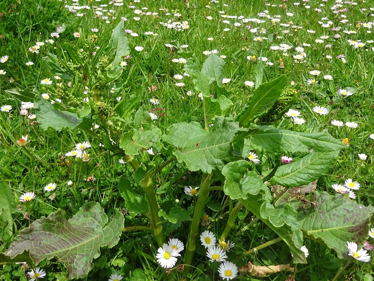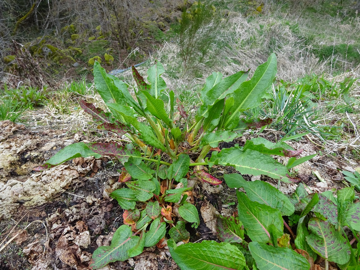 Hc – 4-12 dm – Feuilles (limbe de L < 3 dm) ovales oblongues ± cordées ondulées ± crispées – Inflorescence feuillée – Valves en triangle de L < 5,5 mm, à dents > 0,5 mm, à 1 granule basal