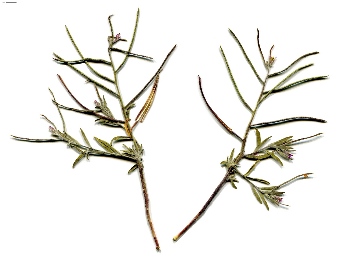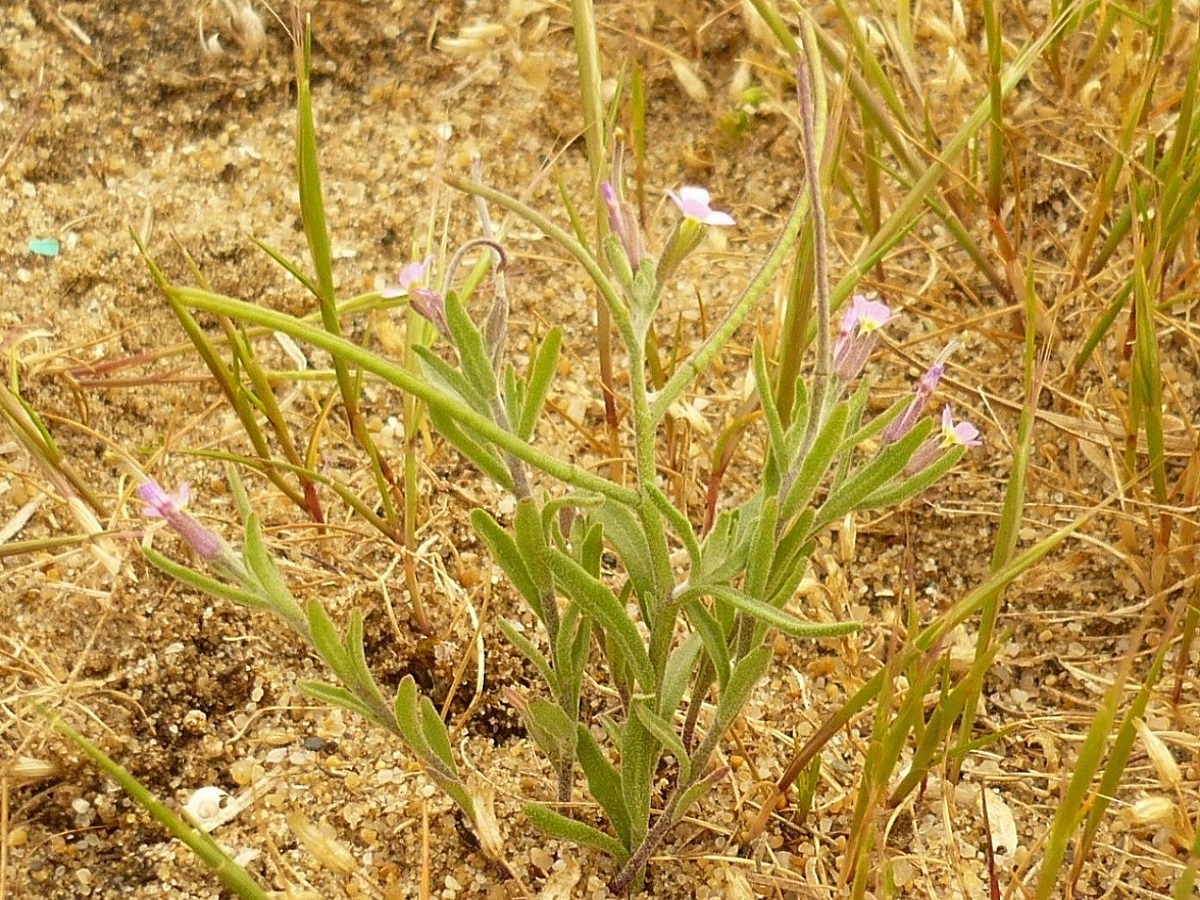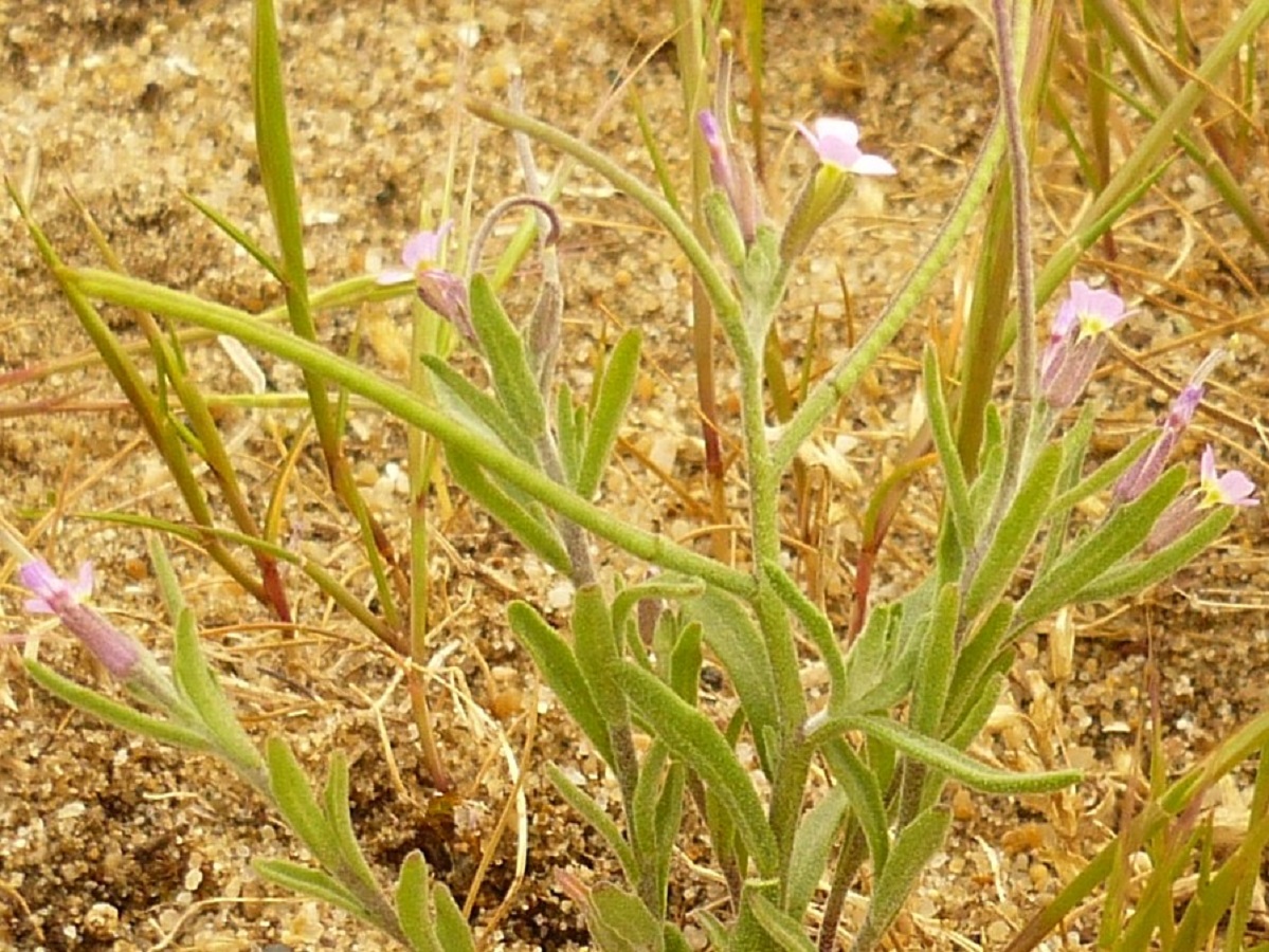 Th – 0,5-2 dm – Raide, velue, feuilles lancéolées entières – Grappe lâche de petites fleurs à 4 pétales entiers rose violacé, stigmate à lobes aigus – Siliques de L ≃ 3 cm cylindriques ± écartées