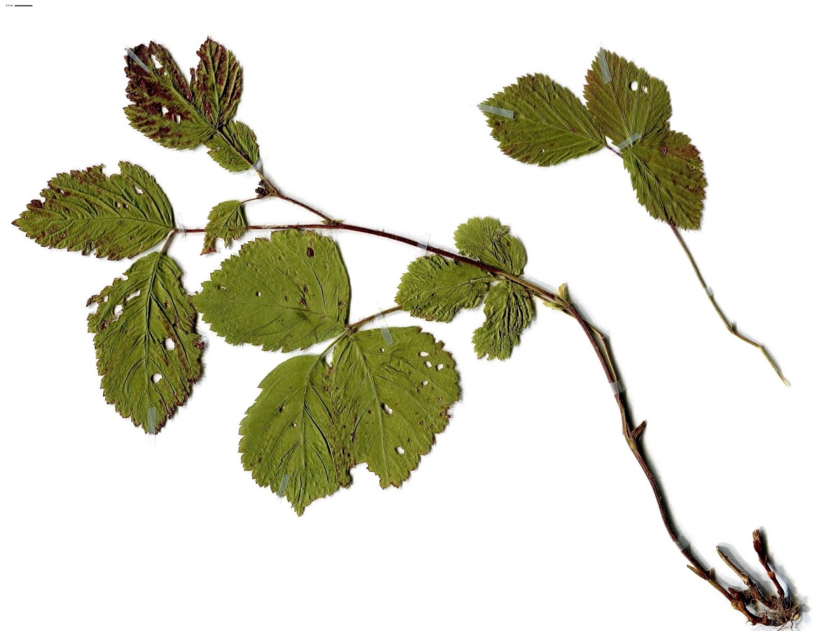Hc/Ch – 2-10 dm – Tige faible ± herbacée à fins aiguillons, feuilles à 3 folioles ovales dentées – Assez petites fleurs blanches en corymbe par 3-8 – Drupéoles écarlates peu nombreuses