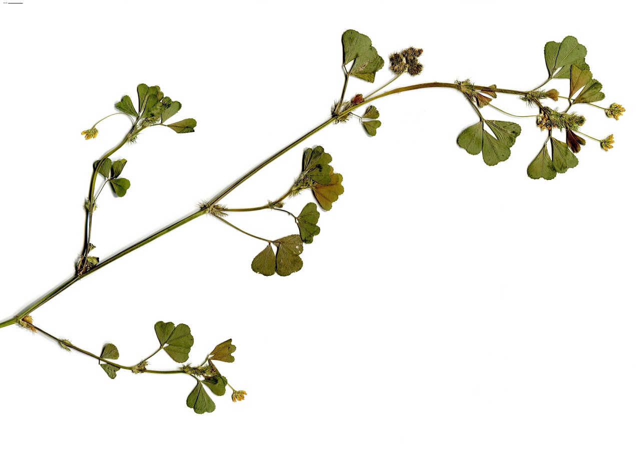 Th – 2-5 dm – 3 Folioles larges échancrées, à face > glabre, stipules laciniées – Grappes à long pédoncule de 1-8 fleurs, corolle jaune L de 3-5 mm – Gousse spiralée, épines crochues