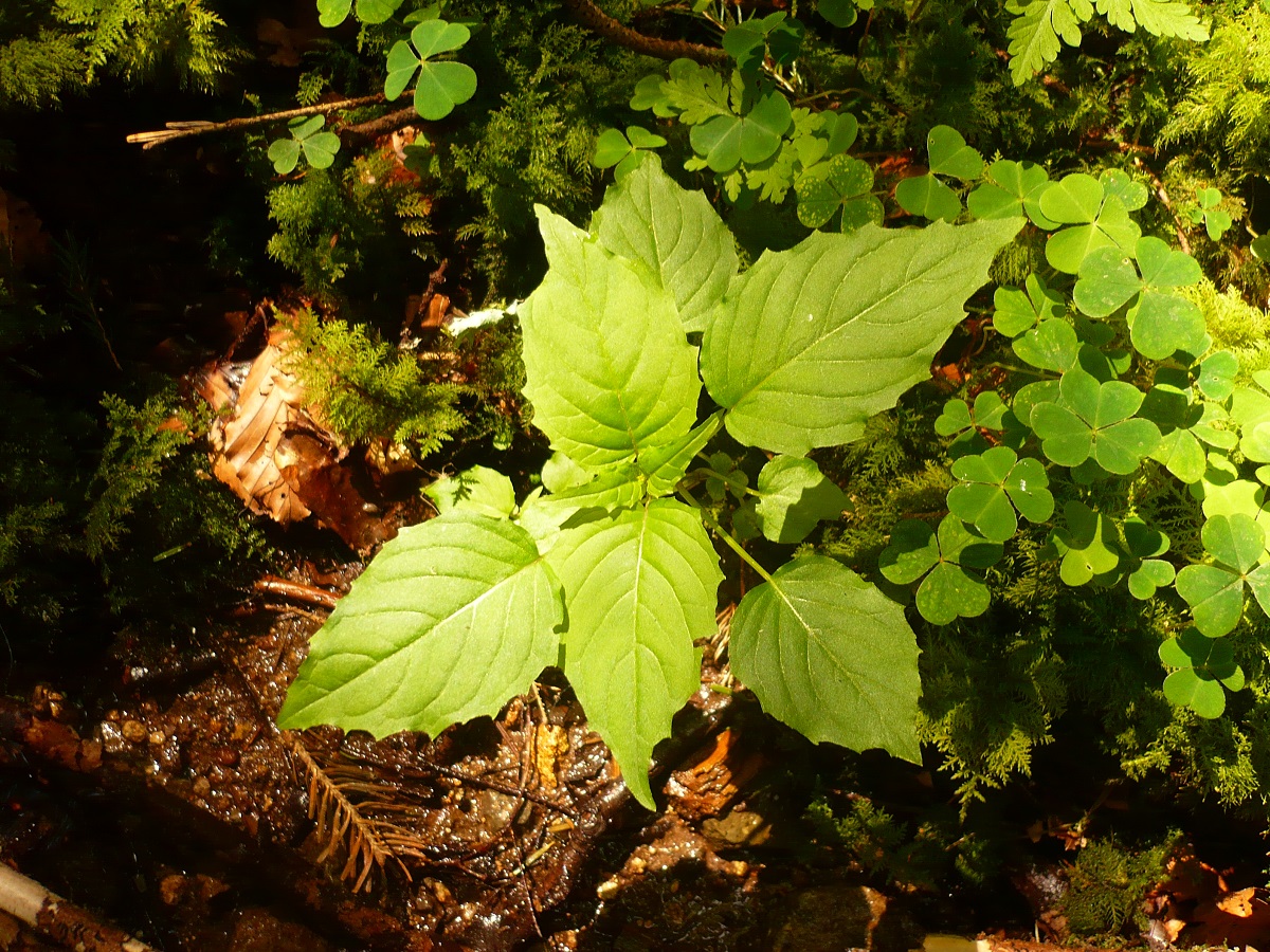 G à rhizome – 2-4 dm – Feuilles opposées ± petites ovales acuminées, peu cordées, dentées, à pétiole un peu velu – Fleurs à 2 pétales L de 2-4 mm blanc rosé – Capsule en poire