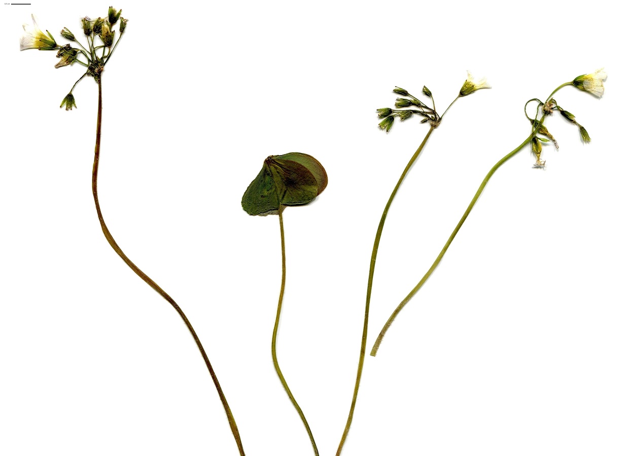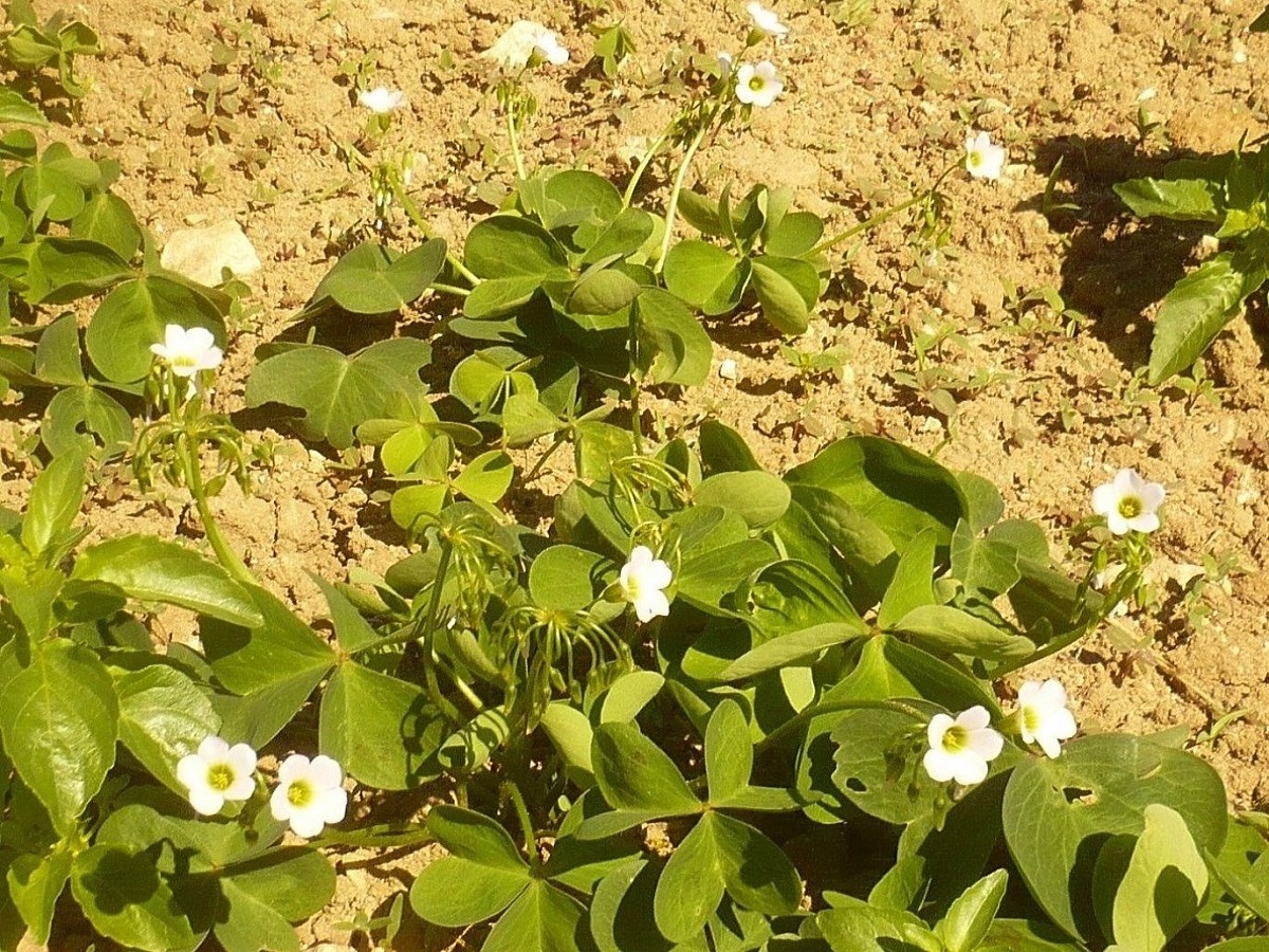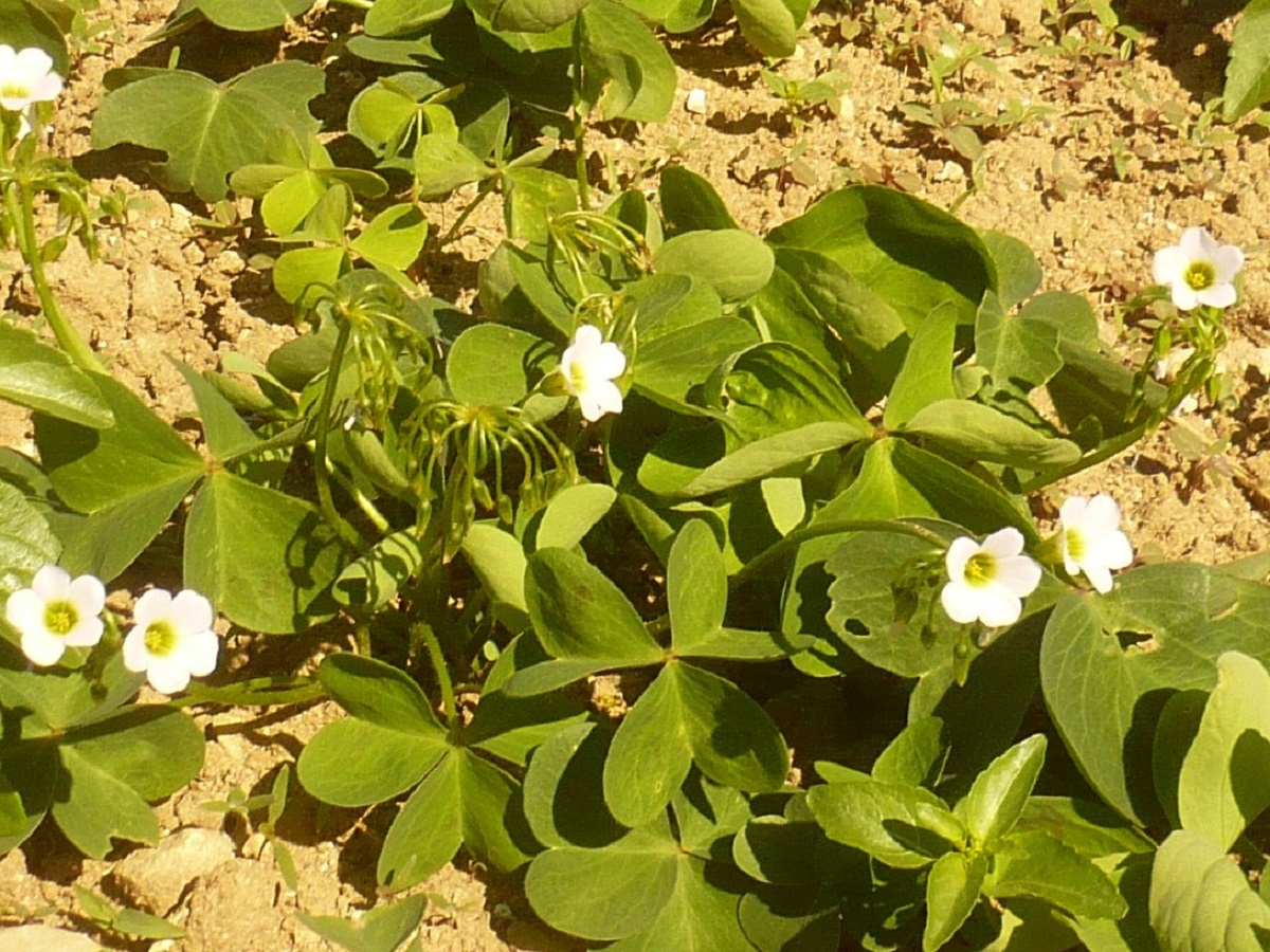G à bulbe – 1-2 dm – Tige faible, feuilles à 3 folioles obcordées à marge orangée dessous (loupe) – Cyme de fleurs de Ø 10-16 mm à 5 pétales blancs ou parfois rosés, larges