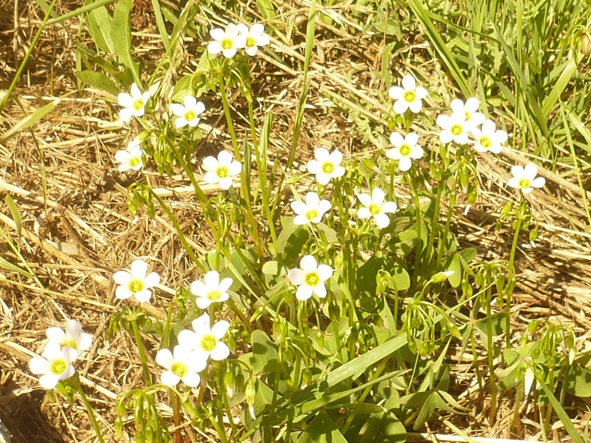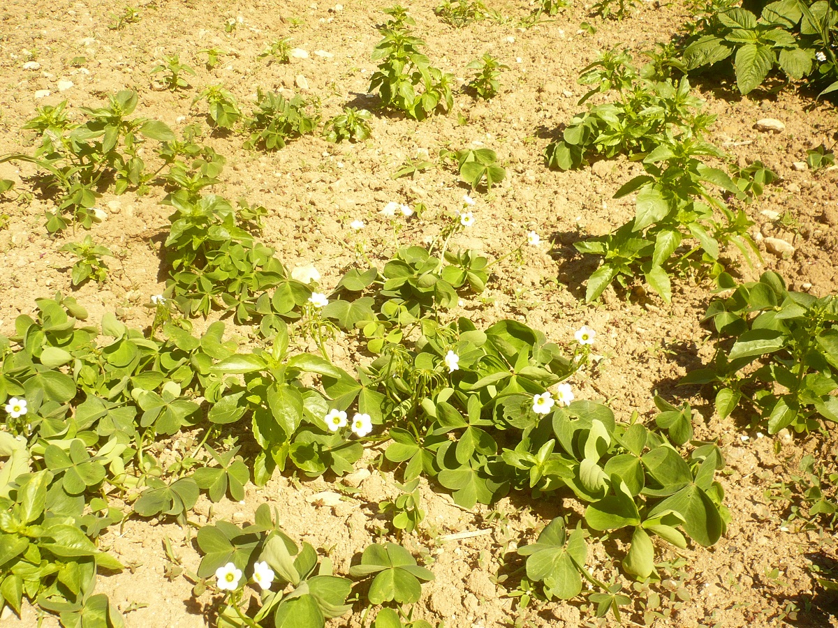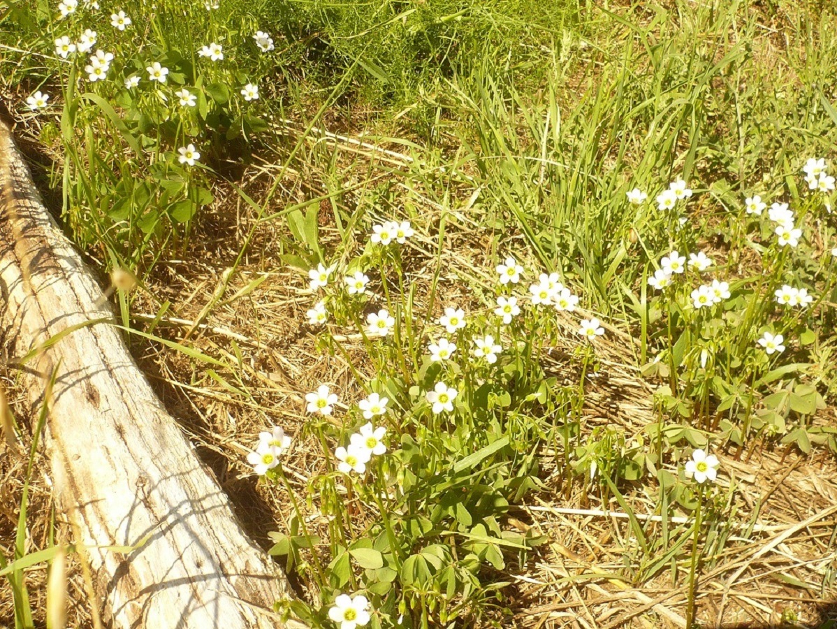 G à bulbe – 1-2 dm – Tige faible, feuilles à 3 folioles obcordées à marge orangée dessous (loupe) – Cyme de fleurs de Ø 10-16 mm à 5 pétales blancs ou parfois rosés, larges