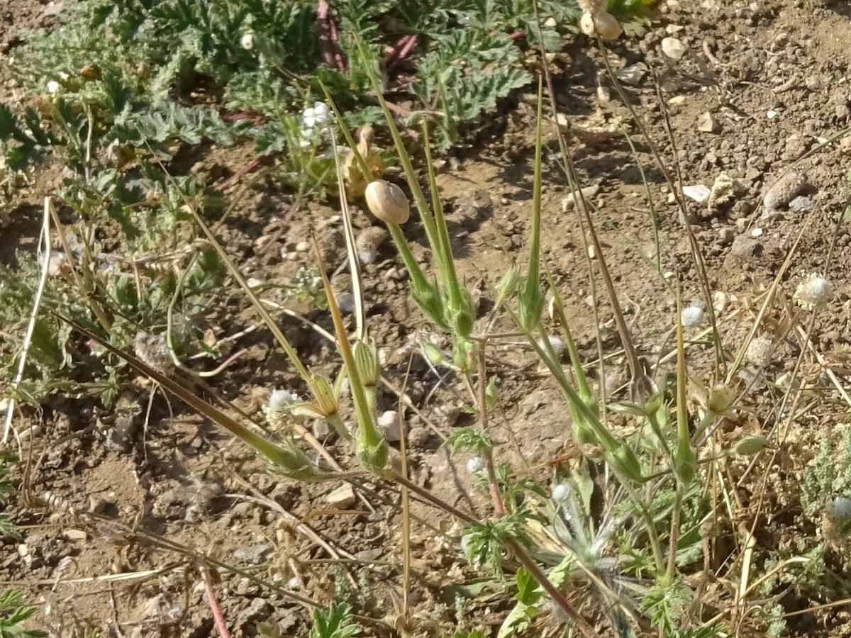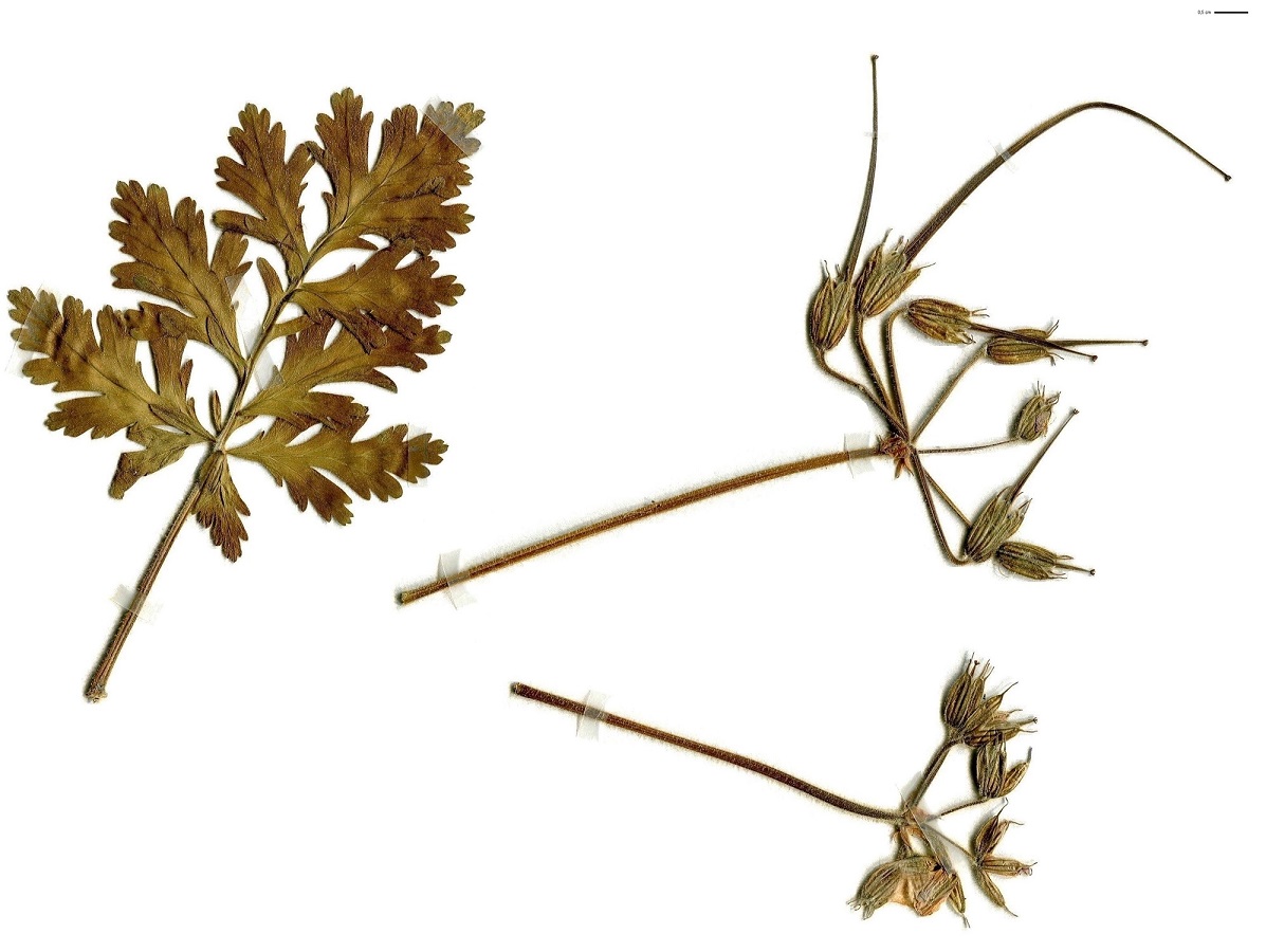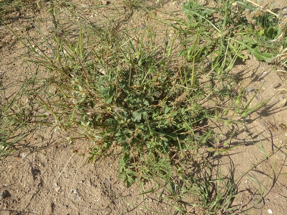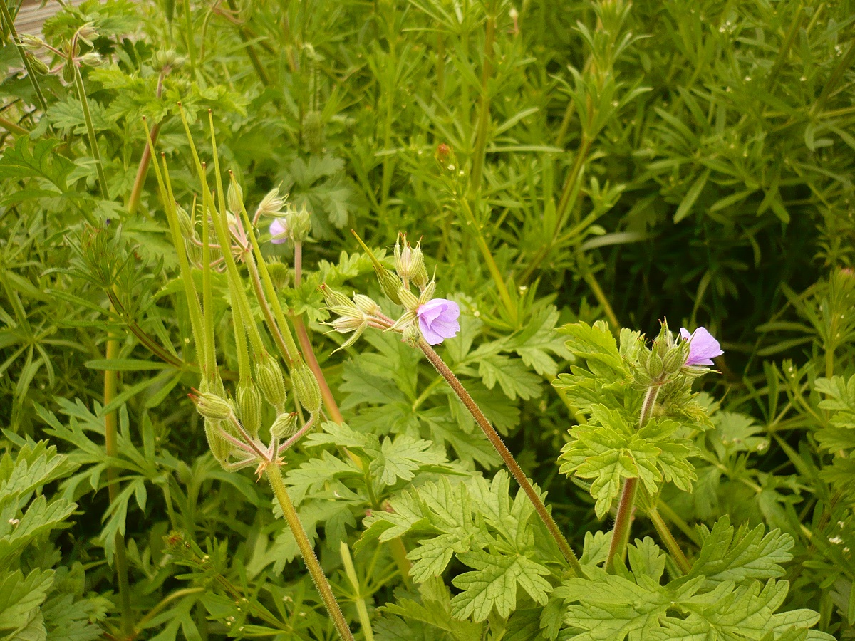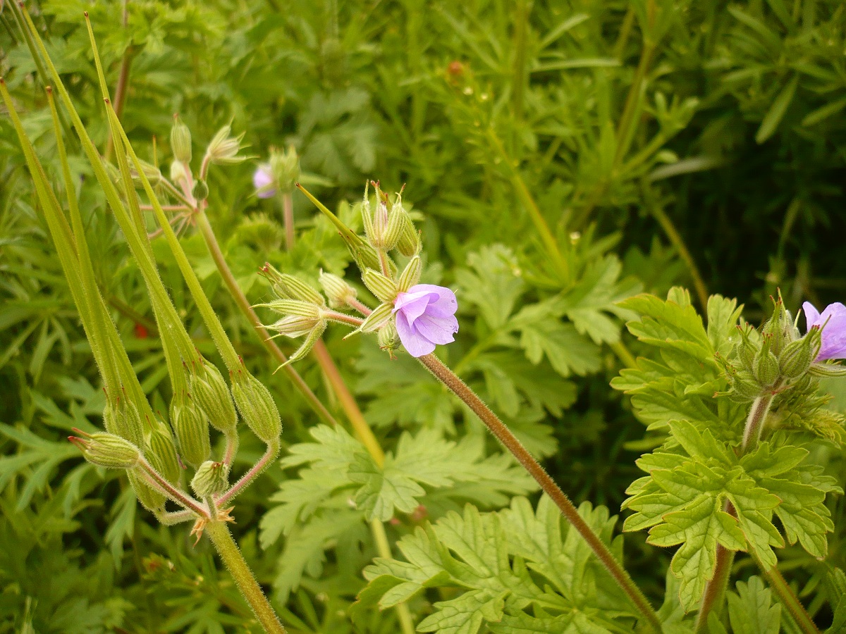 Th – 2-6 dm – Feuilles pennées à segments larges divisés incisés – Ombelle de 3-10 fleurs, à 5 pétales de L ≃ 8 mm bleu violet – Fruit à bec long de 6-10 cm, méricarpes L de 9-11 mm velus