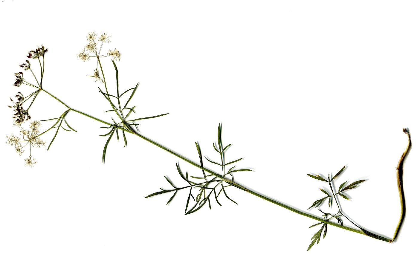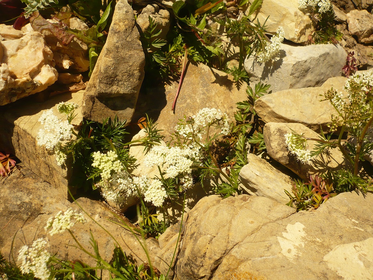 G à tubercule – 3-6 dm – Feuilles > en triangle, découpées en segments fins, à gaine ciliée de L 1-3 cm – 6-12 Rayons, fleurs blanches, bractéoles ~ nulles – Fruit L de 3-4 mm, styles dressés
